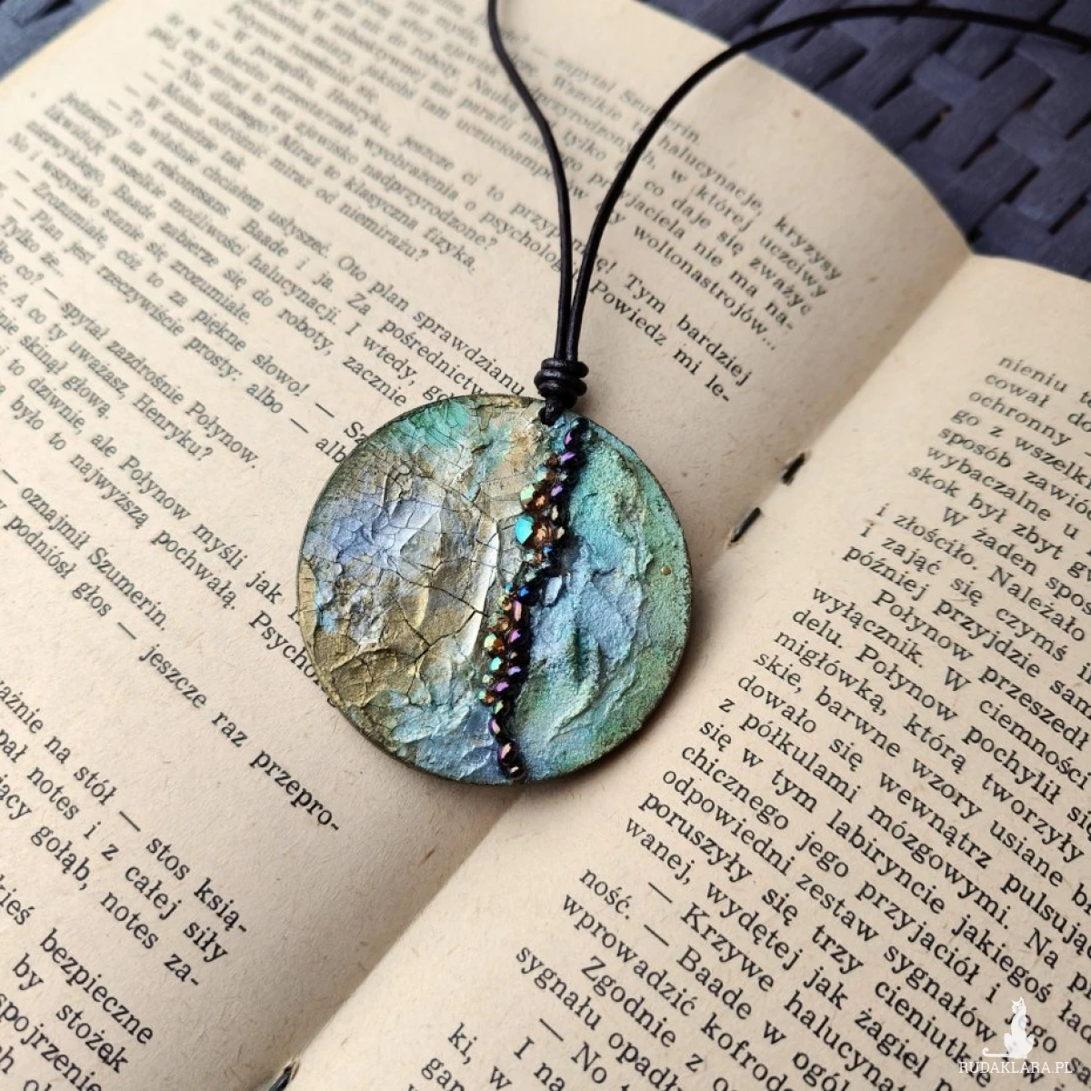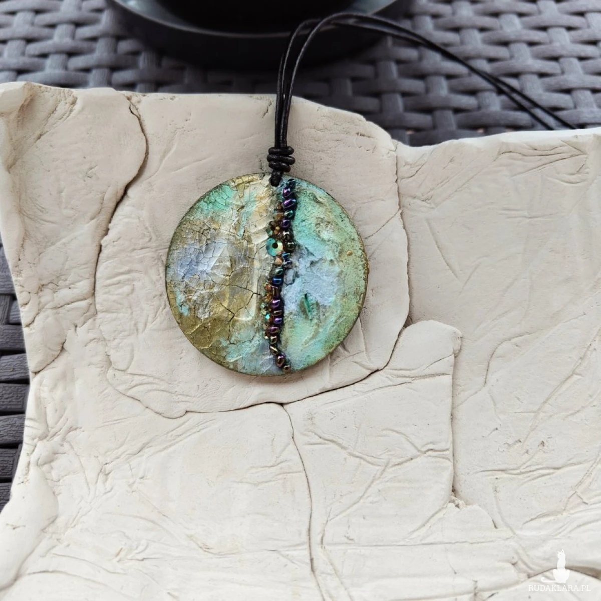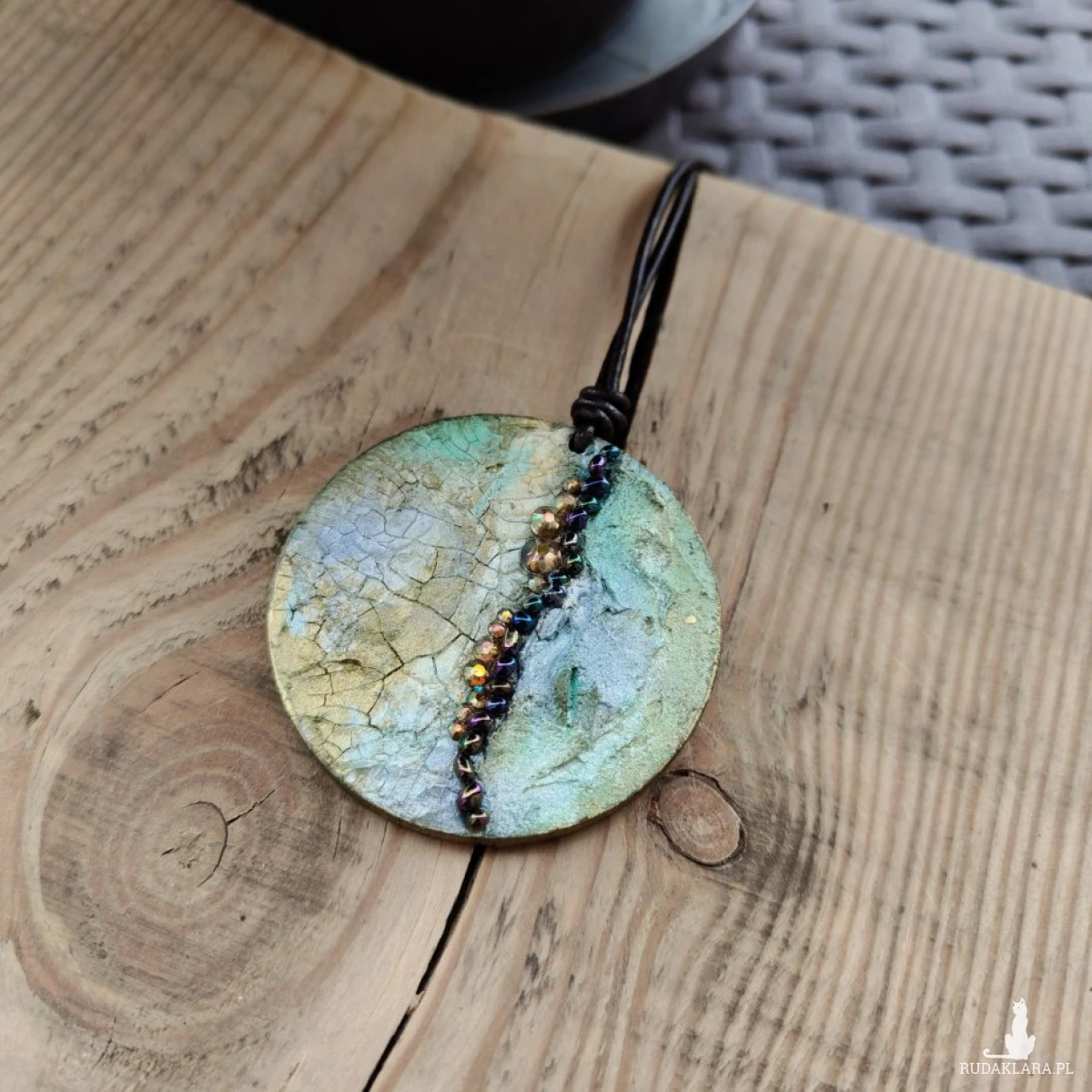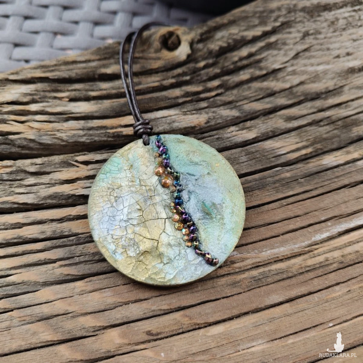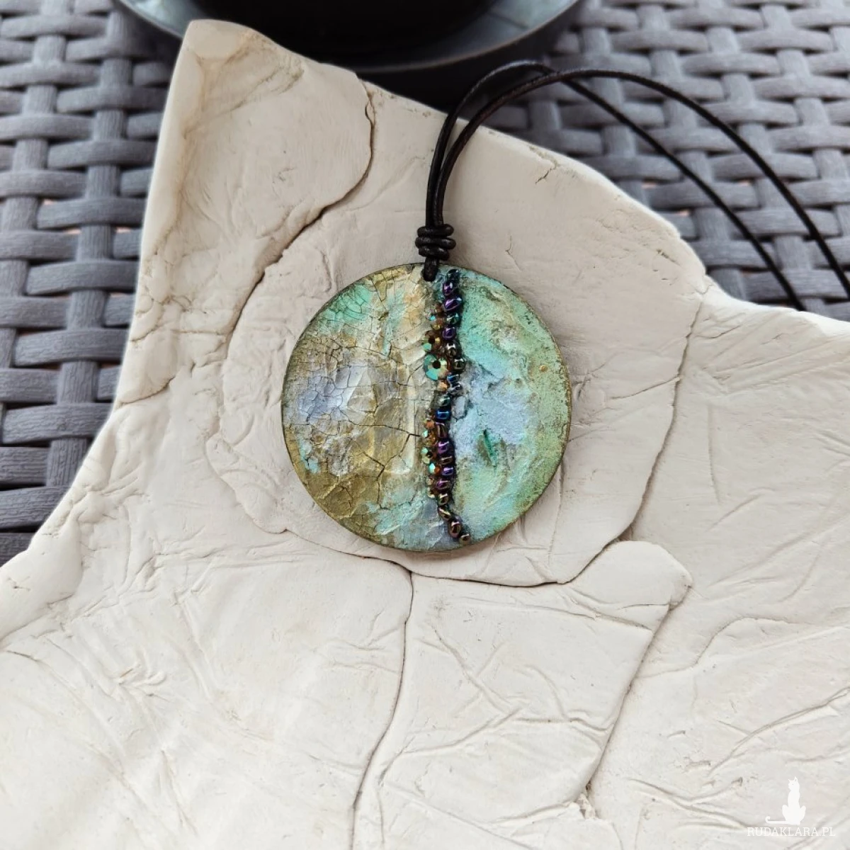 Ten unikatowy wisiorek ręcznie wykonany zachwyca swoją organiczną formą i głęboką symboliką. Okrągła zawieszka w odcieniach patynowanej zieleni, złota i srebrzystych przetarć przypomina spękaną powierzchnię ziemi lub starożytną mapę ukrytą w czasie. Przez środek biegnie wyrazista linia z drobnych, metalicznie połyskujących koralików w odcieniach fioletu, granatu i turkusu, przywodząca na myśl żyłę minerałów lub rzekę życia przebijającą się przez ląd.