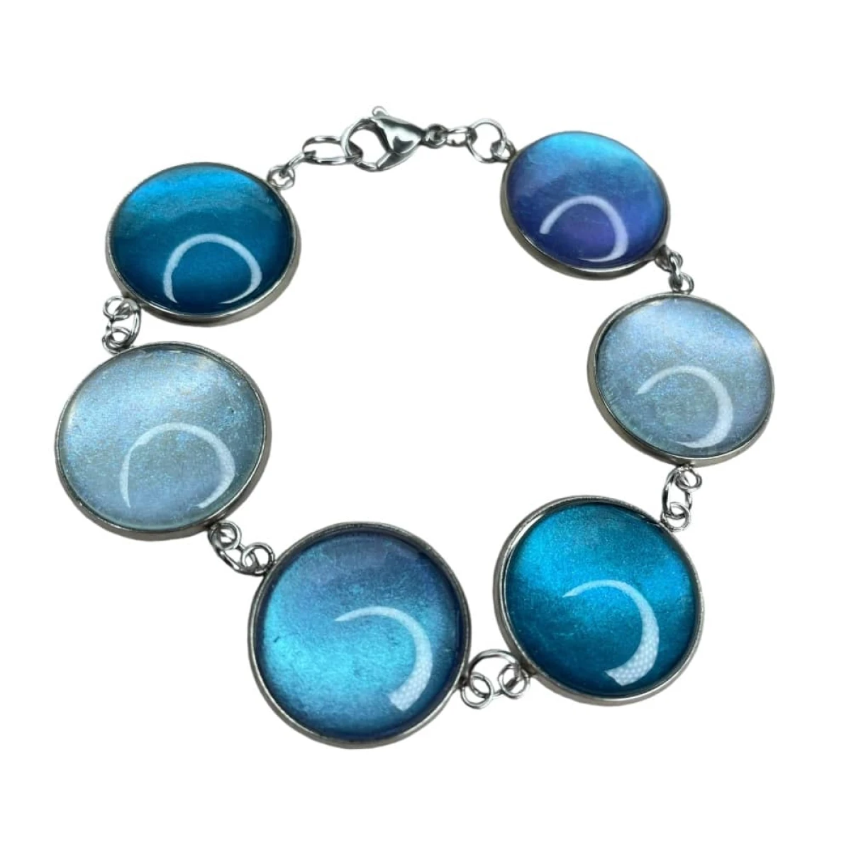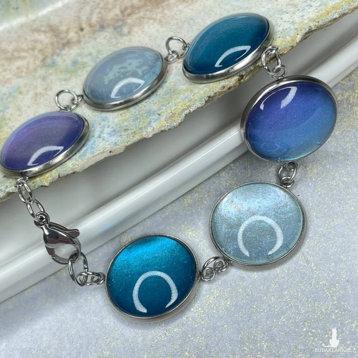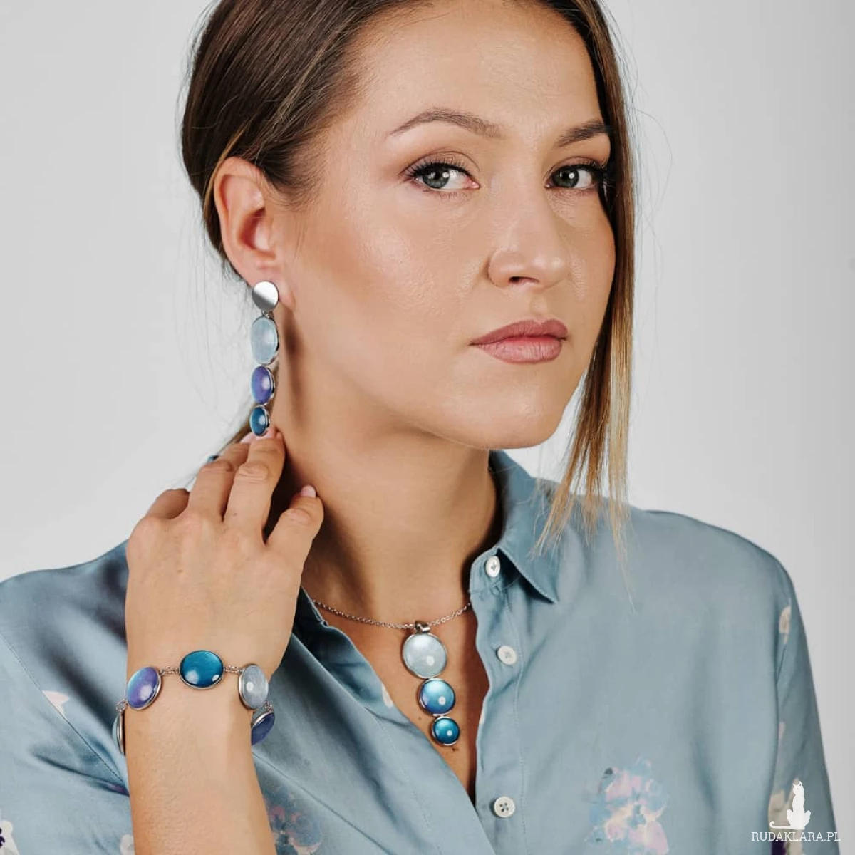Ta pełna blasku bransoletka jest częścią kolekcji “W blasku perłowego księżyca”. Bransoletka wykonana jest z ręcznie malowanych kaboszonów umieszczonych w bazach ze stali szlachetnej. Szklane elementy zachwycają subtelnym, opalizującym blaskiem, który jest niczym odbicie księżyca na tafli wody. Bransoletka mieni się w świetle, przyciągając wzrok i dodając elegancji każdej stylizacji. Ten dodatek jest idealny dla osób ceniących sobie wyrafinowaną i ponadczasową biżuterię. Materiał: stal szlachetna, malowane ręcznie szkło Wykończenie: połysk Długość bransoletki: ok 20 cm Średnica kaboszonu: 18 mm Waga bransoletki: ok 14,5 g SKU: e32/m31 Jak dobierać komplety? Kolory na zdjęciach mogą się różnić ze względów technicznych. Aby dobrać identyczny odcień, zwróć uwagę na numer SKU produktu. Pierwsza część to numer modelu, a numery po “/” to kolor, np. /17 oznacza morski perłowy. Produkty z tym samym SKU po "/" mają identyczny kolor. Dzięki temu możesz łatwo tworzyć komplety, mając pewność, że biżuteria jest w tym samym odcieniu. Stwórz własny komplet! Jeśli nie ma biżuterii w wybranym modelu lub kolorze którego szukasz, możesz ją zamówić indywidualnie. Wyślij do nas maila z nazwą, numerem modelu i kolorem, a my w miarę możliwości wykonamy biżuterię na zamówienie. Termin realizacji ustalamy indywidualnie. Biżuteria zostanie elegancko zapakowana. W przypadku zakupu kompletu, biżuteria zostanie zapakowana razem. Kolory na zdjęciach mogą delikatnie różnić się od rzeczywistych.