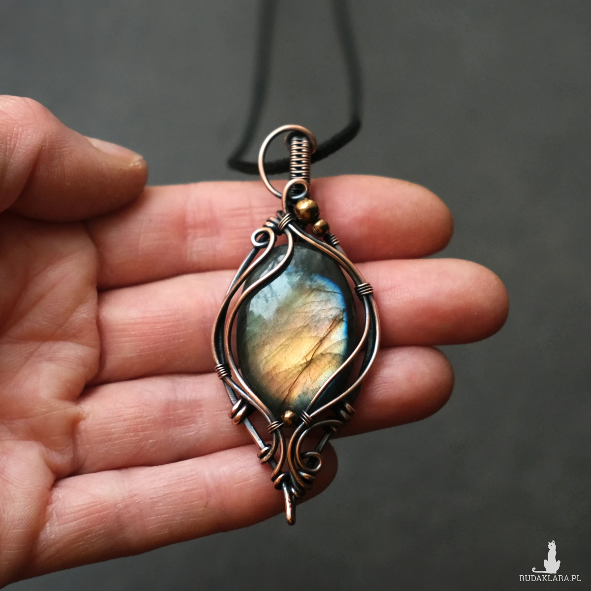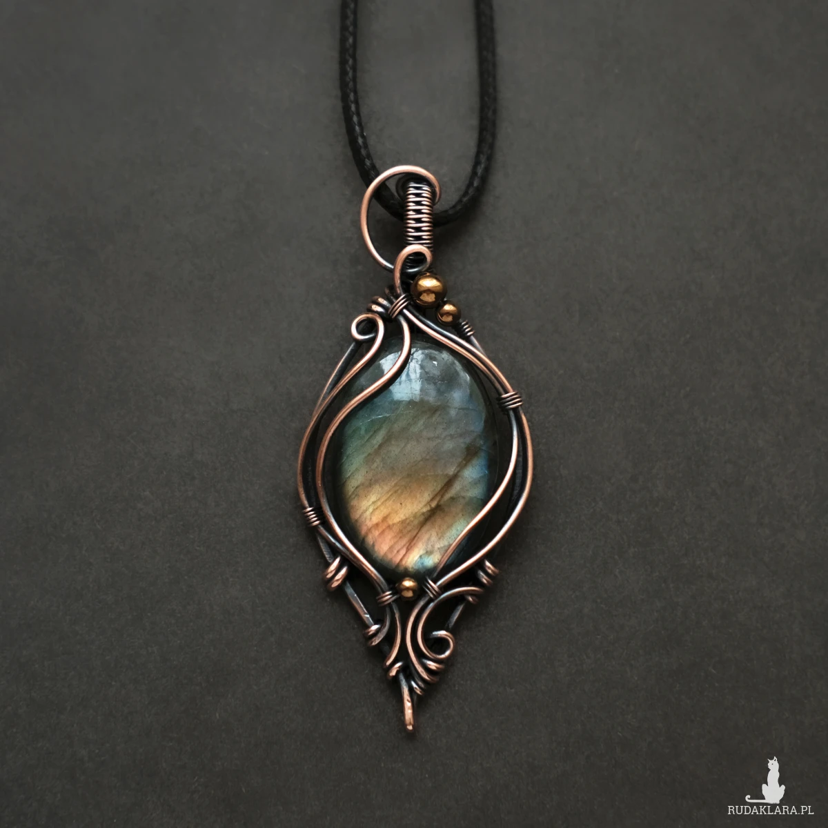 Piękny miedziany wisior w elfickim stylu z kamieniem labradorytu oraz koralikami hematytu. Labradoryt to wyjątkowy kamień, który kochają kobiety. Użyty w oprawie kamień iryzuje w kolorach brzoskwini, błękitu i zieleni.