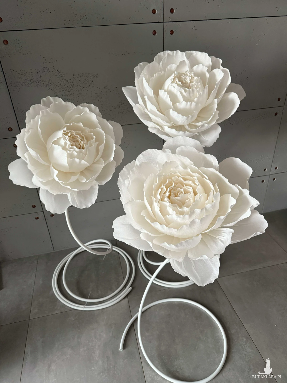 Piwonie z krepiny w kolorze białym, łodygi białe. Na życzenie możemy wykonać kwiaty również w innych kolorach. Kwiaty realizowane na zamówienie - termin do ustalenia. Średnica jednego kwiatka ok. 55 cm, wysokość ok. 130 cm (możliwość ustalenia innych wysokości). Idealne do dekoracji podczas komunii świętej, chrzcin, wesel czy urodzin.