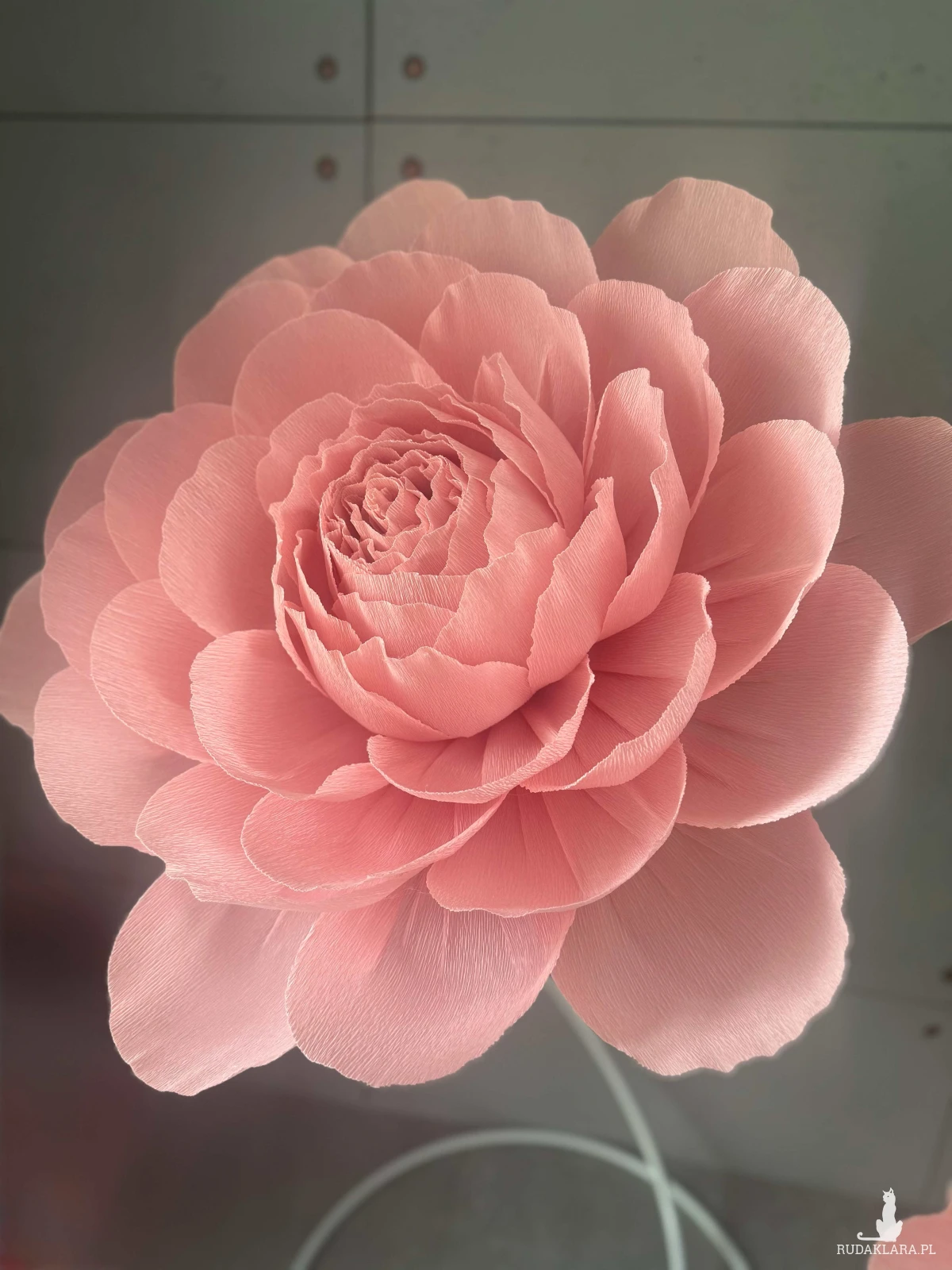 Piwonia z krepiny w kolorze pudrowego różu, łodyga białe zakręcona. Na życzenie możemy wykonać kwiaty również w innych kolorach. Kwiaty realizowane na zamówienie - termin do ustalenia. Średnica jednego kwiatka ok. 55 cm, wysokość ok. 130 cm (możliwość ustalenia innych wysokości). Idealne do dekoracji podczas komunii świętej, chrzcin, wesel czy urodzin.