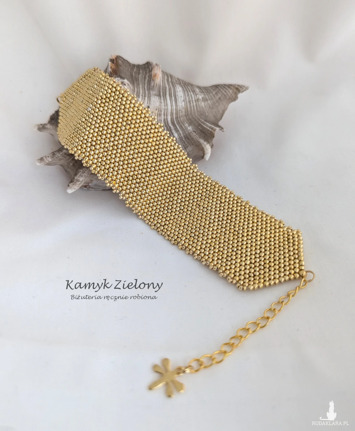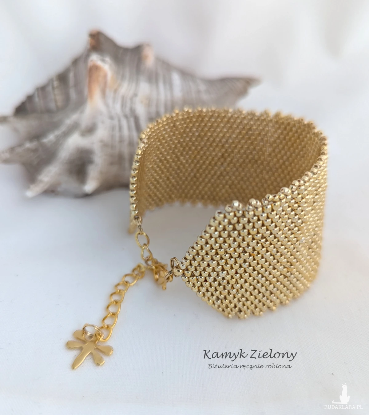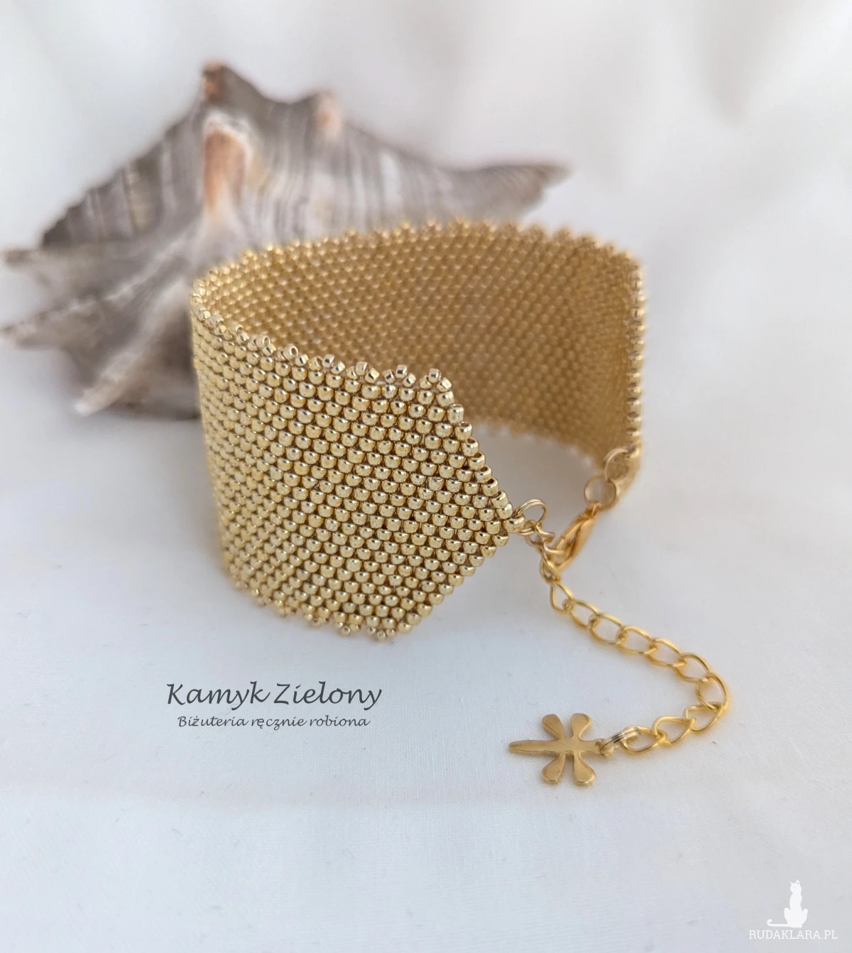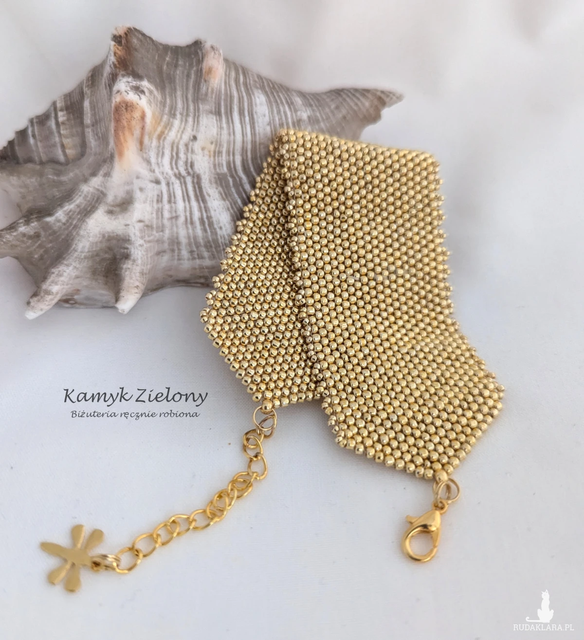 Bransoletka uszyta ręcznie z koralików Toho w pięknym złotym odcieniu - Starlight. Do jej wykonania użyto najwyższej jakości szklanych koralików, w przypadku których warstwa złotego koloru została naniesiona metodą galwanizowania - dzięki temu kolor jest bardzo trwały, nie ściera się ani nie ciemnieje podczas użytkowania biżuterii.