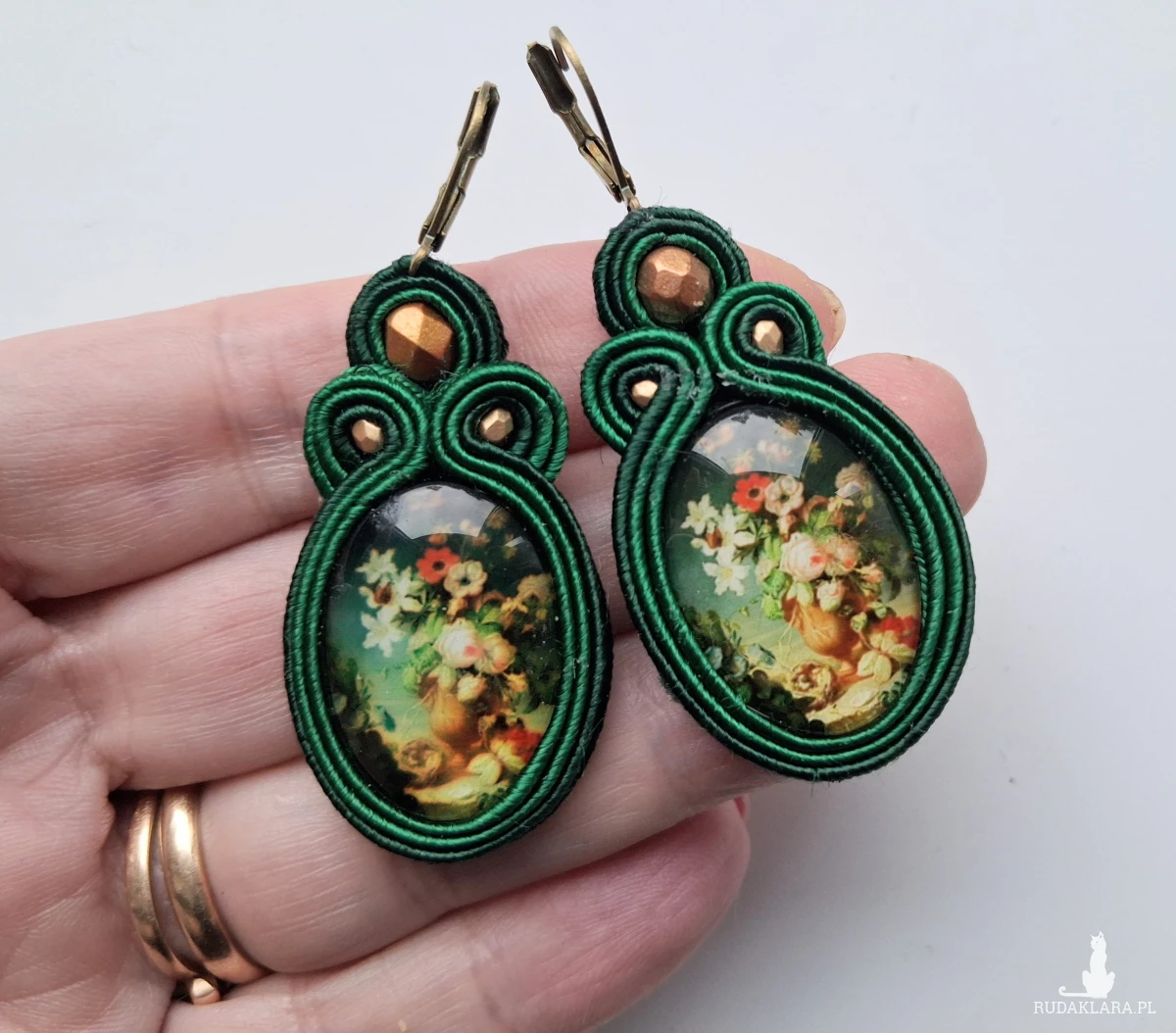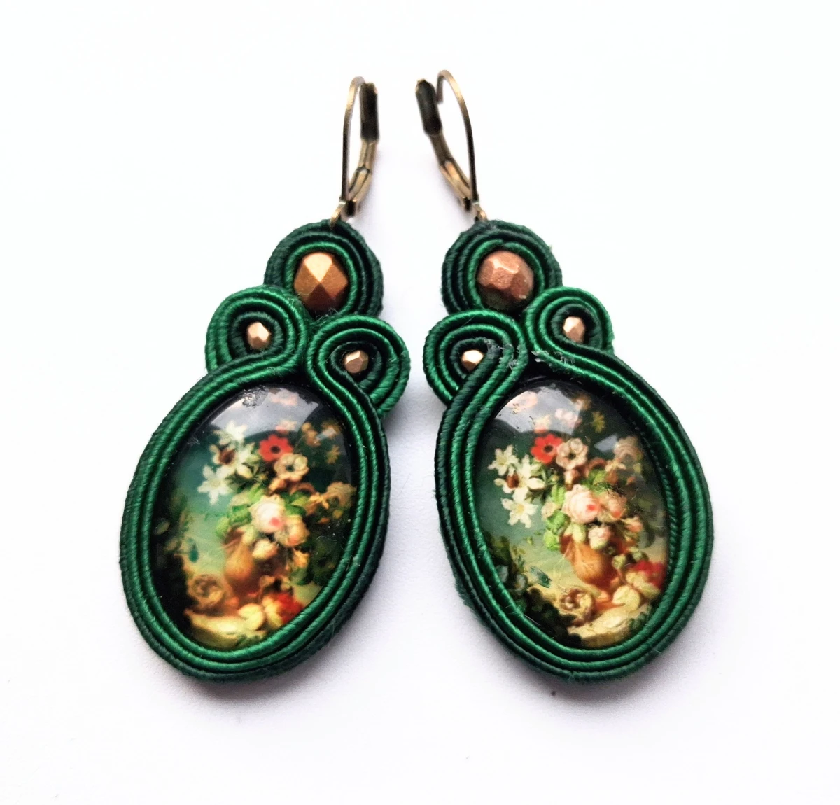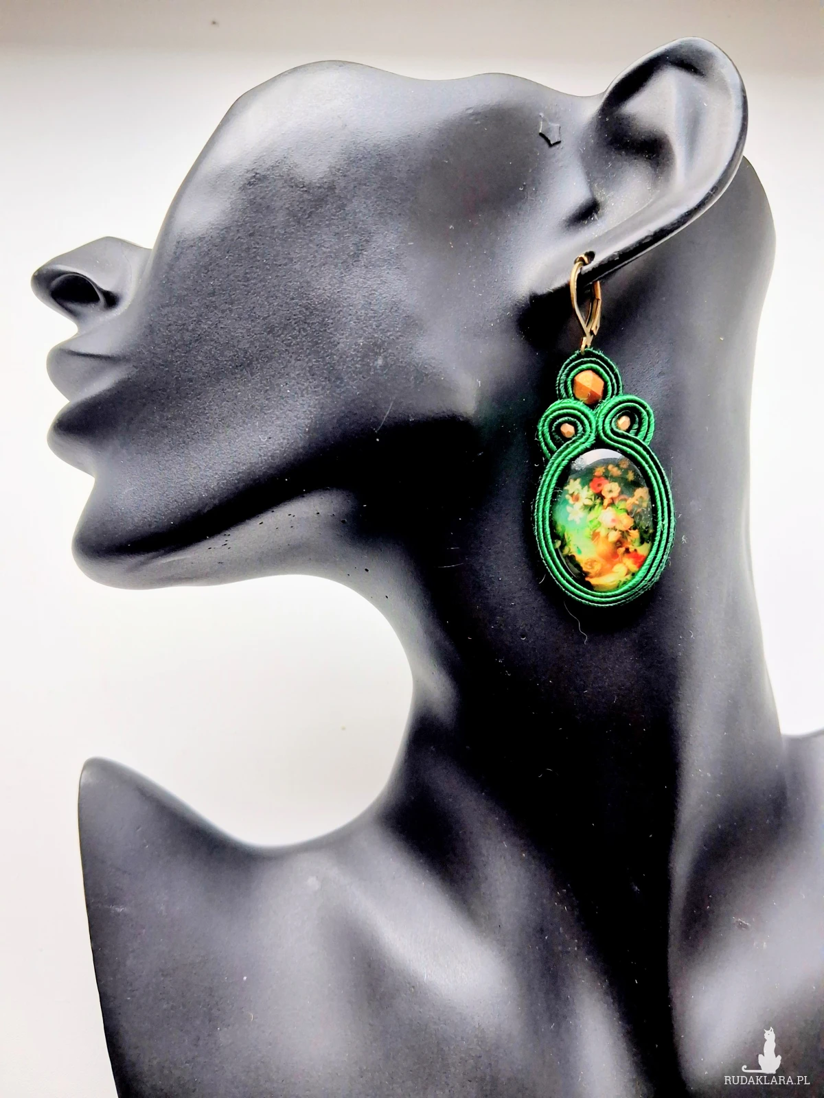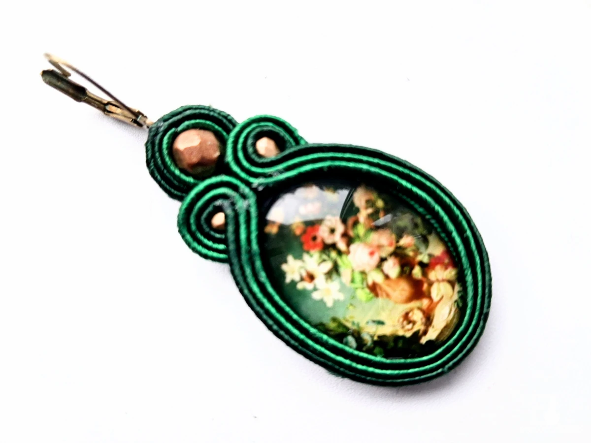 Materiał: sutasz,  szklany kaboszon z printem, koraliki Fire Polish