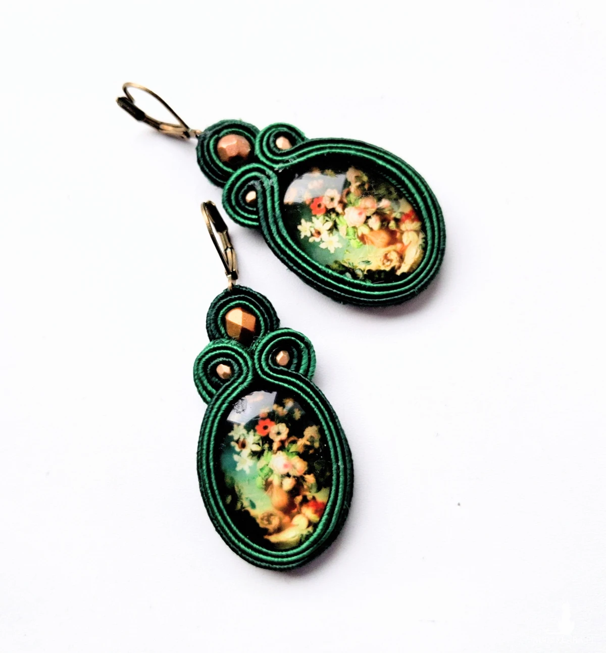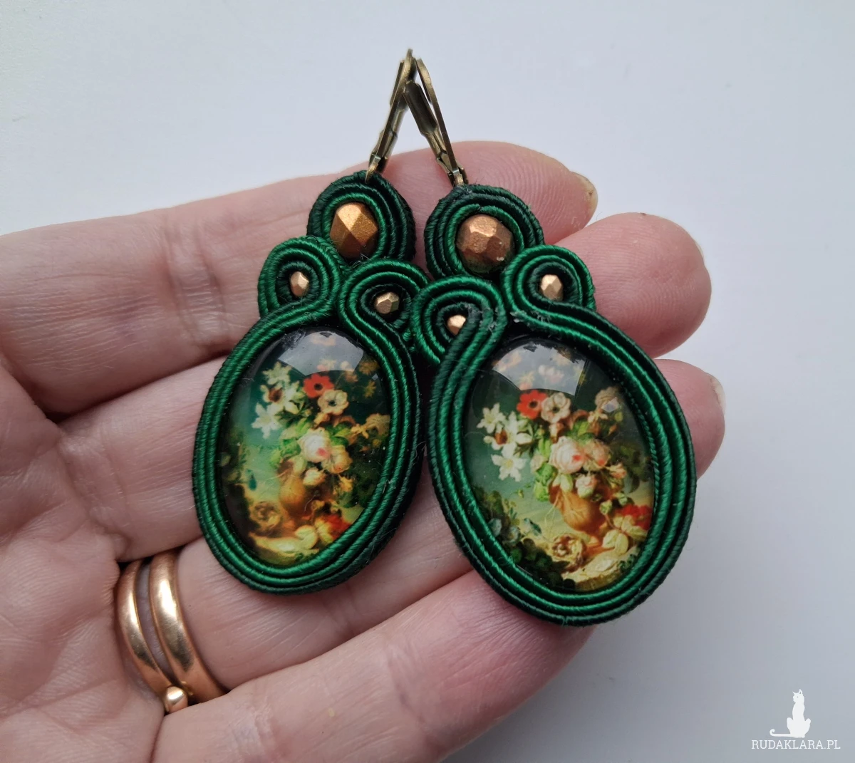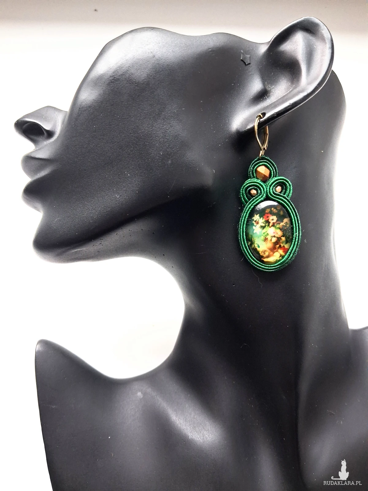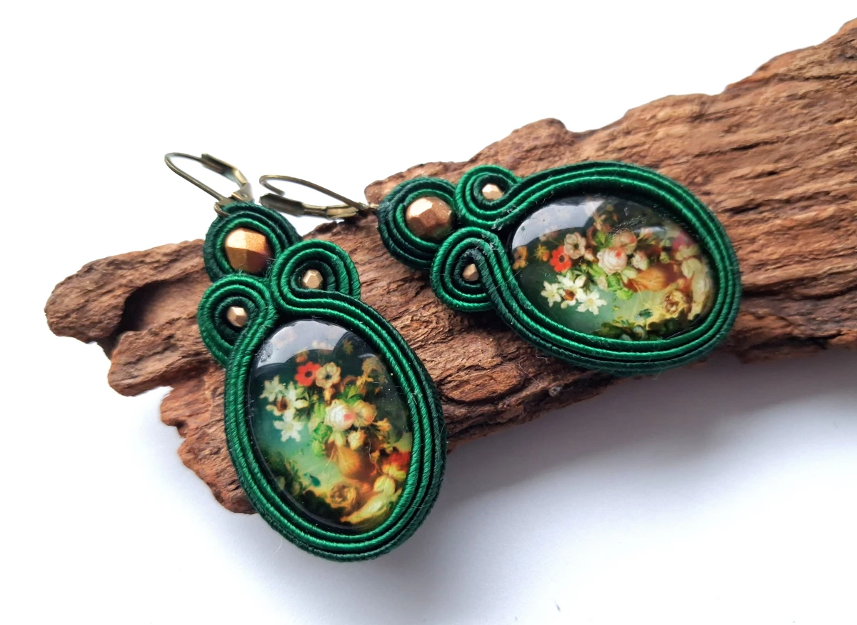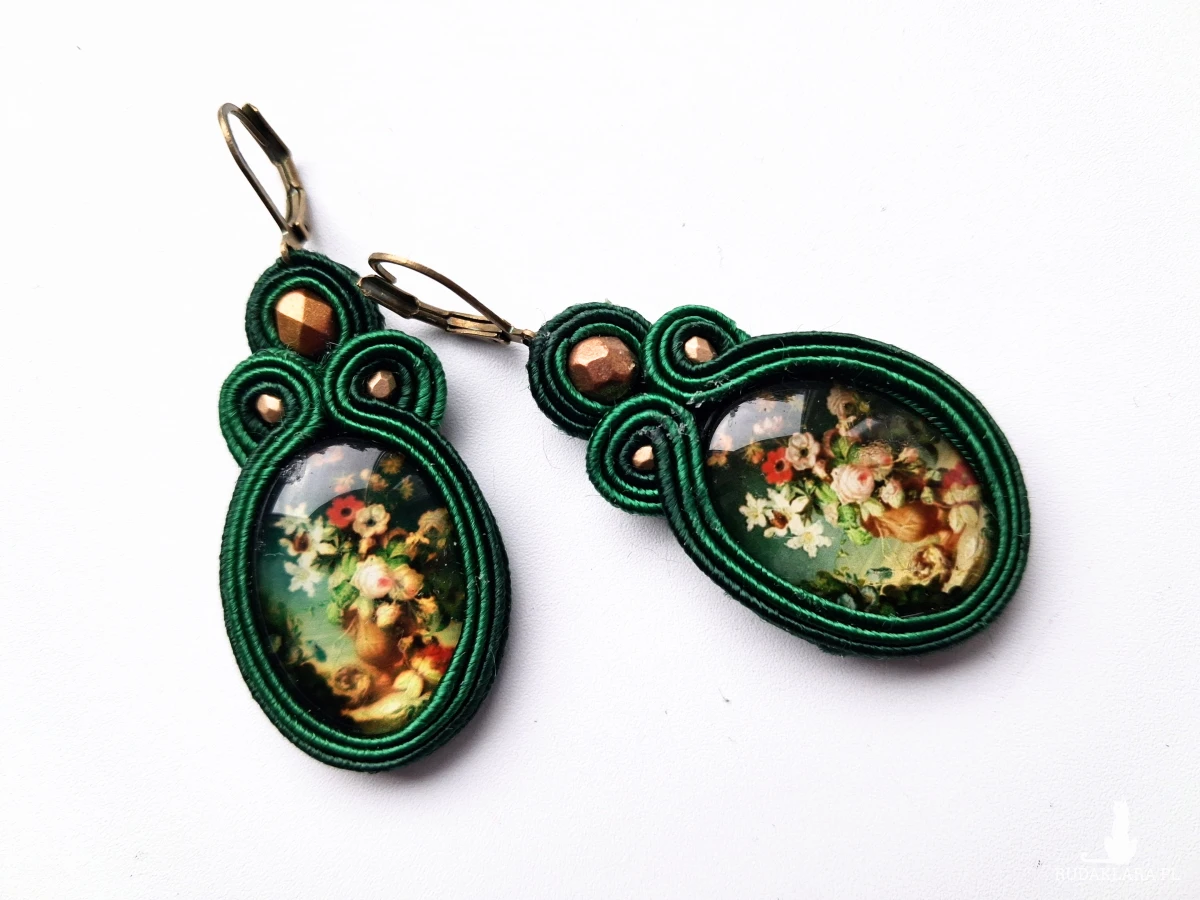 Materiał: sutasz,  szklany kaboszon z printem, koraliki Fire Polish