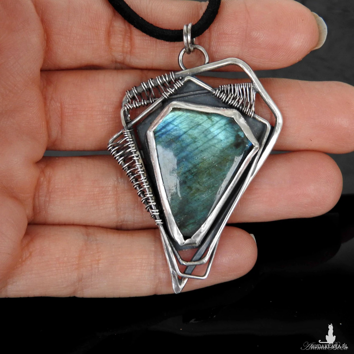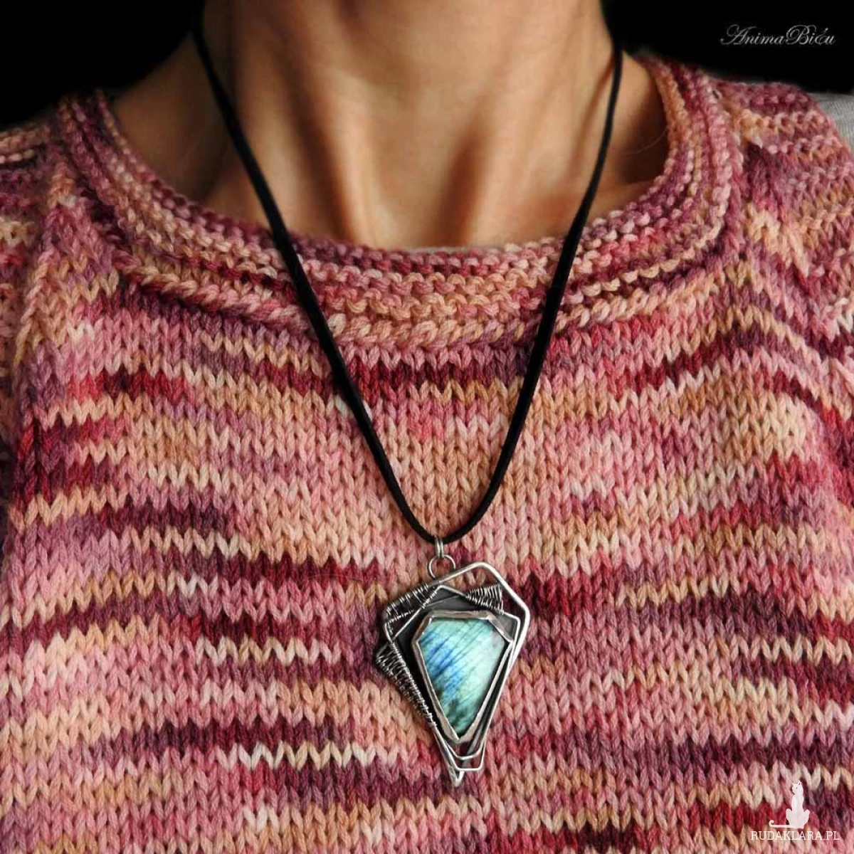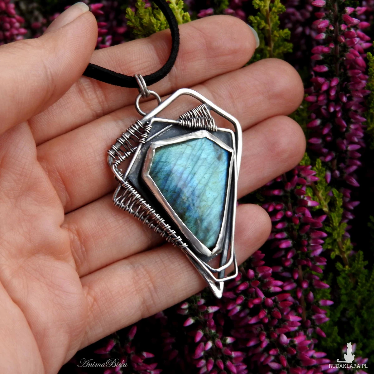 ręcznie ze srebra próby 925 i 999. Jego sercem jest madagaskarski labradoryt o