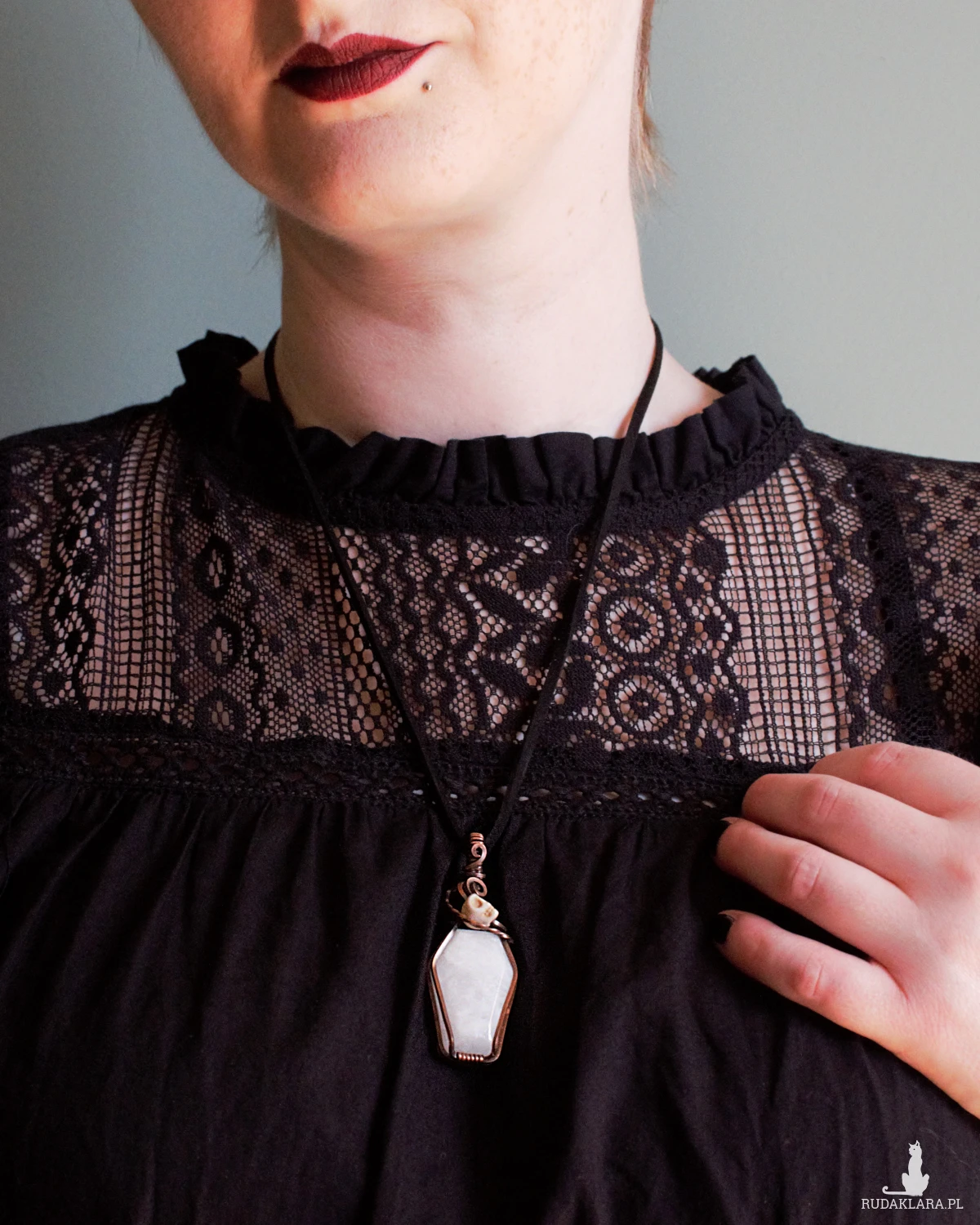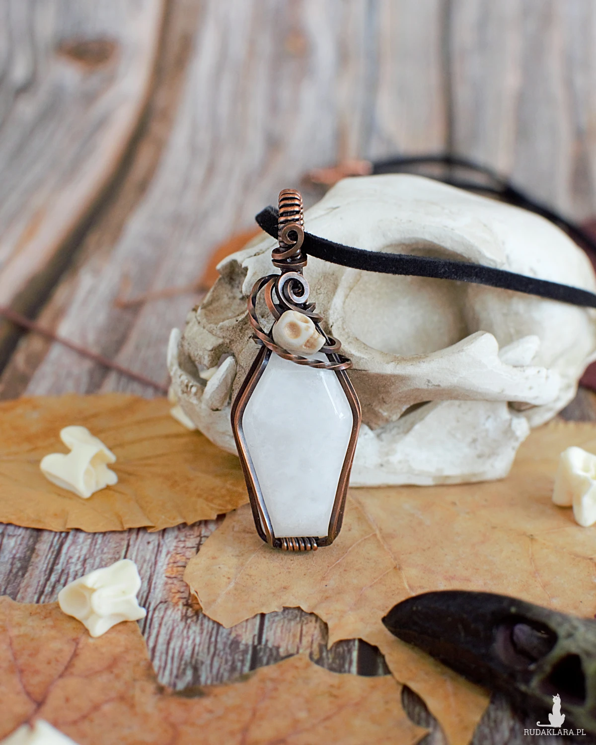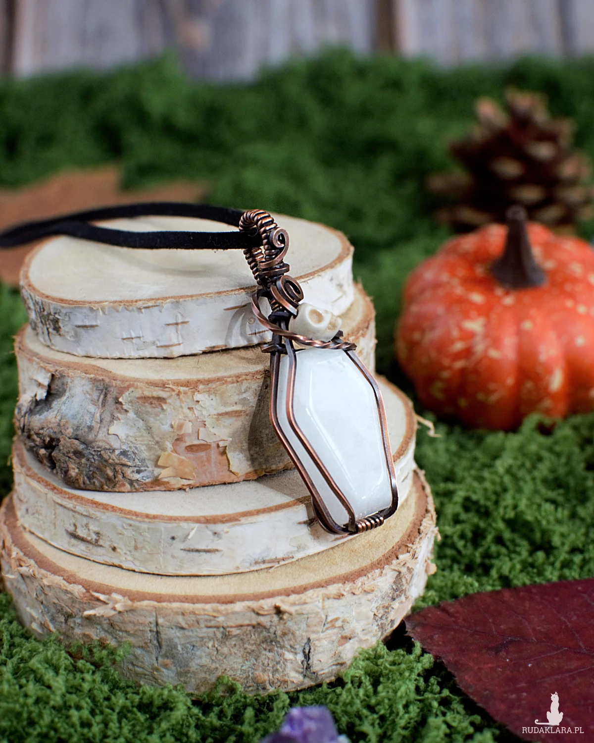 Piękny okaz kwarcu mlecznego, szlifowany na kształt trumny został oprawiony w naturalną miedź a mrocznego charakteru całości dodaje malutki howlit rzeźbiony na kształt czaszki :)