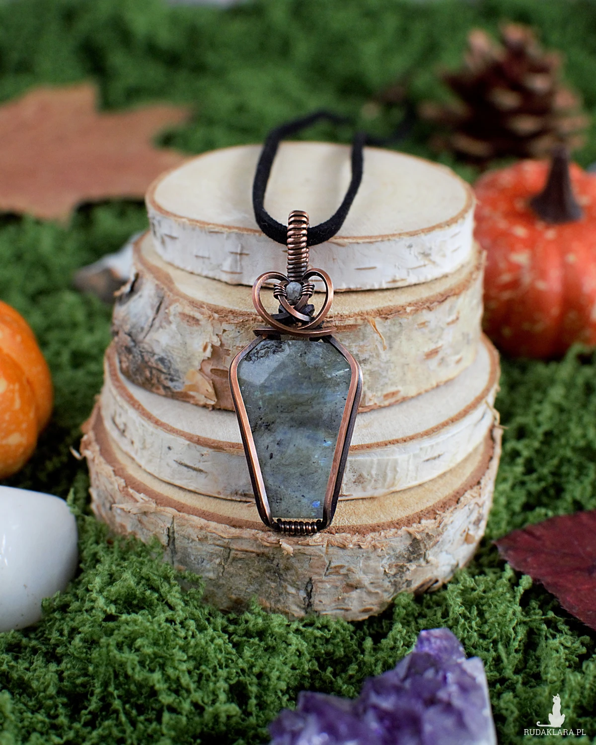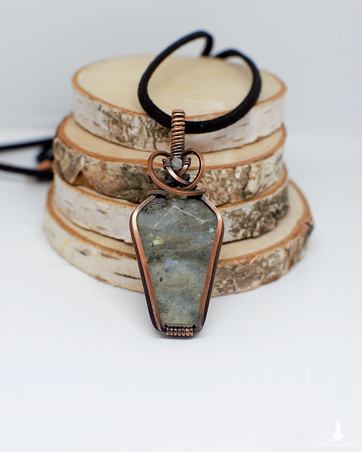 Wyjątkowy okaz labradorytu z subtelnym przebłyskiem, szlifowany na kształt trumny został oprawiony w naturalną miedź i wzbogacony dodatkiem malutkiego fasetowanego labradorytu, przepięknie łapiącego światło.