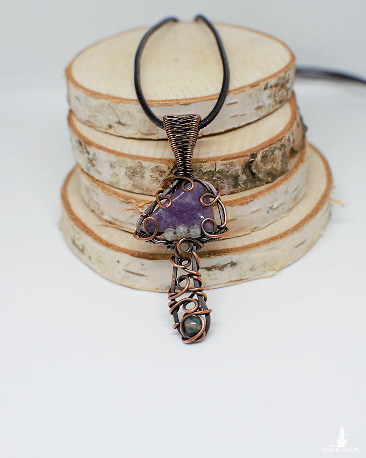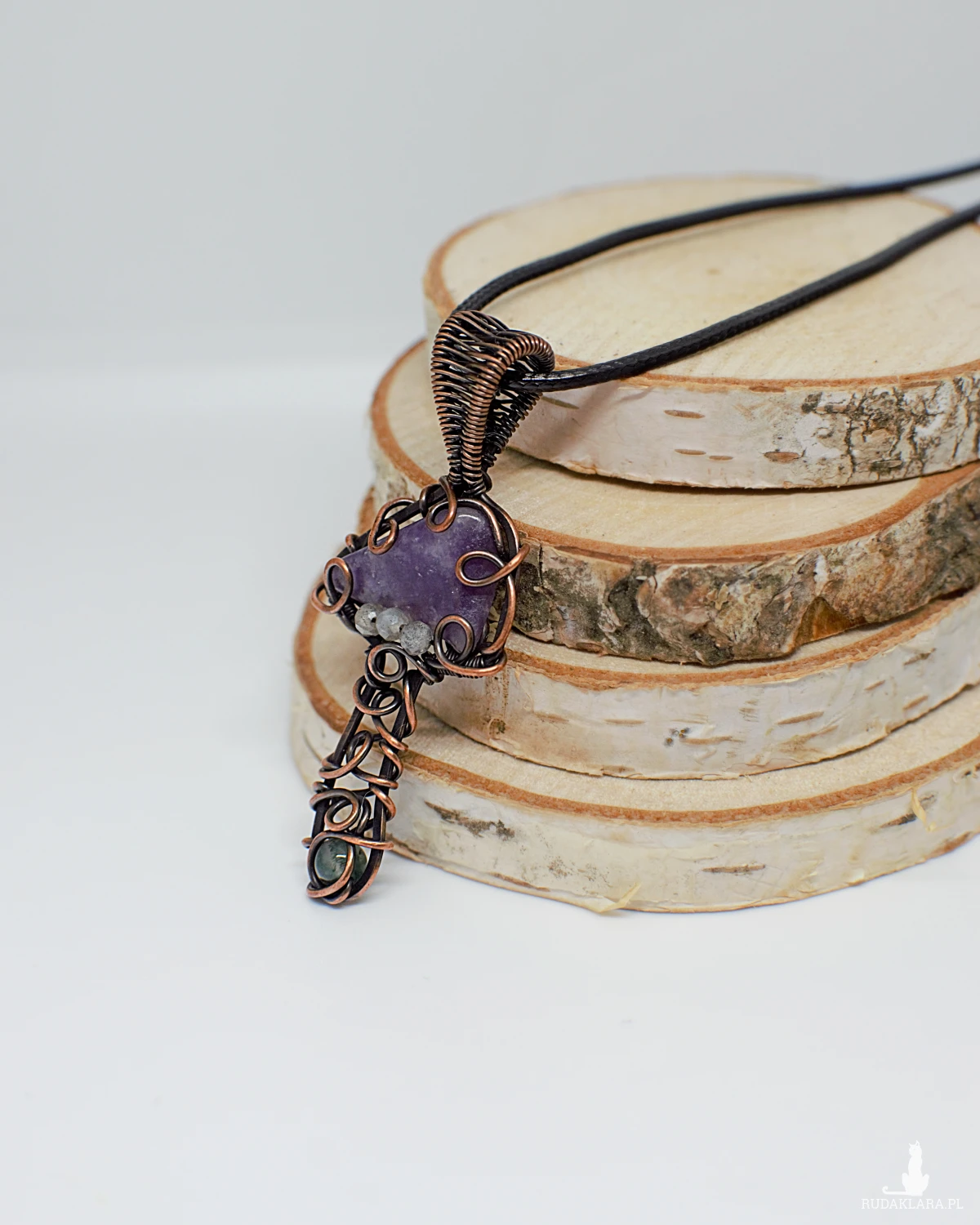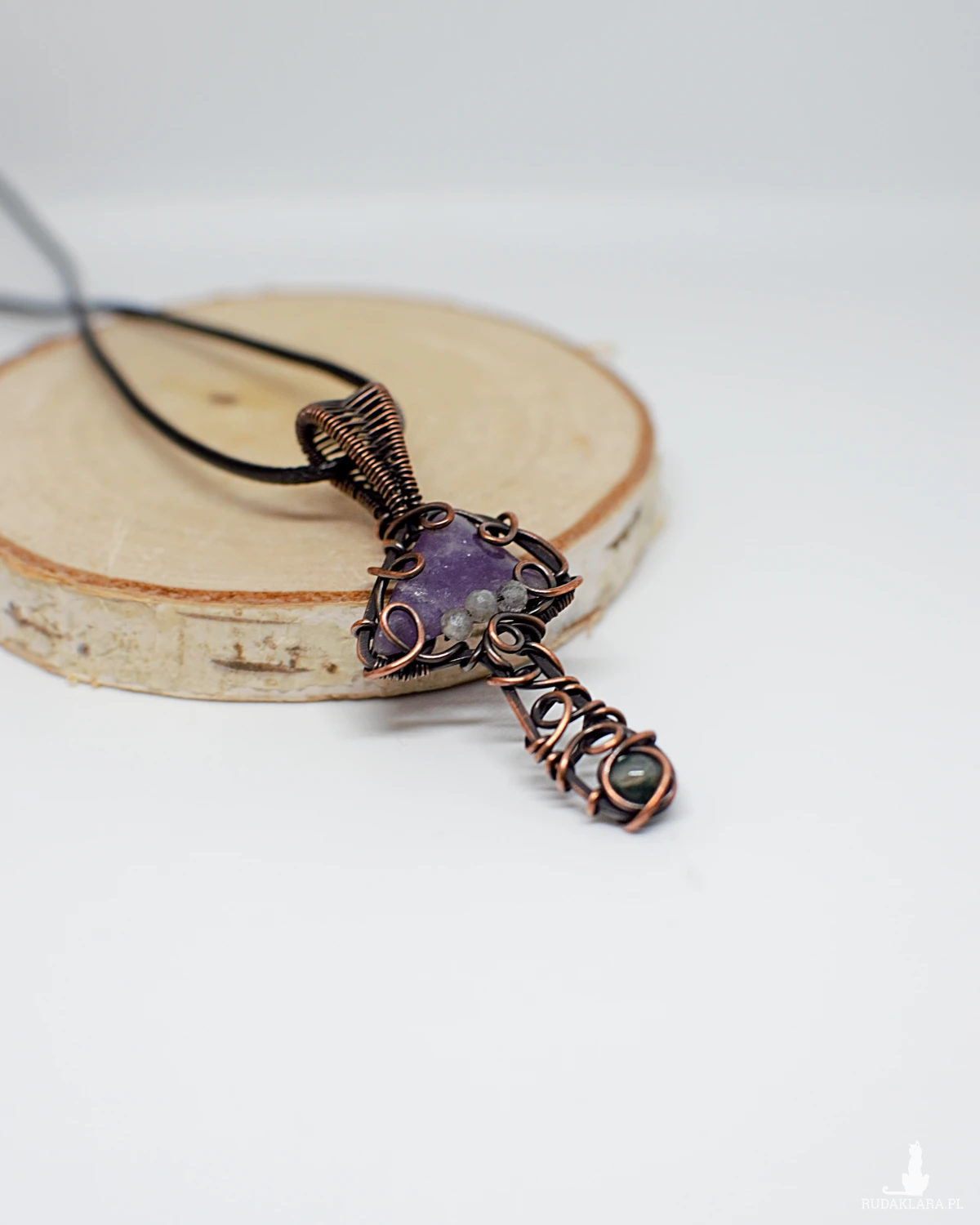 Przepiękny wisior ręcznie wykonany z użyciem ametystu, labradorytu, agatu mszystego i naturalnej miedzi.
