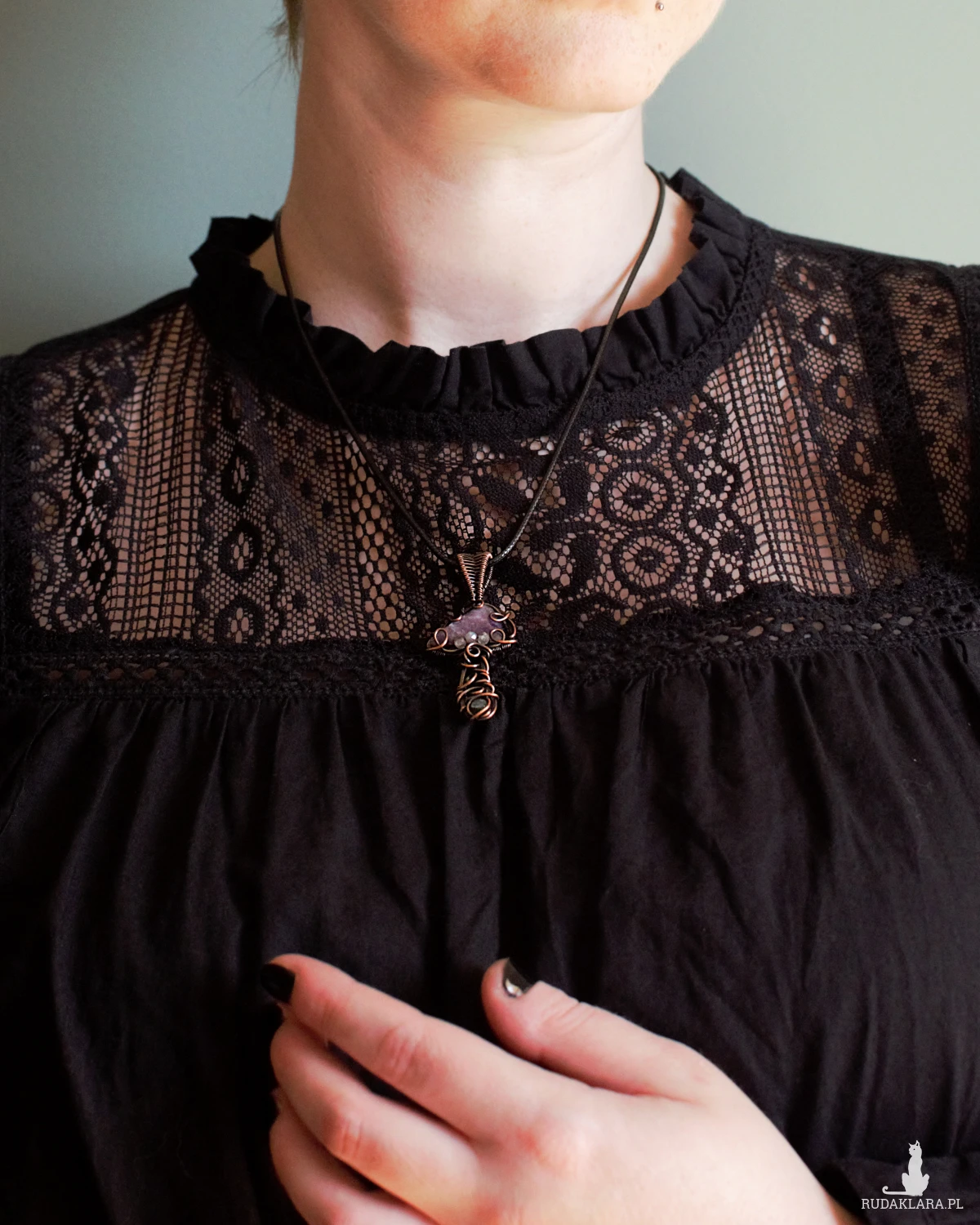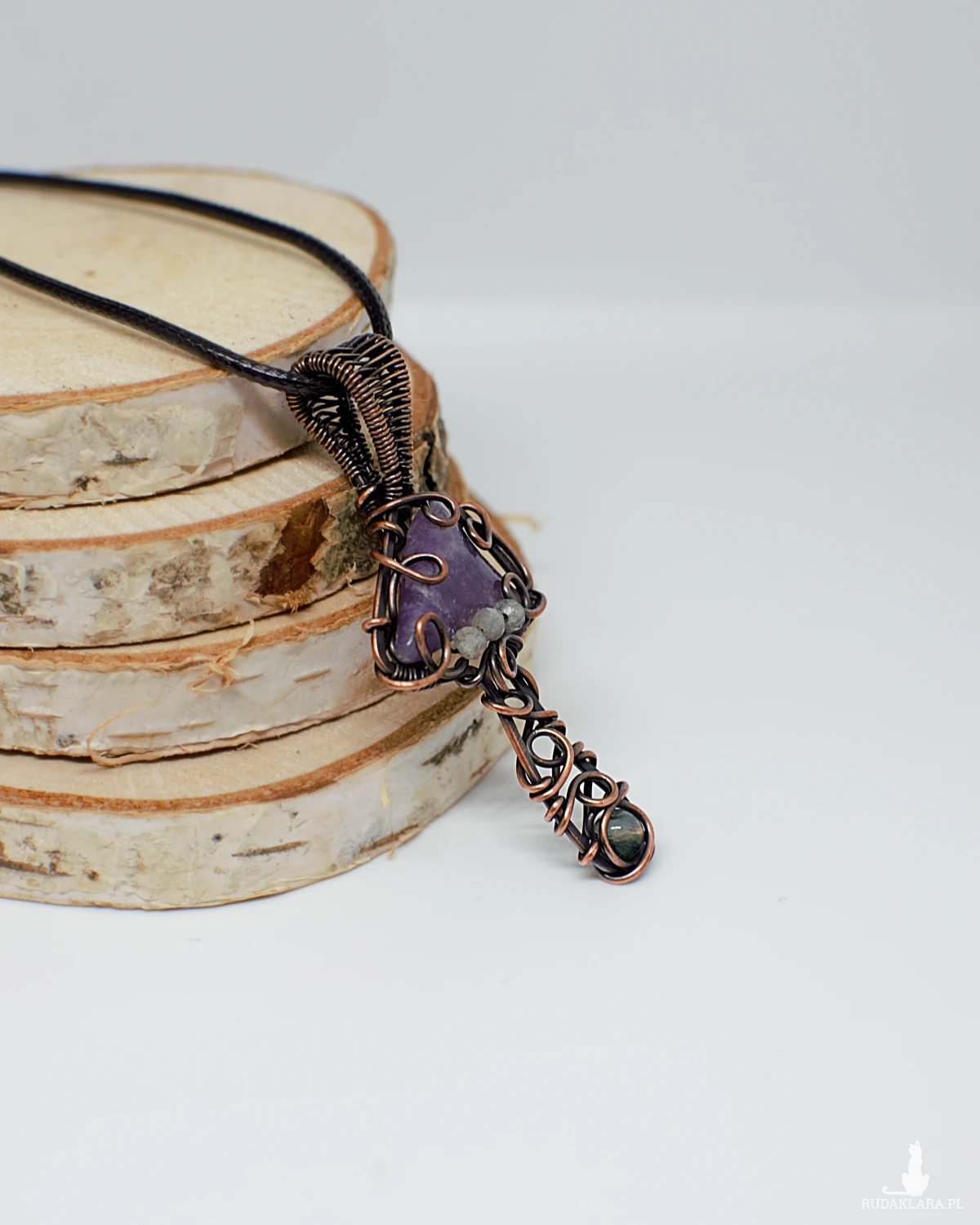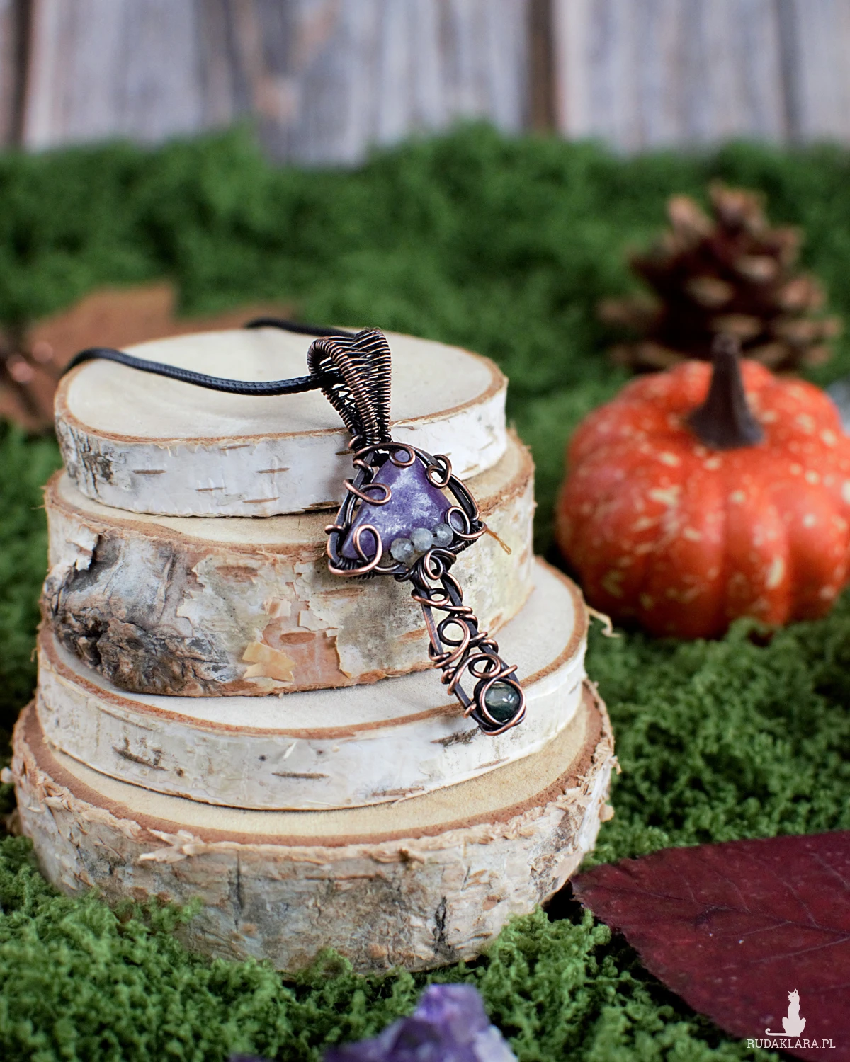 Przepiękny wisior ręcznie wykonany z użyciem ametystu, labradorytu, agatu mszystego i naturalnej miedzi.