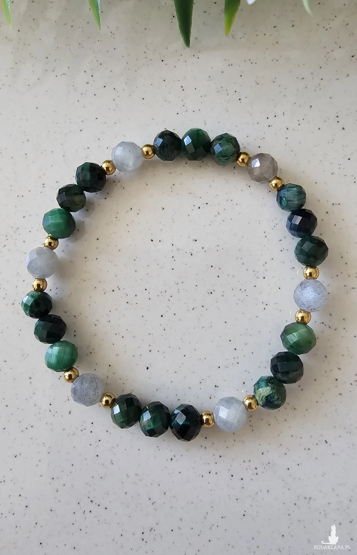Bransoletka handmade na elastycznej gumce z kamieni zielonego kociego oka i labradorytu