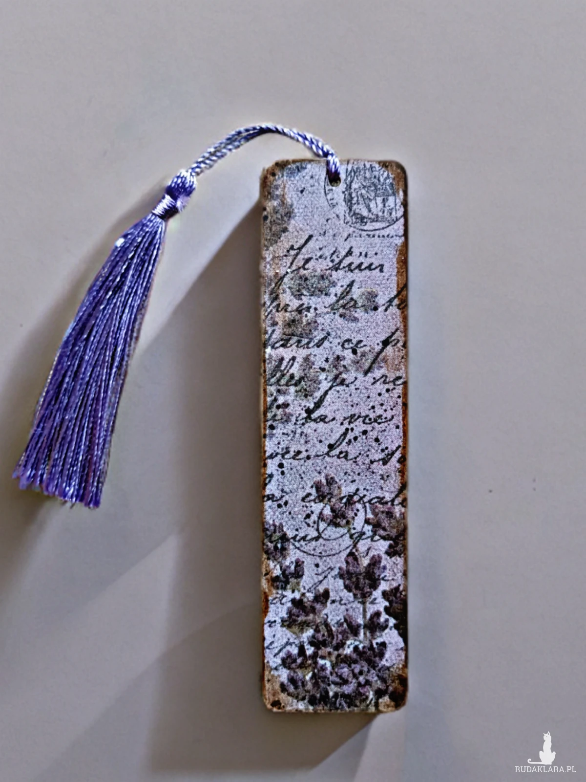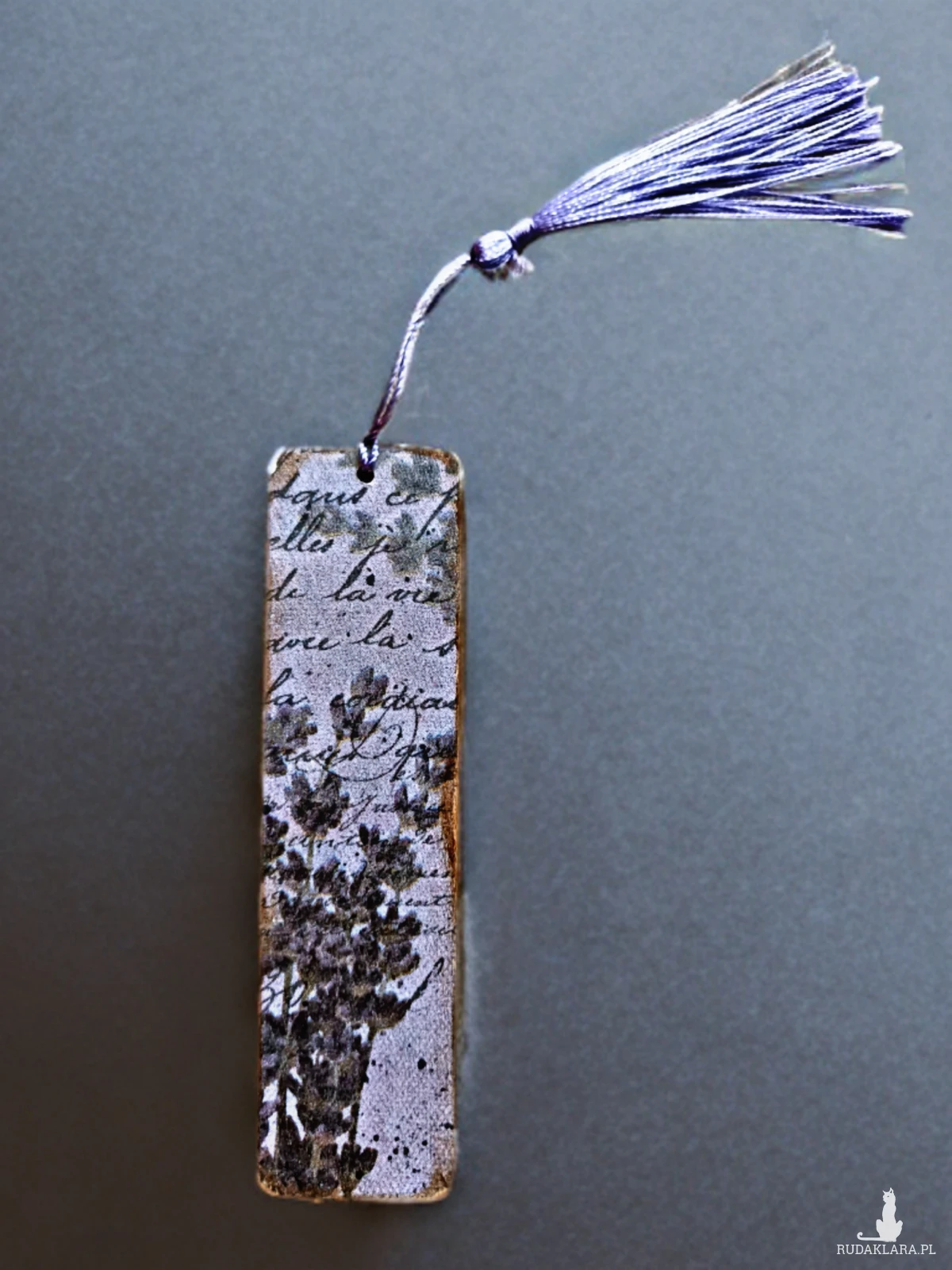 Drewniana, cieńka zakładka do książki, zdobiona dwustronnie techniką decoupage.