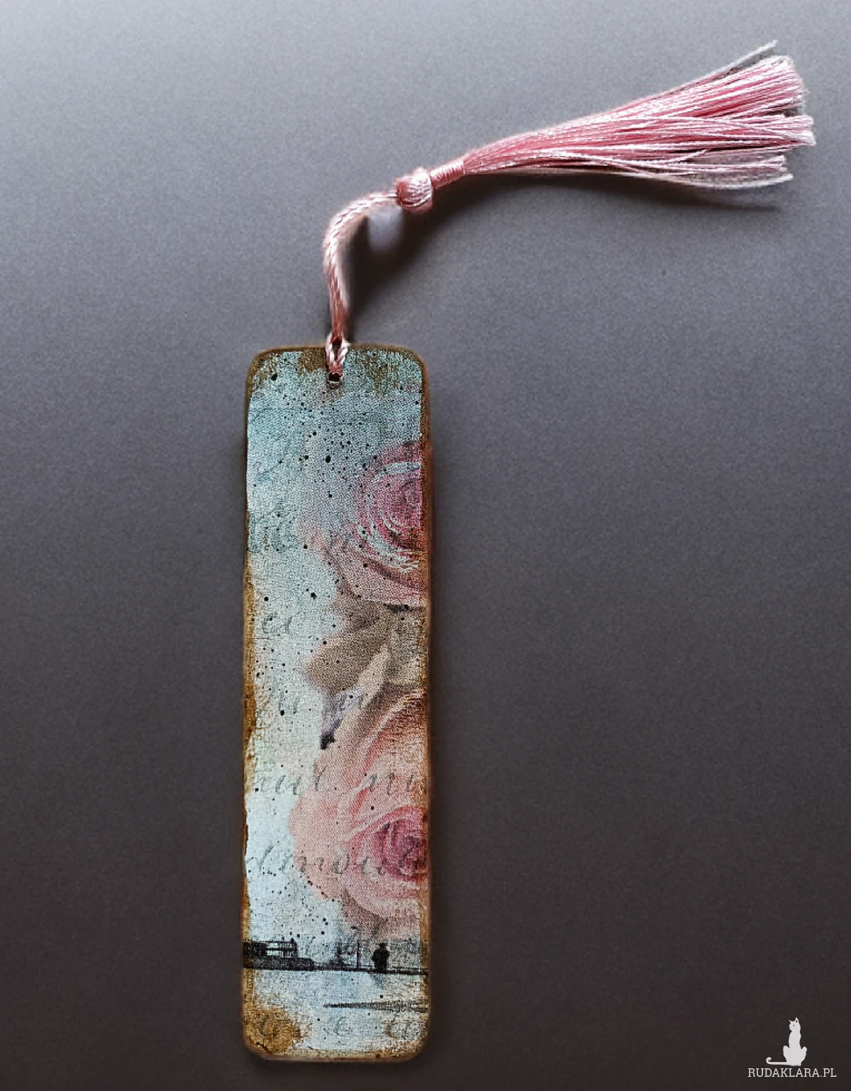 Drewniana, cieńka zakładka do książki, zdobiona dwustronnie techniką decoupage.