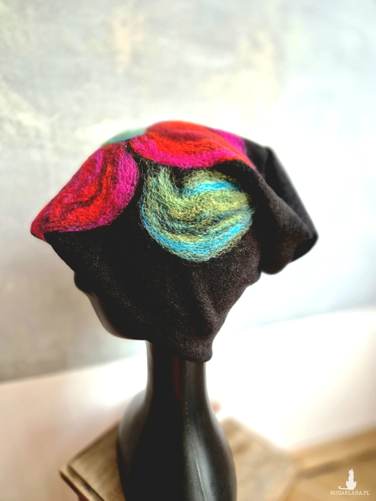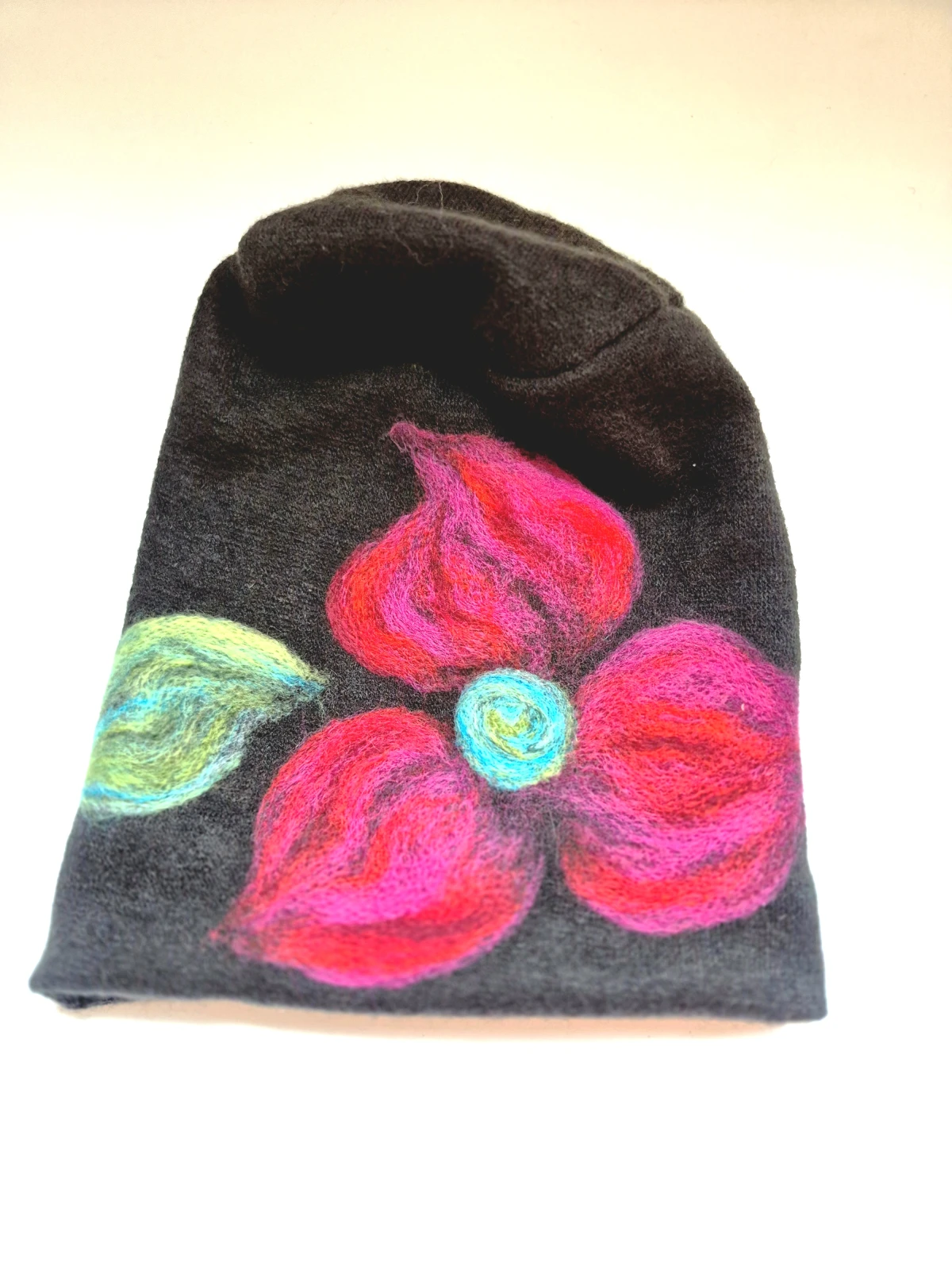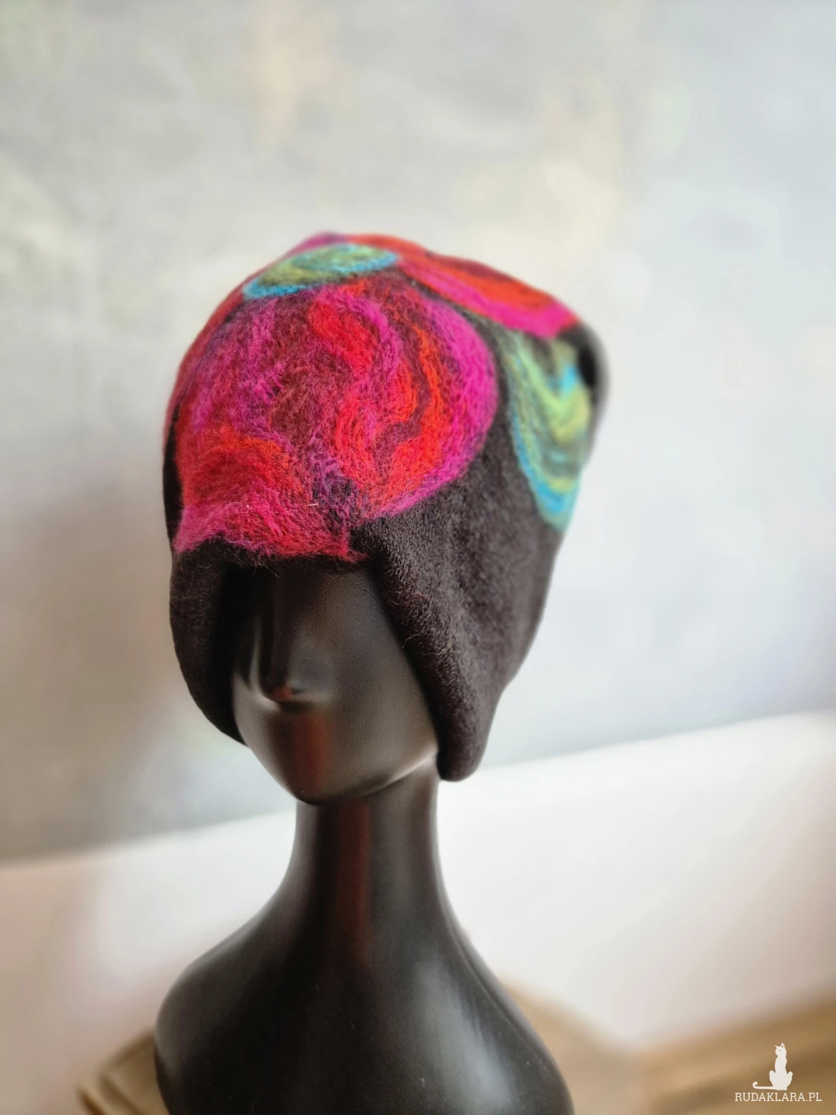 czapka wełniana filcowana zimowa czarna handmade w kwiaty na podszewce-- rozmiar uniwersalny, wełniana, filcowana wełną merynosów, bardzo ciepła, fantastyczna, miła, miękko układa się na głowie, niesamowicie zwraca uwagę, doskonałą na codzienne noszenie jak i na prezent, zawsze możesz ją założyć po basenie i przeżyjesz,box L1