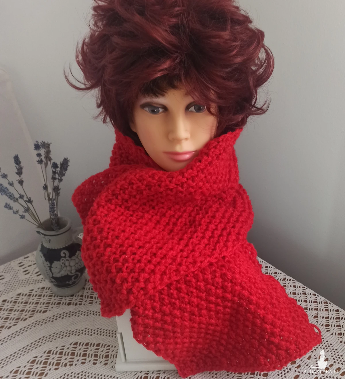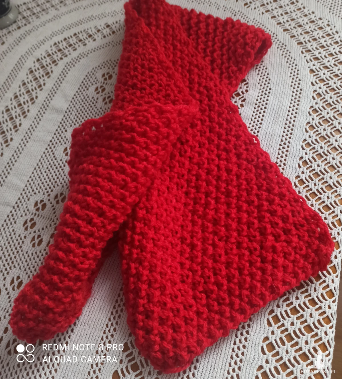 Szal w wyrazistym czerwonym kolorze /truskawkowym/wykonany na drutach z wełny. Wyrób bardzo mięsisty, mięciutki i bardzo przyjemny w dotyku. Nie drapie, jest bardzo milutki dla ciała. Całkowita długość 108 cm, szerokość 22,5 cm. Nie rozciąga się ale jest podatny na wydłużenie. Wykonany ściegiem ryżowym, dzięki niemu szalik staje si e dosyć gruby. Przy różnej pogodzie można wykorzystać wyrób jako tradycyjny szalik, chusta na bluzkę lub bezpośrednio na głowę lub na czapkę z daszkiem. Doskonały dodatek na chłodniejszą lub nawet zimną pogodę. Piękny rzucający się w oczy kolor. Pranie wyłącznie ręczne , w temperaturze do 30 stopni. Gorąco polecam, niska cena.
