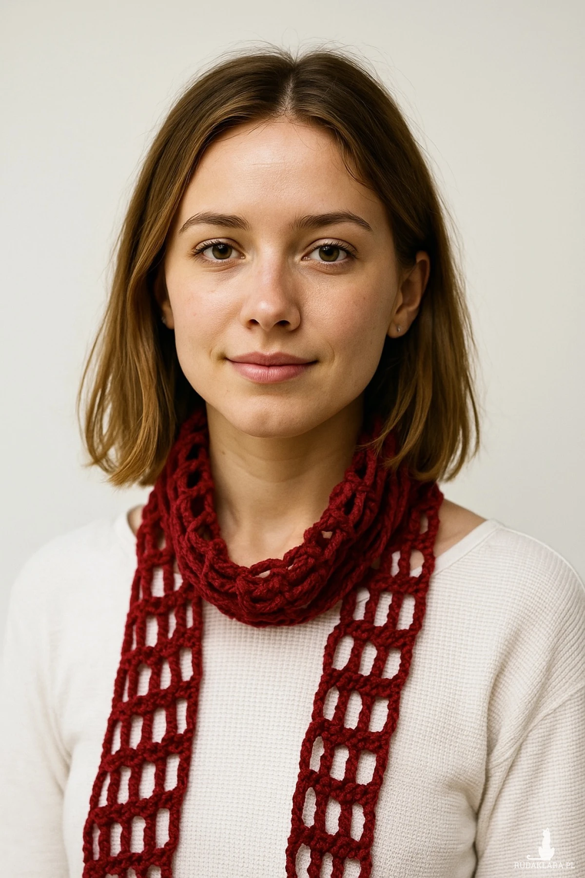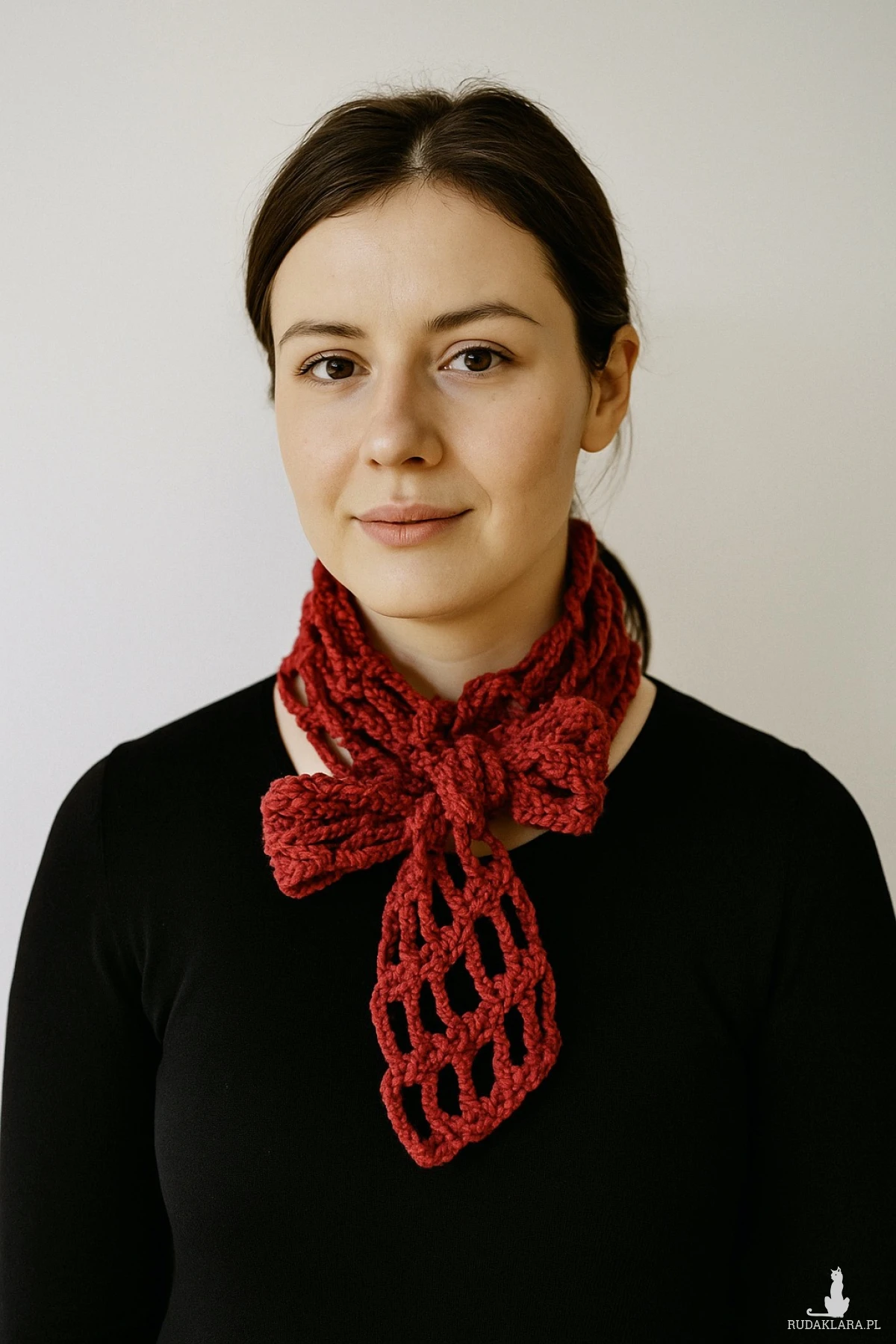 Ażurowy, siatkowy wzór nadaje mu ciekawego charakteru, a odpowiednia długość pozwala na różne sposoby stylizacji – możesz owinąć go wokół szyi, nosić jak naszyjnik, opaskę lub delikatny akcent do letnich i jesiennych stylizacji.