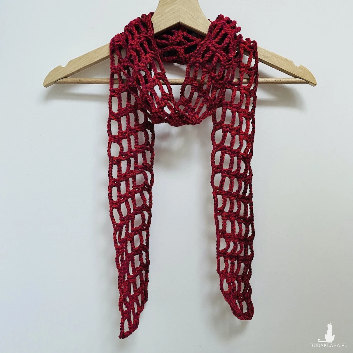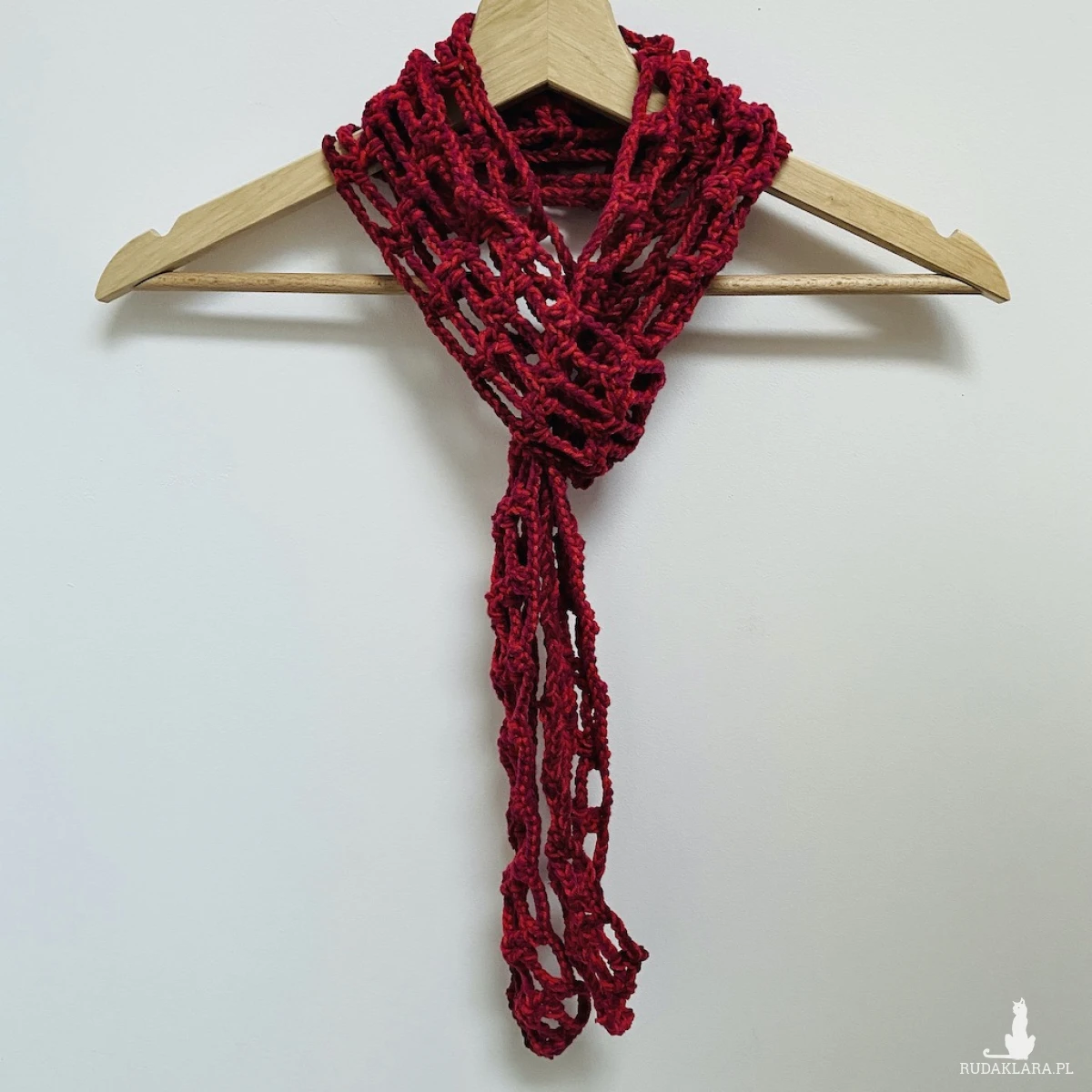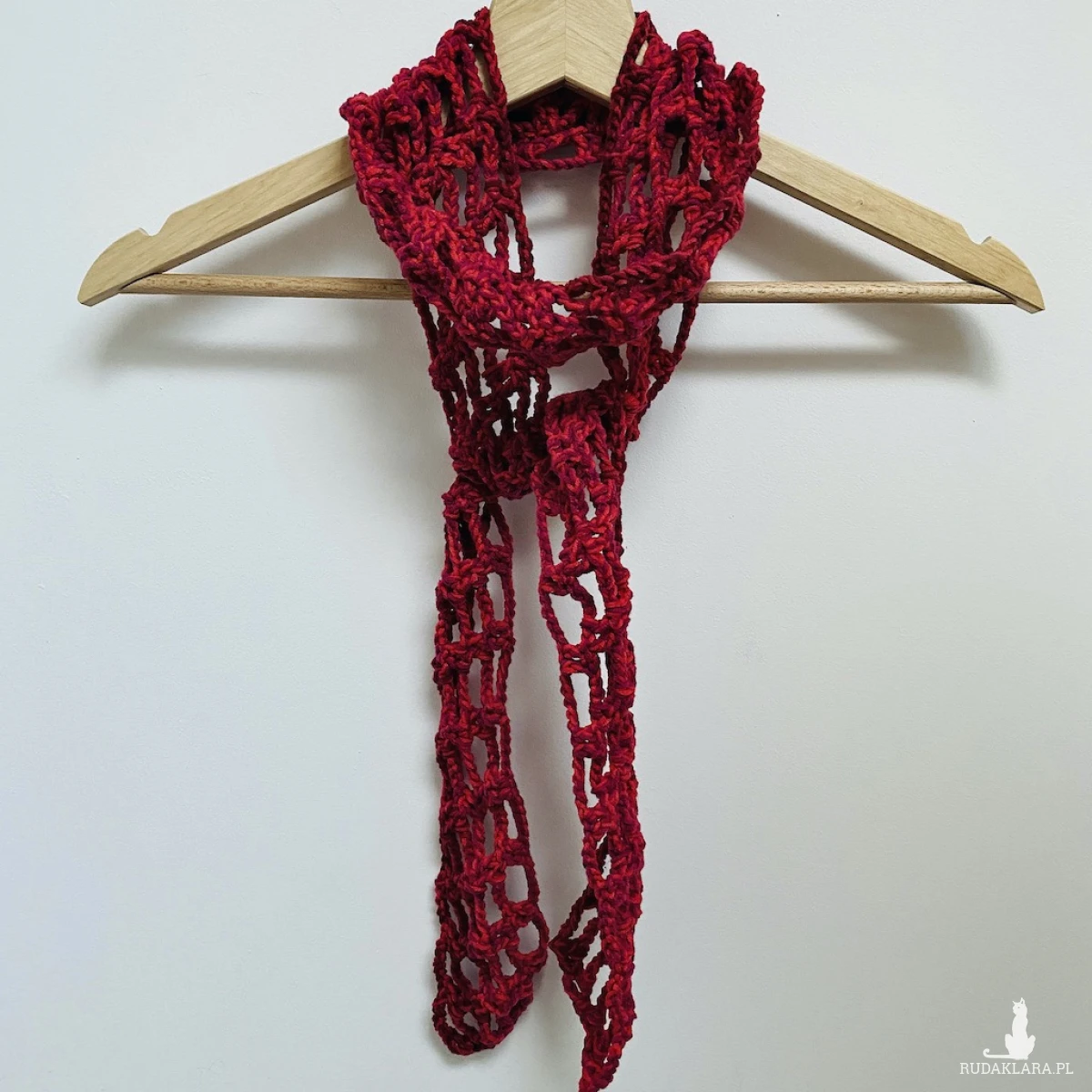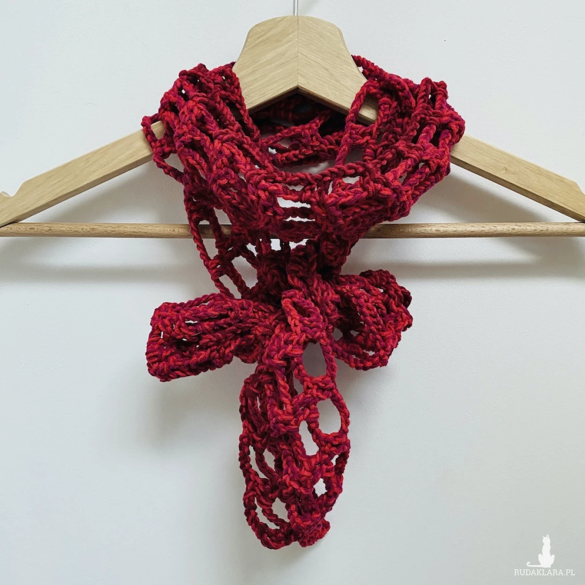 Ten wąski szalik wykonałam ręcznie na szydełku z dwóch odcieni czerwieni wysokiej jakości włóczki bawełniano-akrylowej, przyjemnej w dotyku i delikatnie elastycznej.