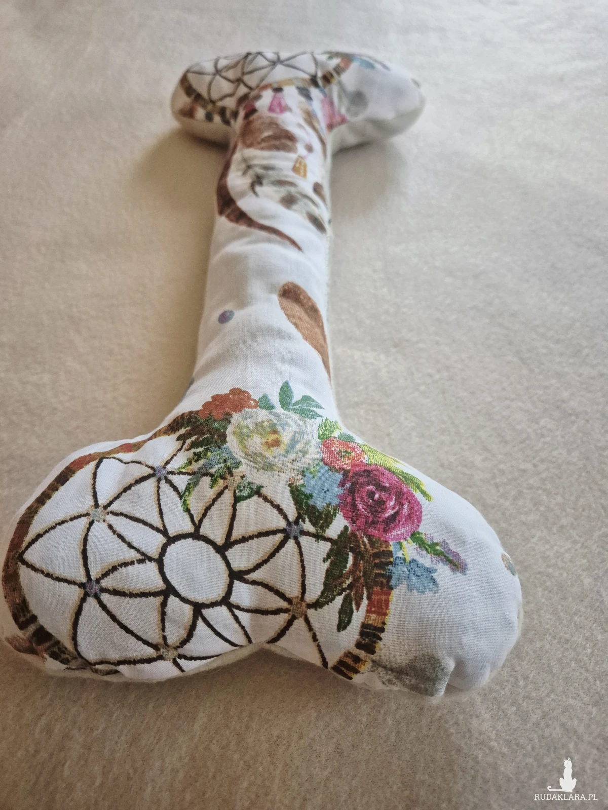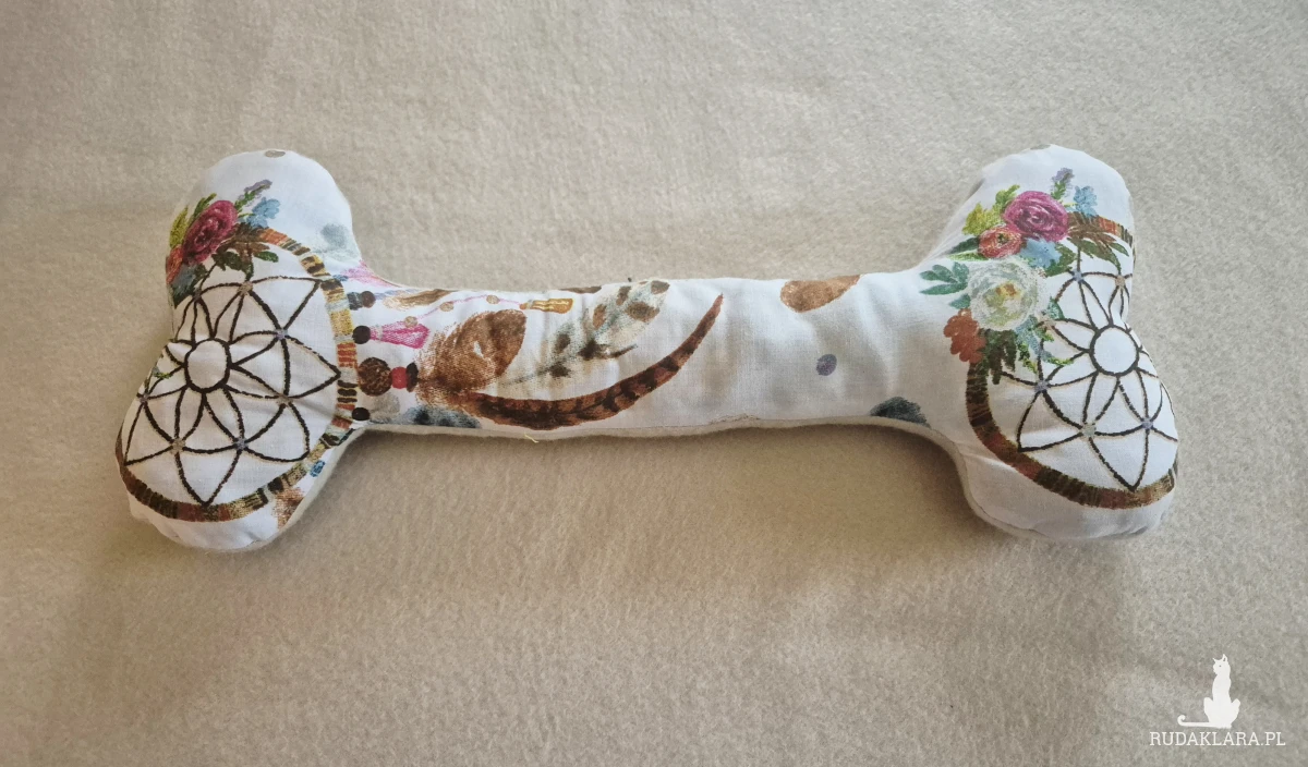 Podusia zero waste w kształcie kości jest wypełniona ścinkami materiałów powstających przy tworzeniu różnych produktów. Jedna strona jest z miękkiego polaru, z druga z wzorzystej bawełny. Świetnie nadaje się jako dekoracja, a może być też poduszką dla psa lub ulubioną zabawką. Wymiary 36 cm długości i 15 cm szerokości