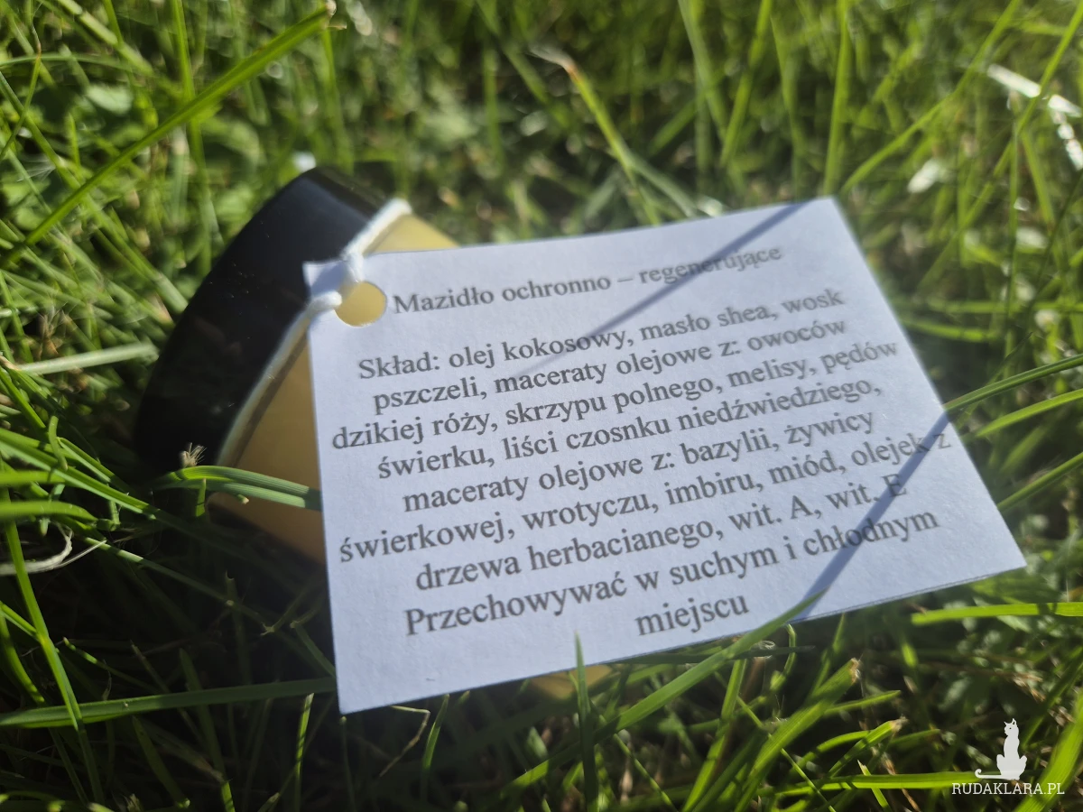 Skład: olej kokosowy, masło shea, wosk pszczeli, maceraty olejowe z: owoców dzikiej róży, skrzypu polnego, melisy, pędów świerku, liści czosnku niedźwiedziego, maceraty olejowe z: bazylii, żywicy świerkowej, wrotyczu, imbiru, miód, olejek z drzewa herbacianego, wit. A, wit. E Przechowywać w suchym i chłodnym miejscu