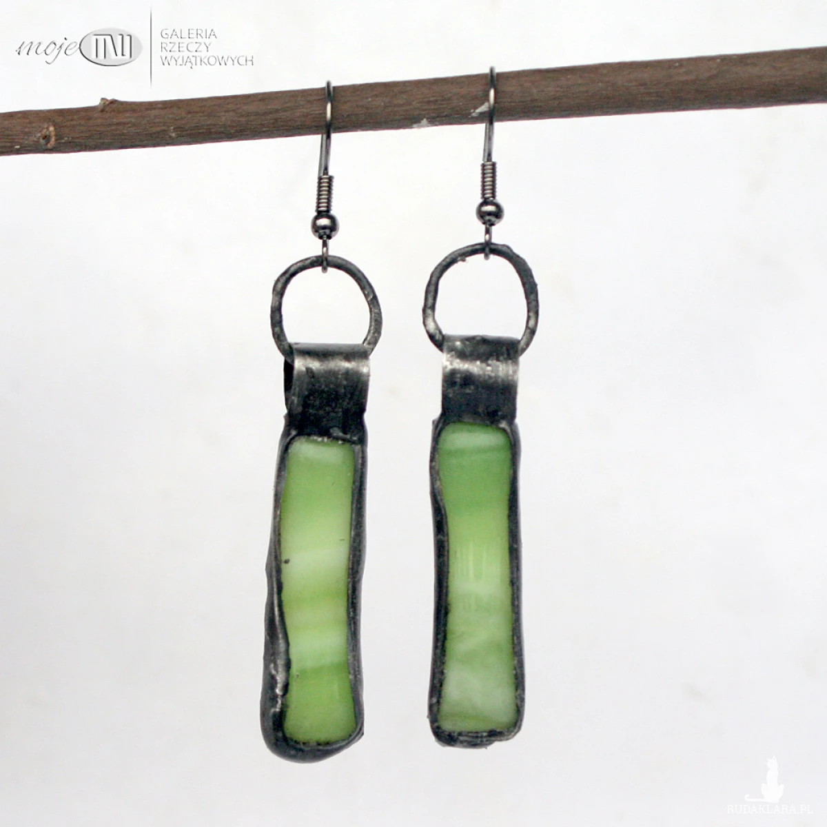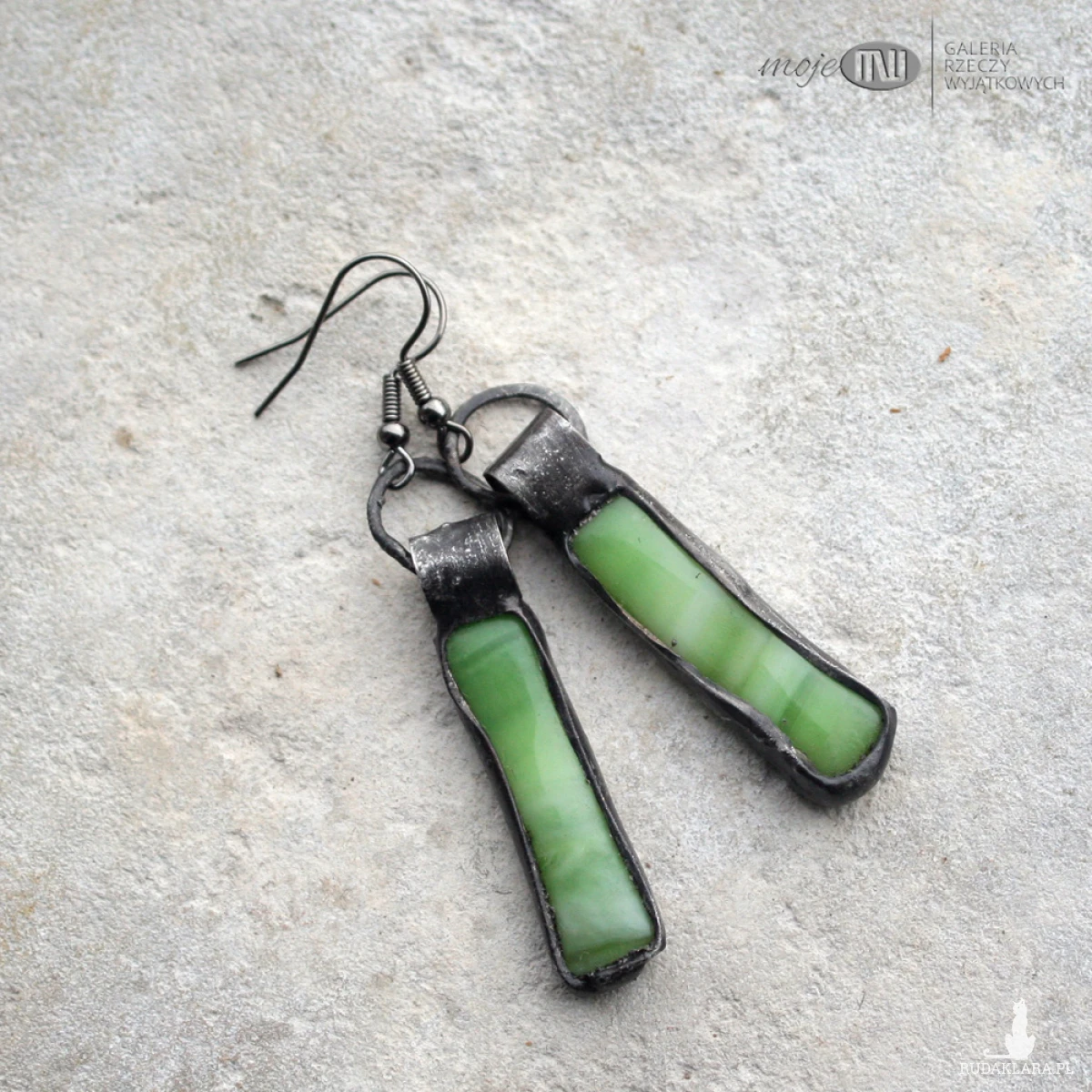 Kolczyki z zielonego, nieprzejrzystego, szklanego, podłużnego paluszka, wytopionego przeze mnie metodą fusingu w temperaturze min. 800 stopni. Całość oprawiona w miedź - cynowaną, patynowaną i przecieraną.