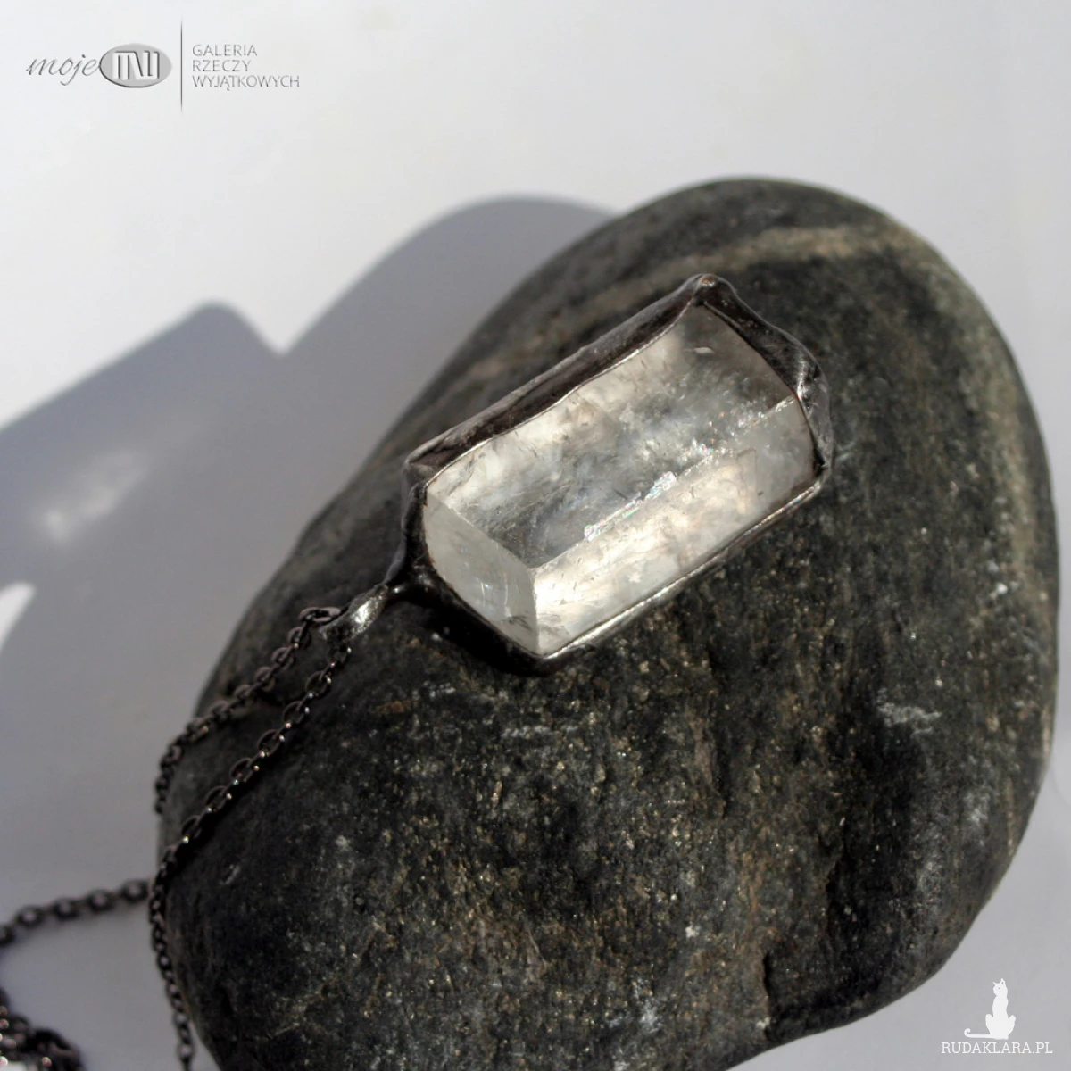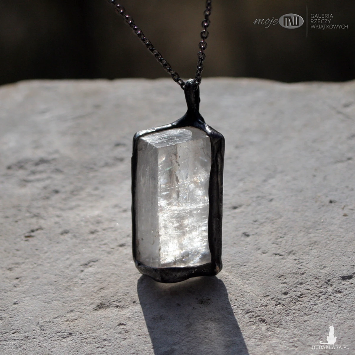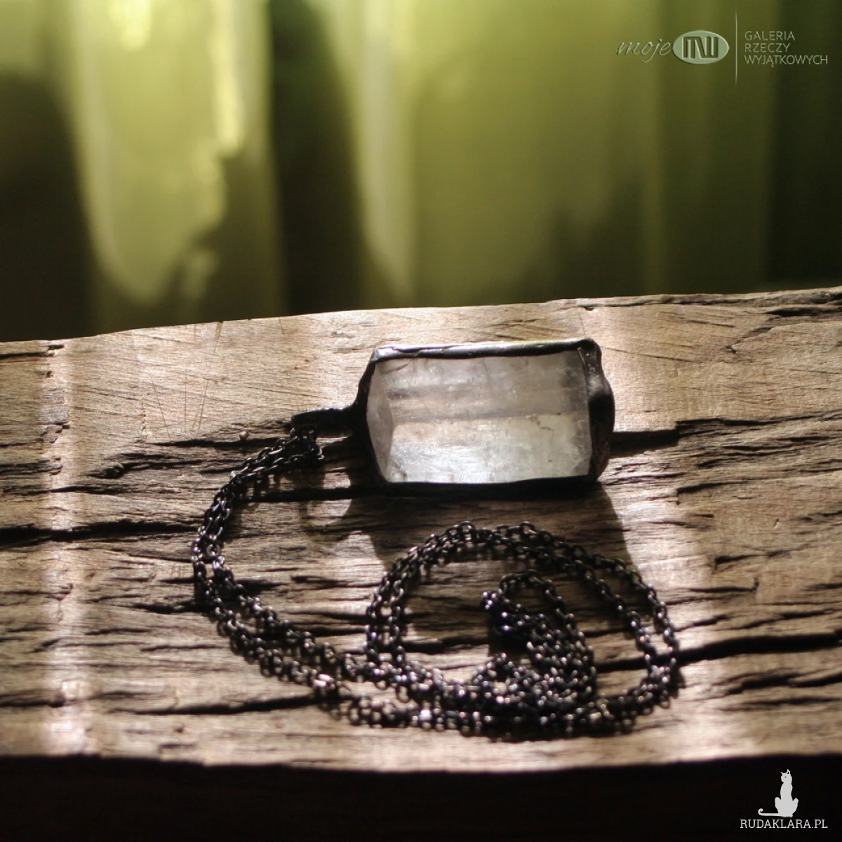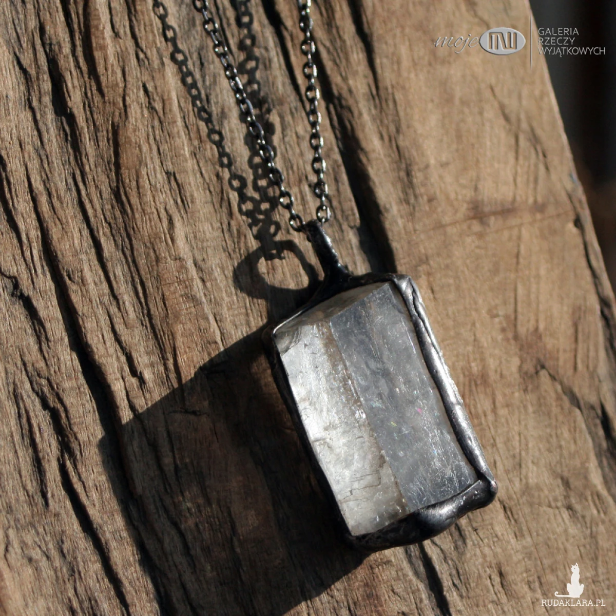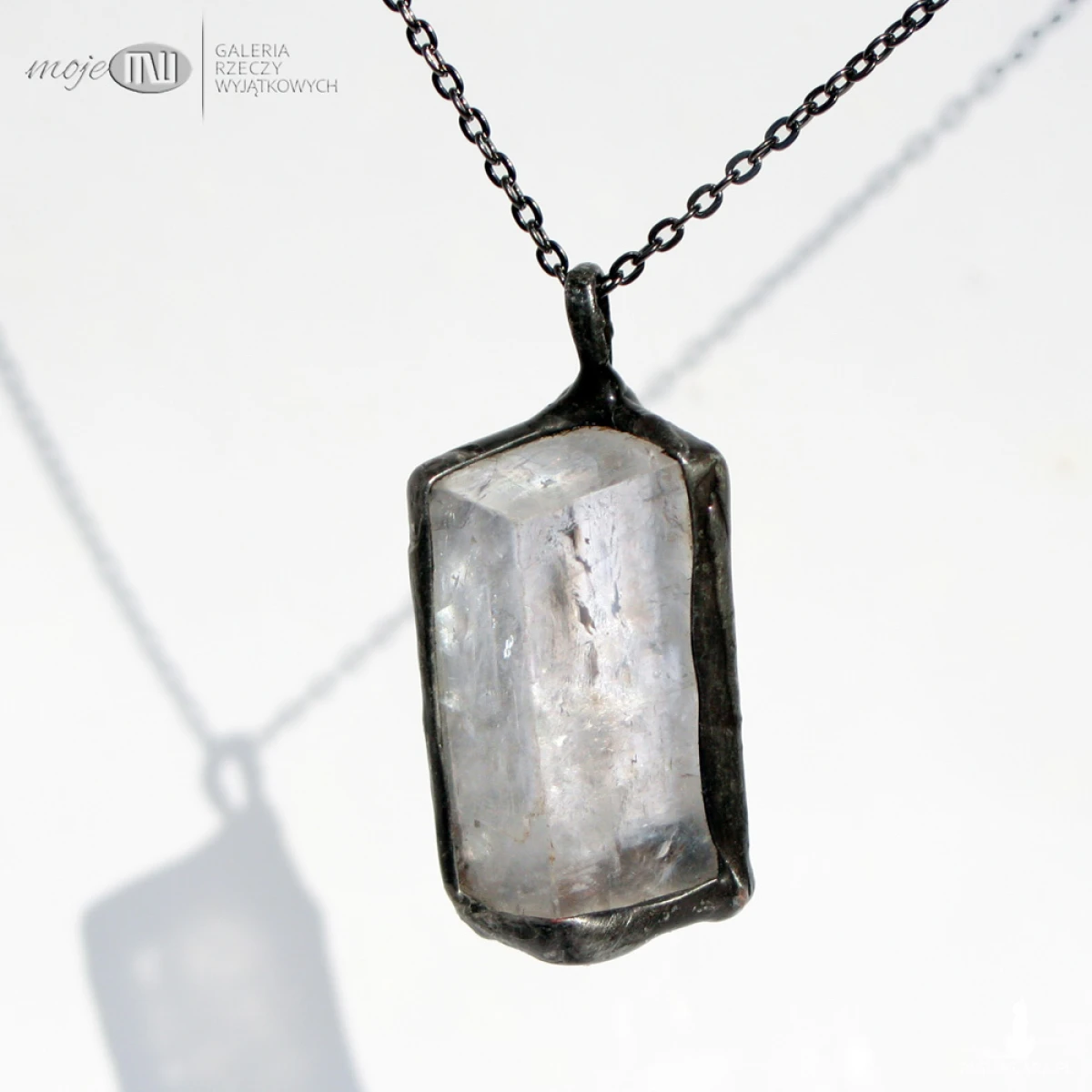 Surowy kryształ kalcytu (szpat islandzki) - oprawiony minimalistycznie w miedź - cynowaną, patynowaną i przecieraną. Zawieszony jest na łańcuszku w kolorze grafitowym. Zazwyczaj dodaję łańcuszek o długości ok. 60-70 cm, ale klient przy zamówieniu może wybrać długość.