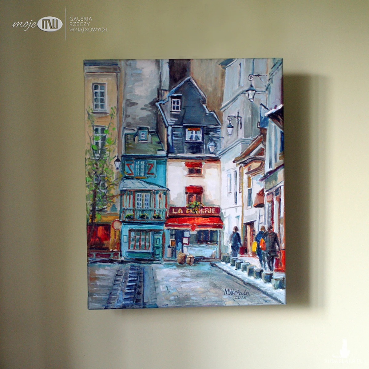 Obraz olejny, utrzymany w pełnej palecie barw, przedstawia starą paryską uliczkę.