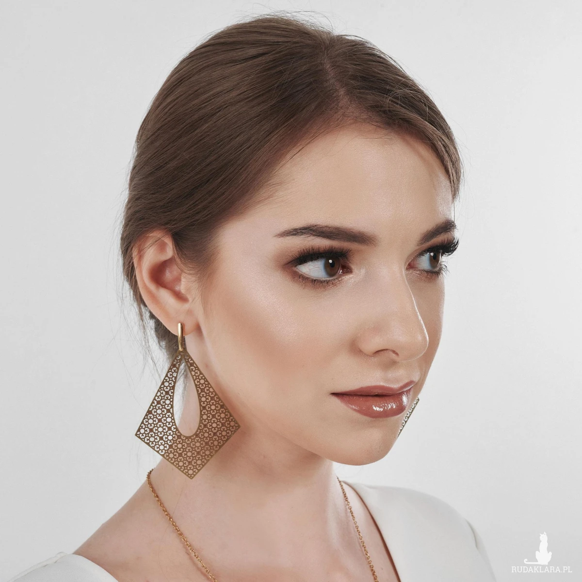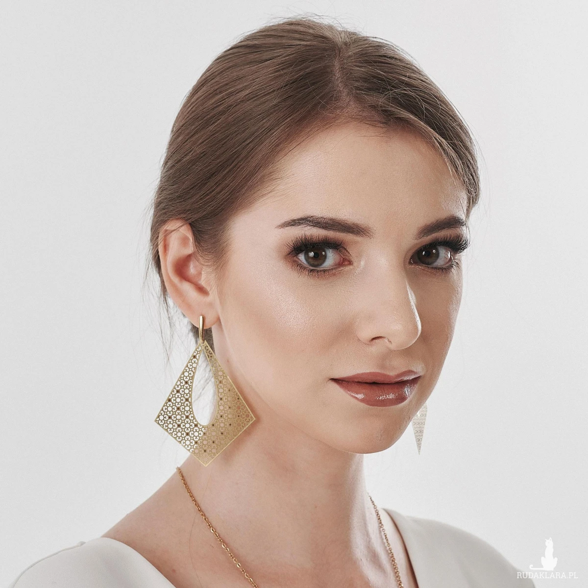 Oryginalne kolczyki dla osób, które przy doborze biżuterii stawiają na nowatorskie formy i klasyczne kolory. Kolczyki w kształcie rombu przypominającego odwrócony diament zostały wykończone ręcznie poprzez satynowanie i pokrycie ozdobnej blaszki warstwą ochronną. Kolczyki z pewnością ucieszą bliską osobę, doskonale sprawdzą się także zestawione ze stylizacjami wieczorowymi. Mimo dużego rozmiaru, kolczyki nie obciążają uszu. Ażurowe elementy powstały ze złocistego mosiądzu