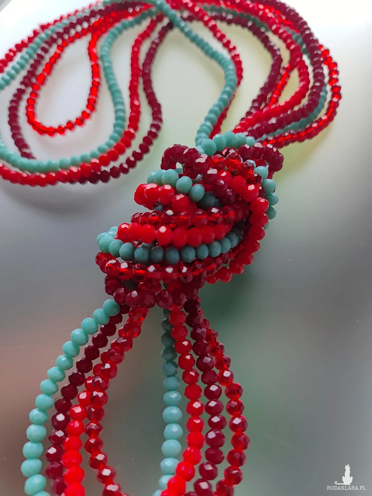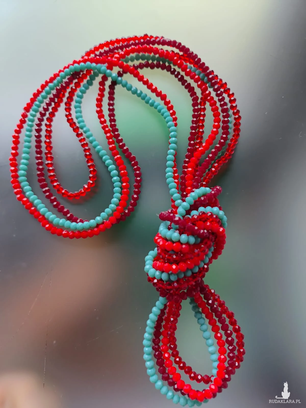 Naszyjnik, korale na gumce. Cztery sznury kryształków szklanych fasetowanych w kolorach czerwonym i turkusowym. Każdy sznur inny, każdy można nosić oddzielnie na szyi lub jako bransoletkę. Piękna czerwień i niebieski turkus. Długość każdego sznura 50 cm