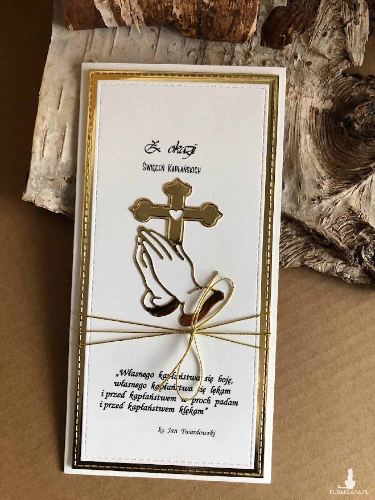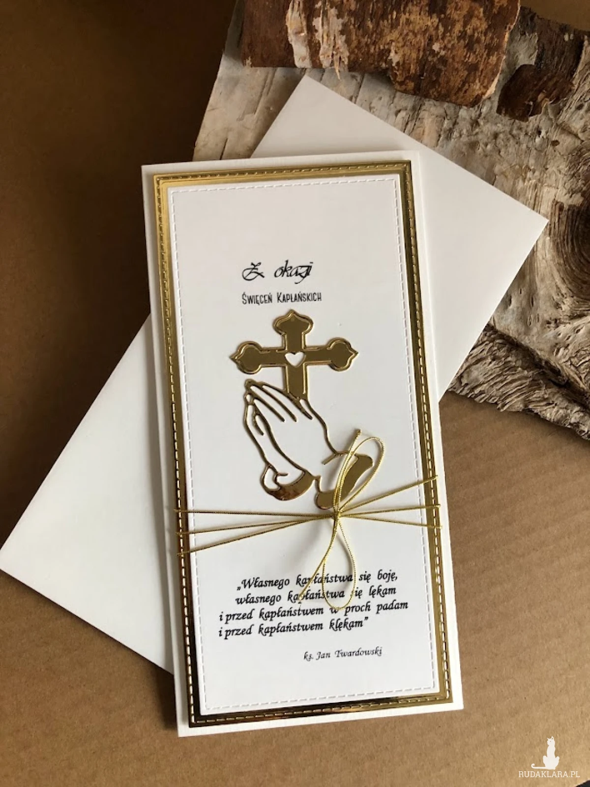 Kartka z okazji święceń kapłańskich. Wykonana ręcznie z największą starannością i ozdobiona wymowną symboliką. Stworzona w kolorystyce złoto- białej z cytatem.Wnętrze kartki skrywa miejsce na wypisanie własnych życzeń. Wielkość kartki 10,5 x 21 w komplecie z białą kopertą. W tej postaci kartka dostępna od ręki.