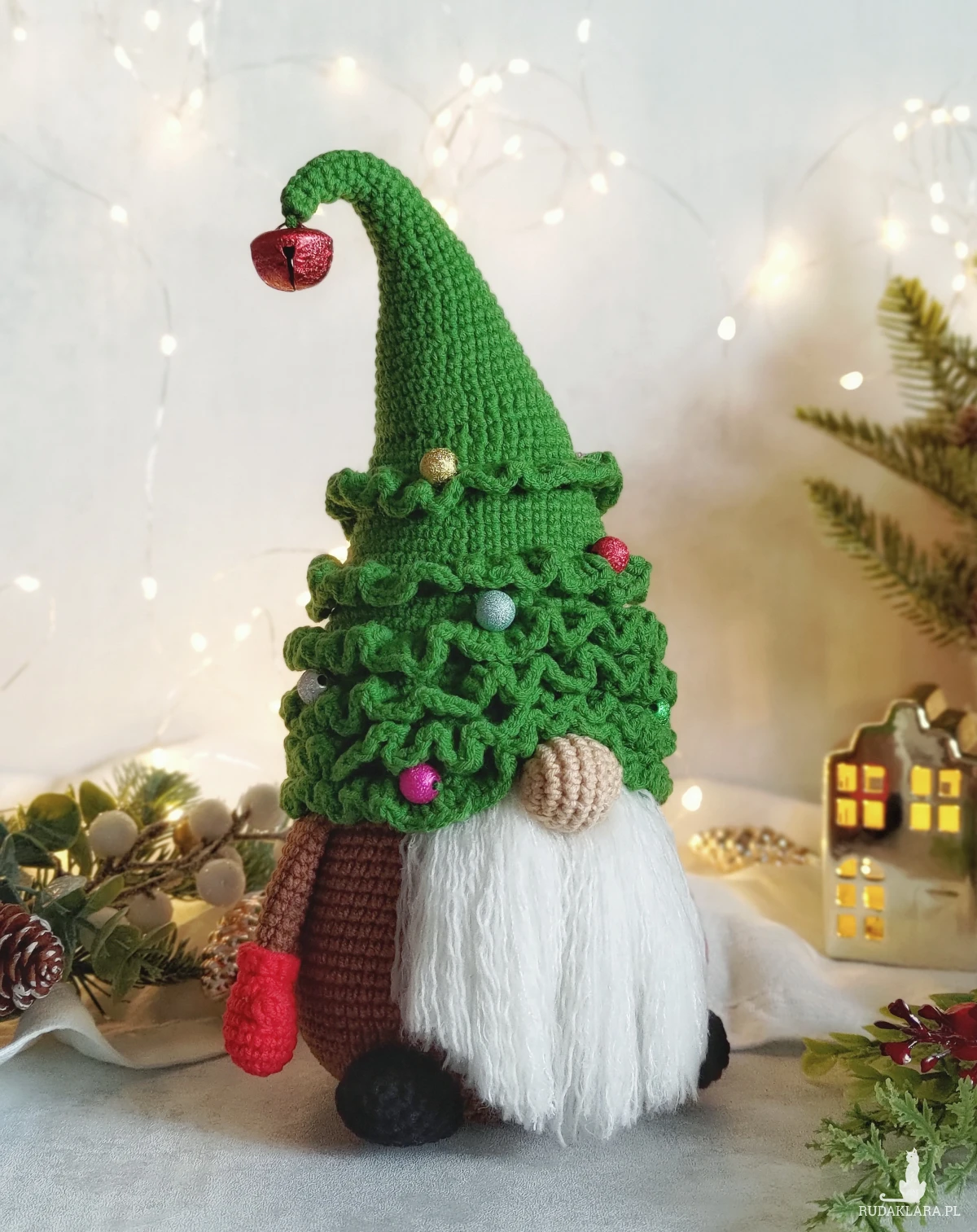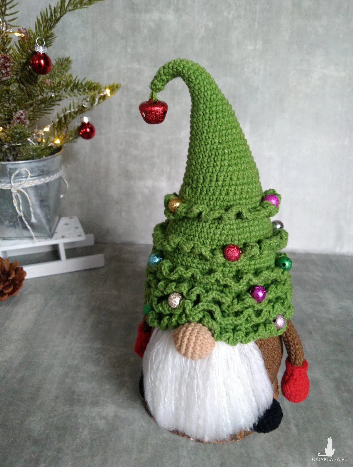 - Czapka gnoma ma kształt choinki, ozdobiona jest kolorowymi, błyszczącymi koralikami, a na końcu kapelusza wisi metalowy dzwoneczek (kolor losowy).