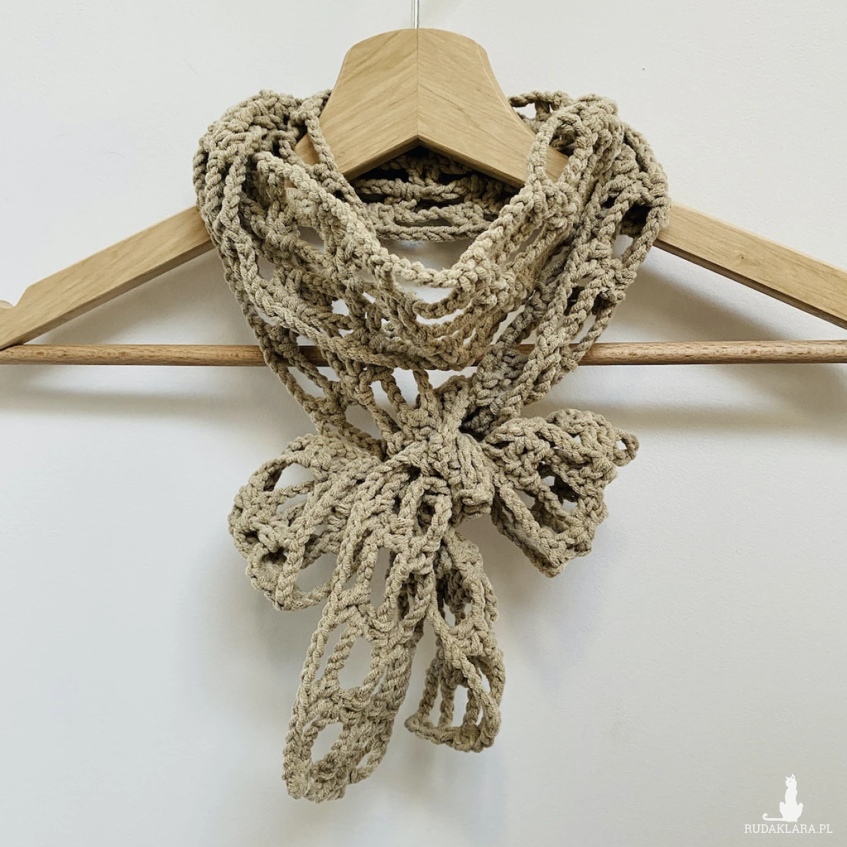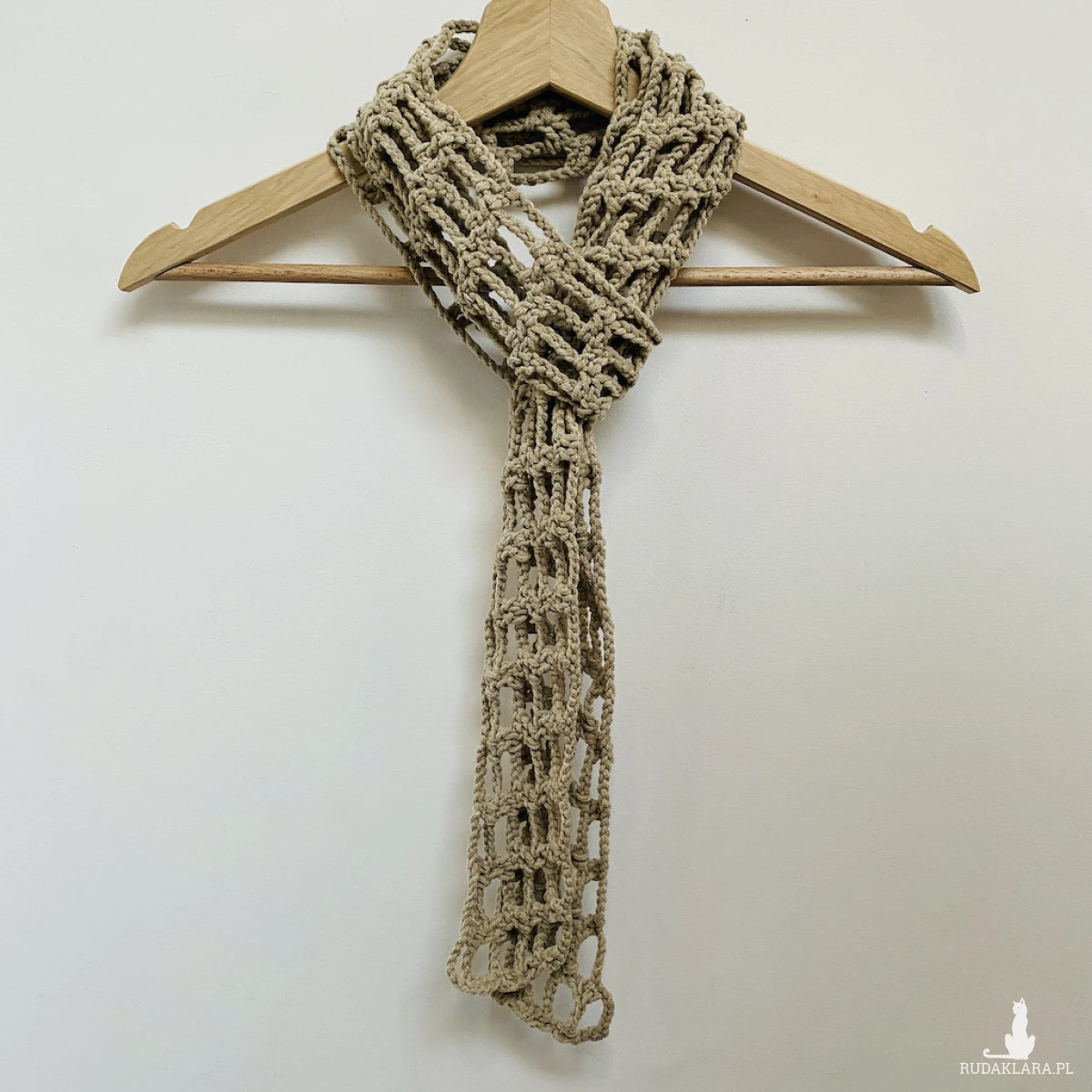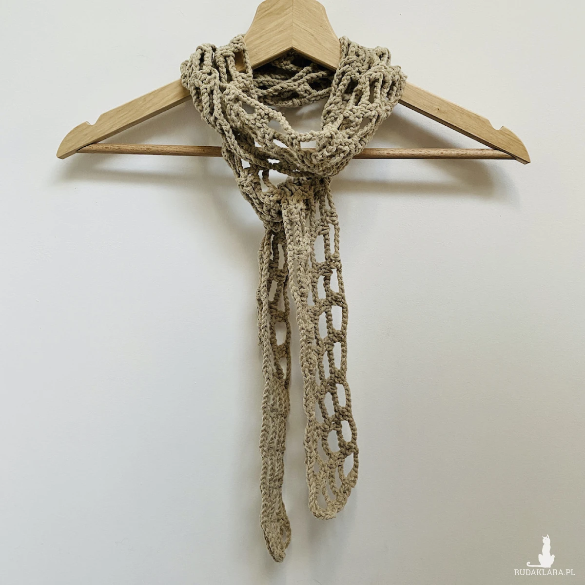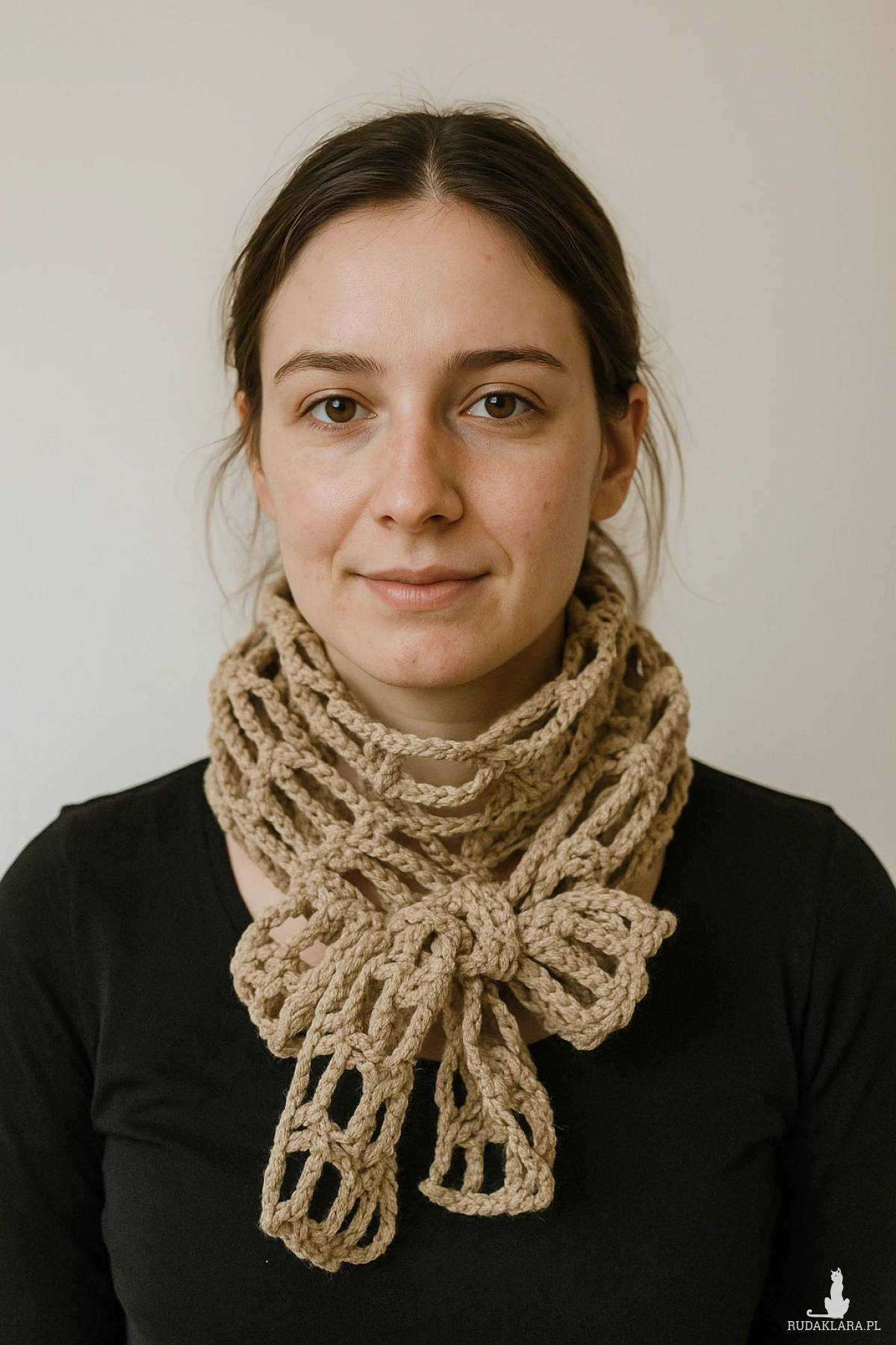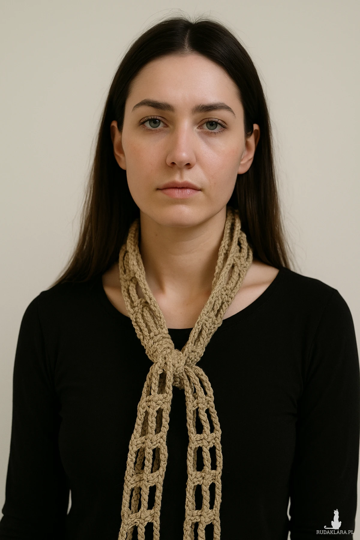 Ażurowy, siatkowy wzór nadaje mu ciekawego charakteru, a odpowiednia długość pozwala na różne sposoby stylizacji – możesz owinąć go wokół szyi, nosić jak naszyjnik, opaskę lub delikatny akcent do letnich i jesiennych stylizacji.