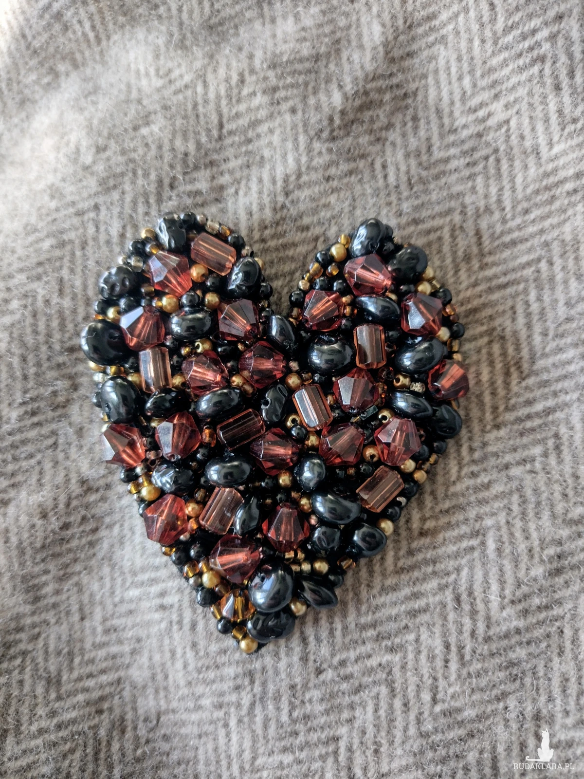 Biżuteryjna broszka w kształcie serca wyhaftowana koralikami na filcu. Usztywniona i podklejona. Posiada dużą agrafkę do przypinania. Wielkość 7 cm.