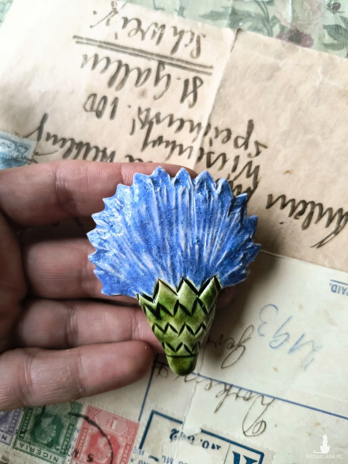 Broszka ceramiczna w postaci kwiatka o wymiarach ok 5 cm x 6,5 cm, wykonana z gliny szamotowej wypalona na biskwit, a następnie szkliwiona w temp ok 1260 stopni C. polecam serdecznie.