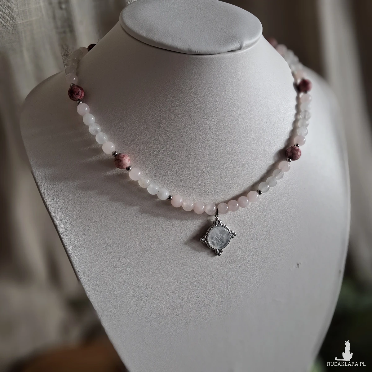 Naszyjnik wykonany z stali nierdzewnej (jubilerskiej) i kamieni naturalnych. Użyte kamienie: