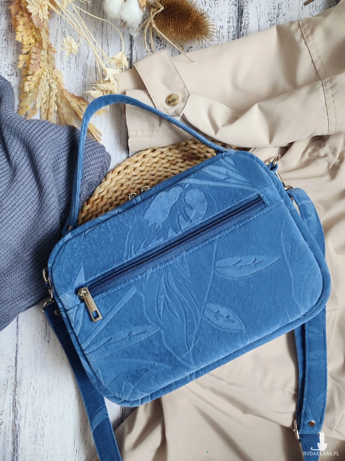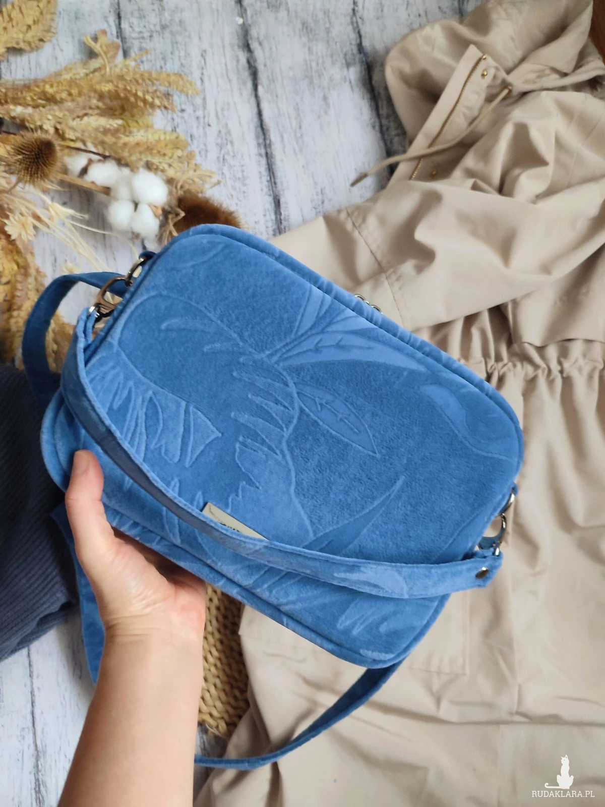 Torebka w kształcie Boxa, uszyta z tłoczonego weluru w przepięknym odcieniu zgaszonego chabru. Tłoczenie w kształcie liści.