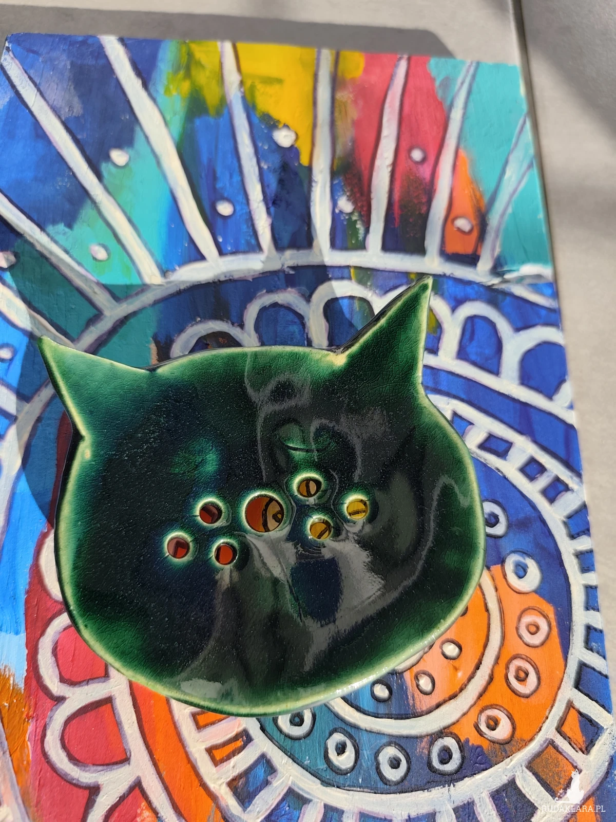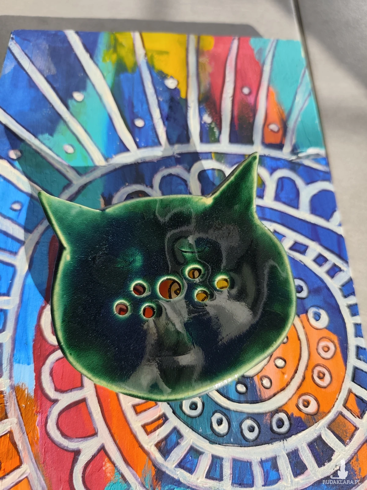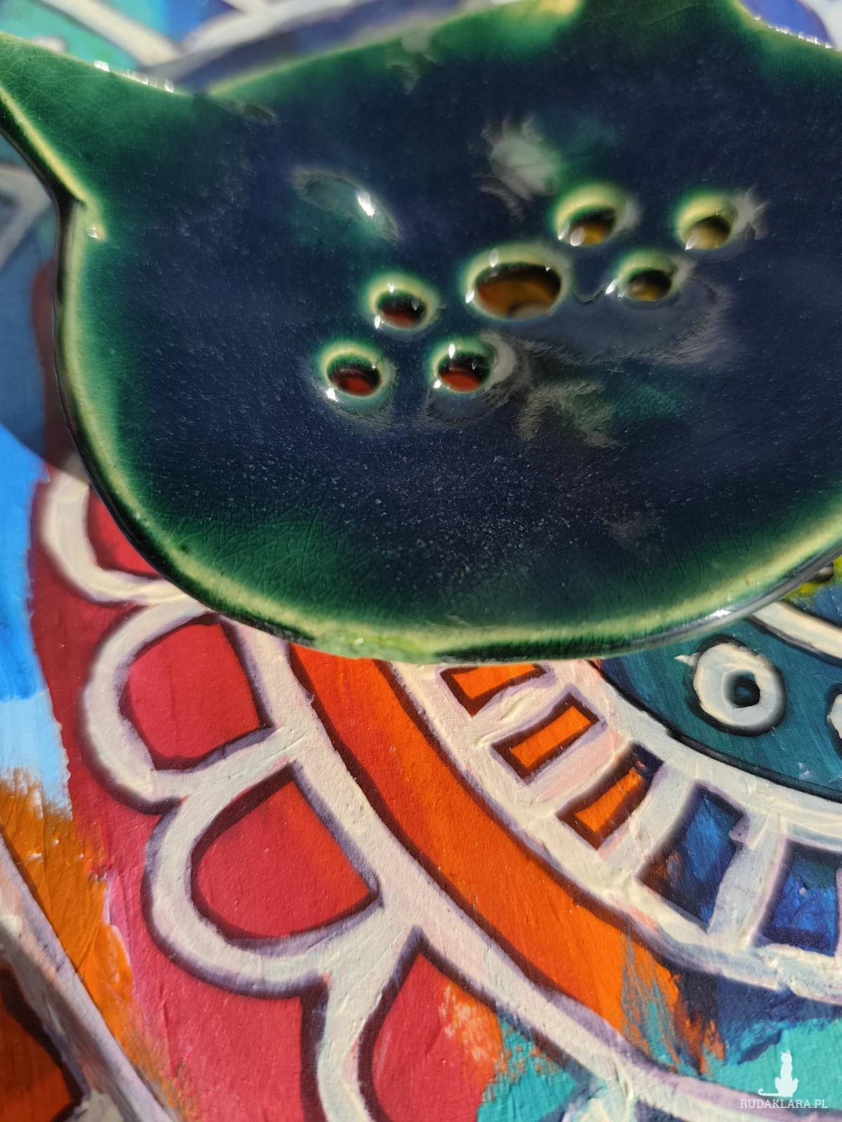 Piękna w moim ulubionym kolorze mydelniczka ceramiczna - kot, szkliwiona i dwukrotnie wypalana w piecu ceramicznym na wysoką temperaturę. Polecam będzie ozdobą Twojej łazienki lub może podarujesz komuś na prezent.