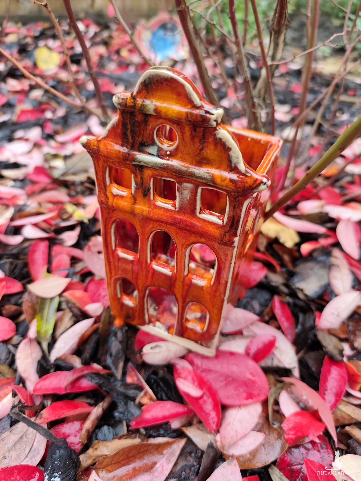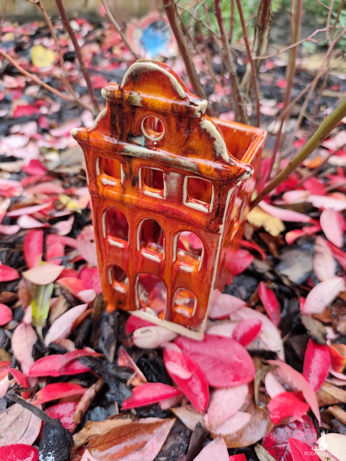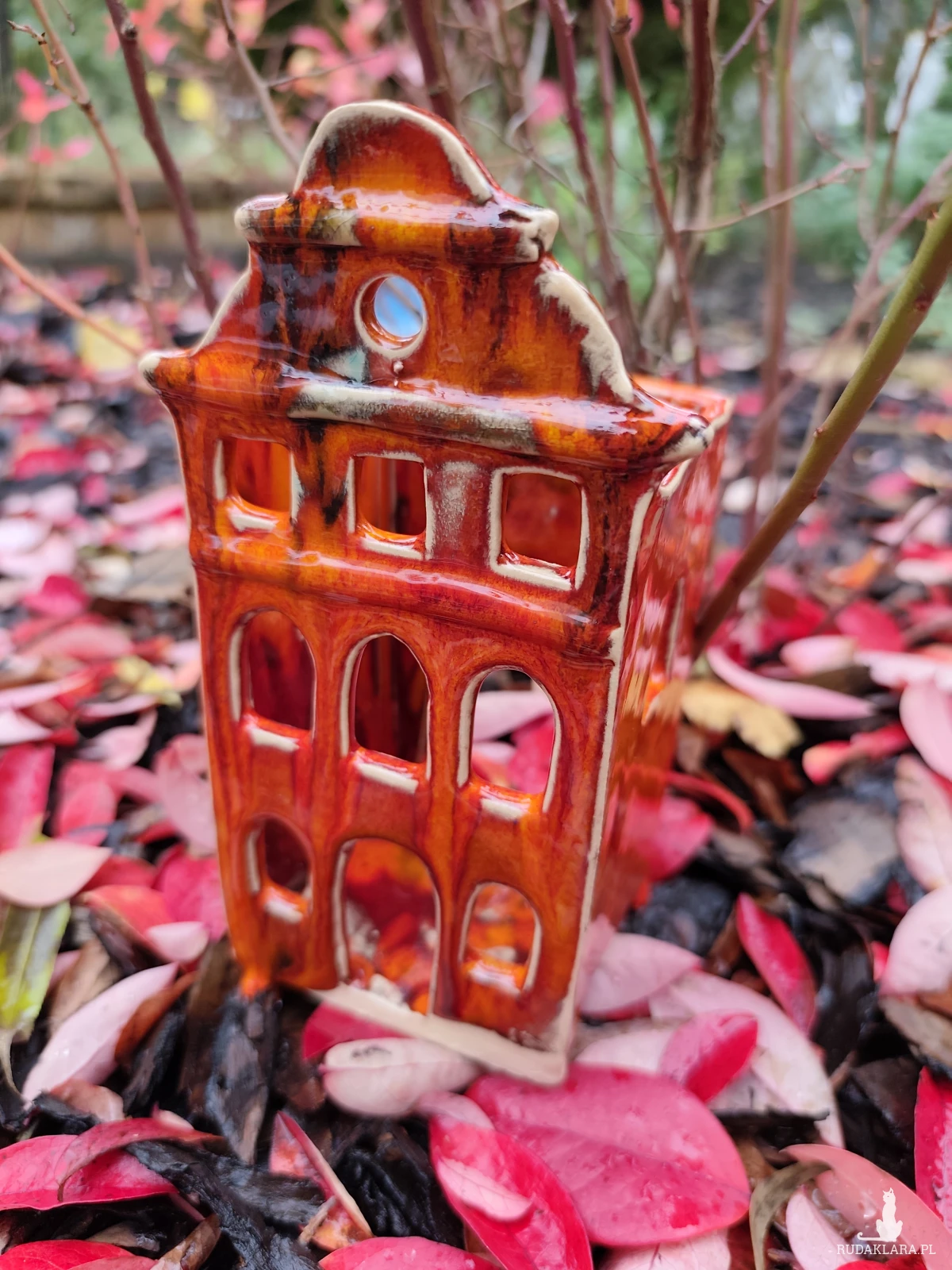 Ręcznie wykonana kamieniczka ceramiczna - lampion, szkliwiona i dwukrotnie wypalana w piecu ceramicznym na wysoką temperaturę. W pięknych jesiennych barwach. Wysokość 18 cm.