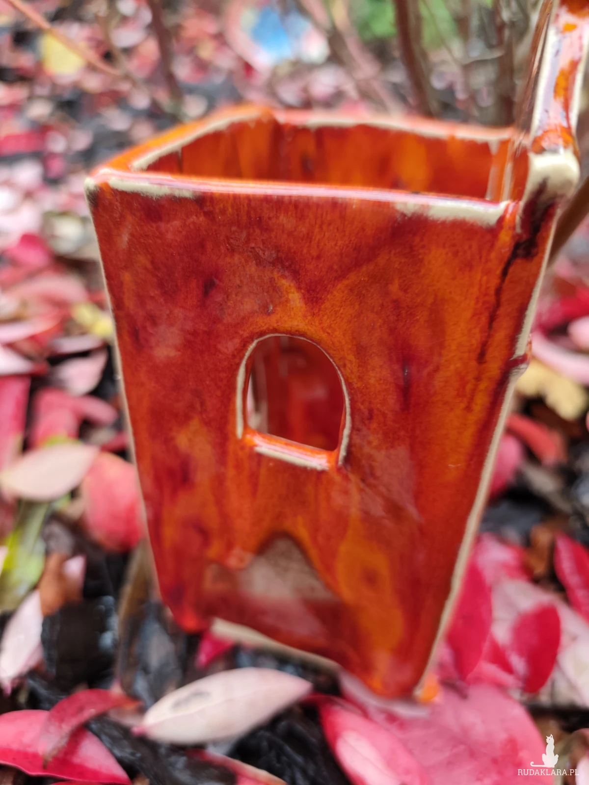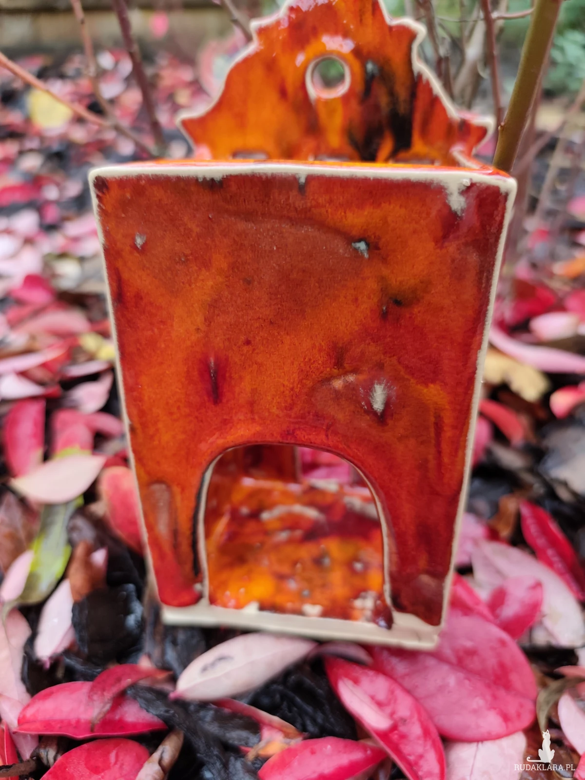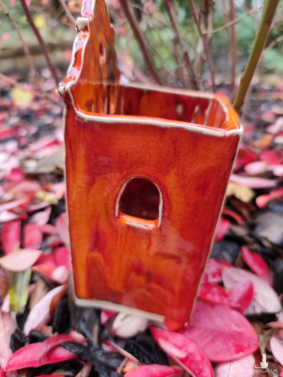 Ręcznie wykonana kamieniczka ceramiczna - lampion, szkliwiona i dwukrotnie wypalana w piecu ceramicznym na wysoką temperaturę. W pięknych jesiennych barwach. Wysokość 18 cm.