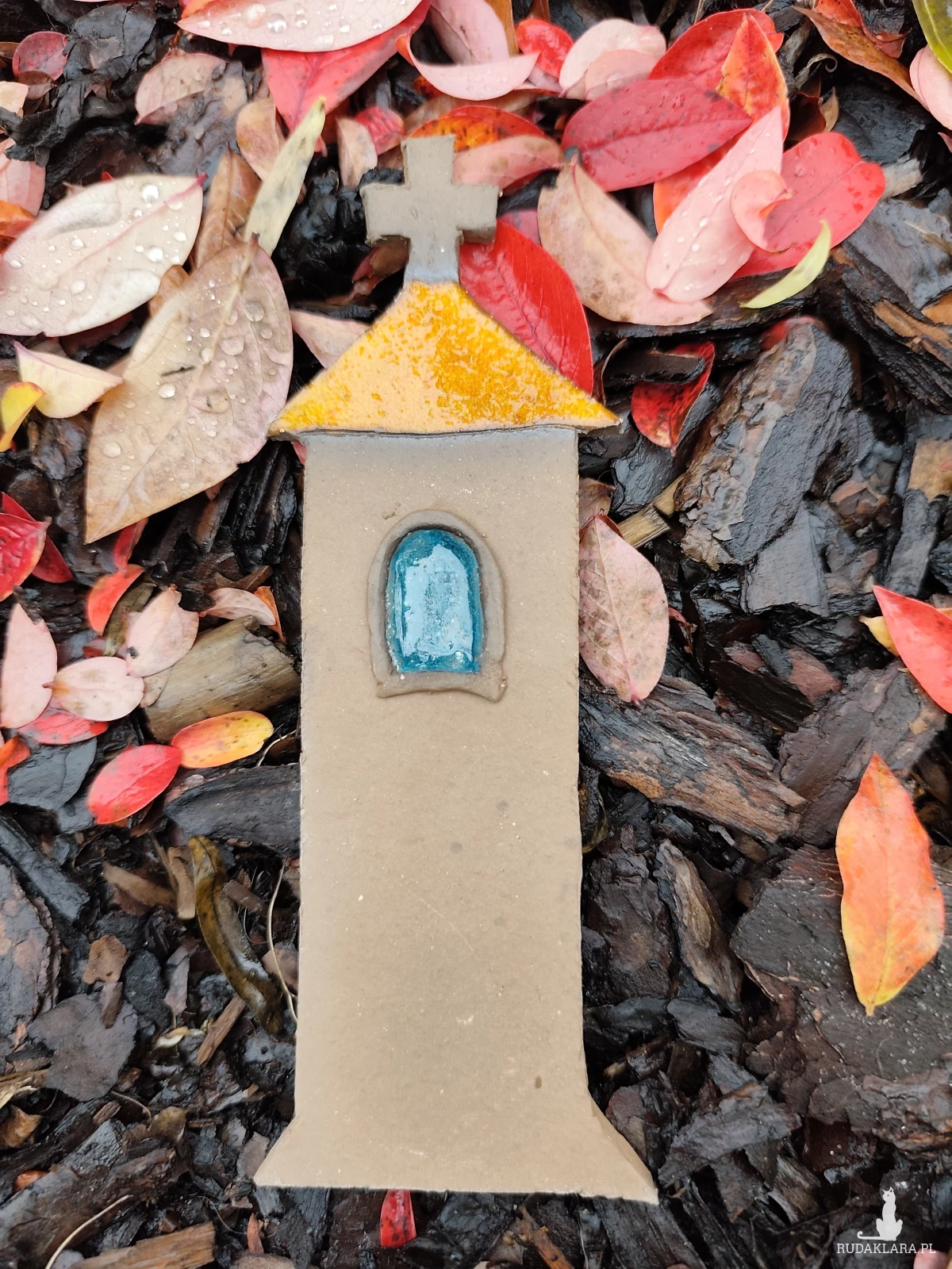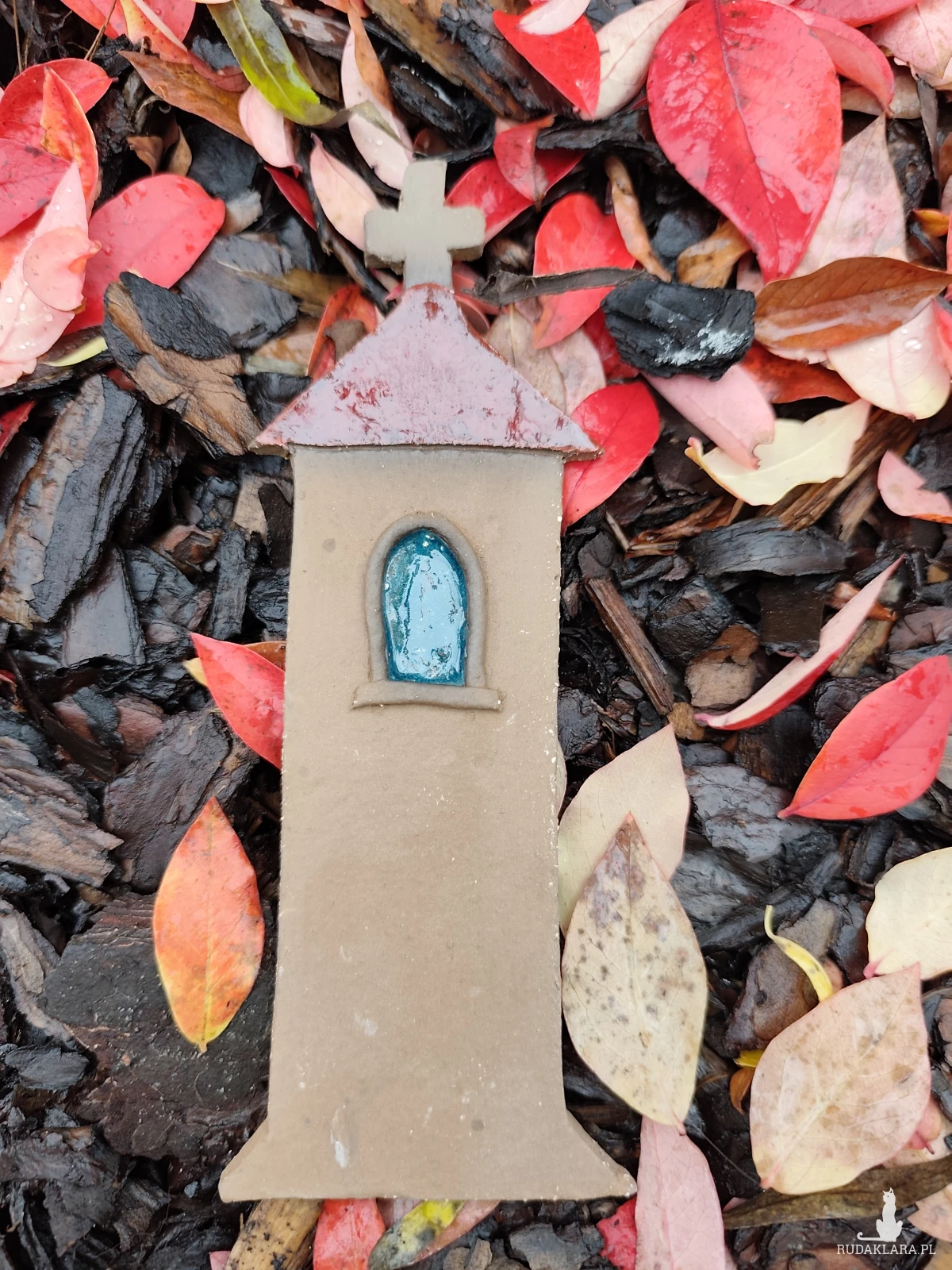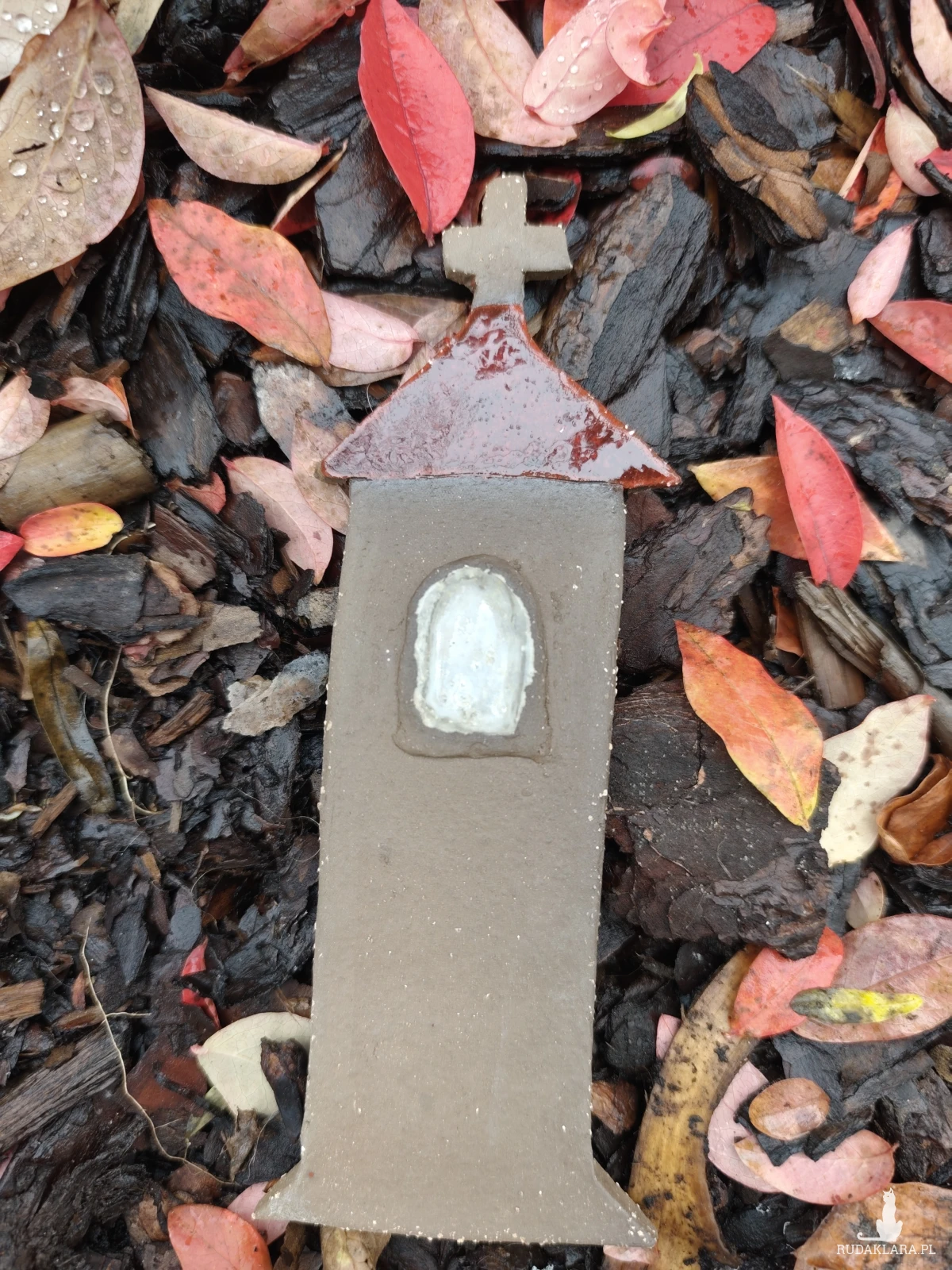 Kapliczka ceramiczna wykonana ręcznie szkliwiona i dwukrotnie wypalana w piecu ceramicznym na wysoką temperaturę. Wysokość 19 cm. Polecam można powiesić na ścianie lub drzewie.