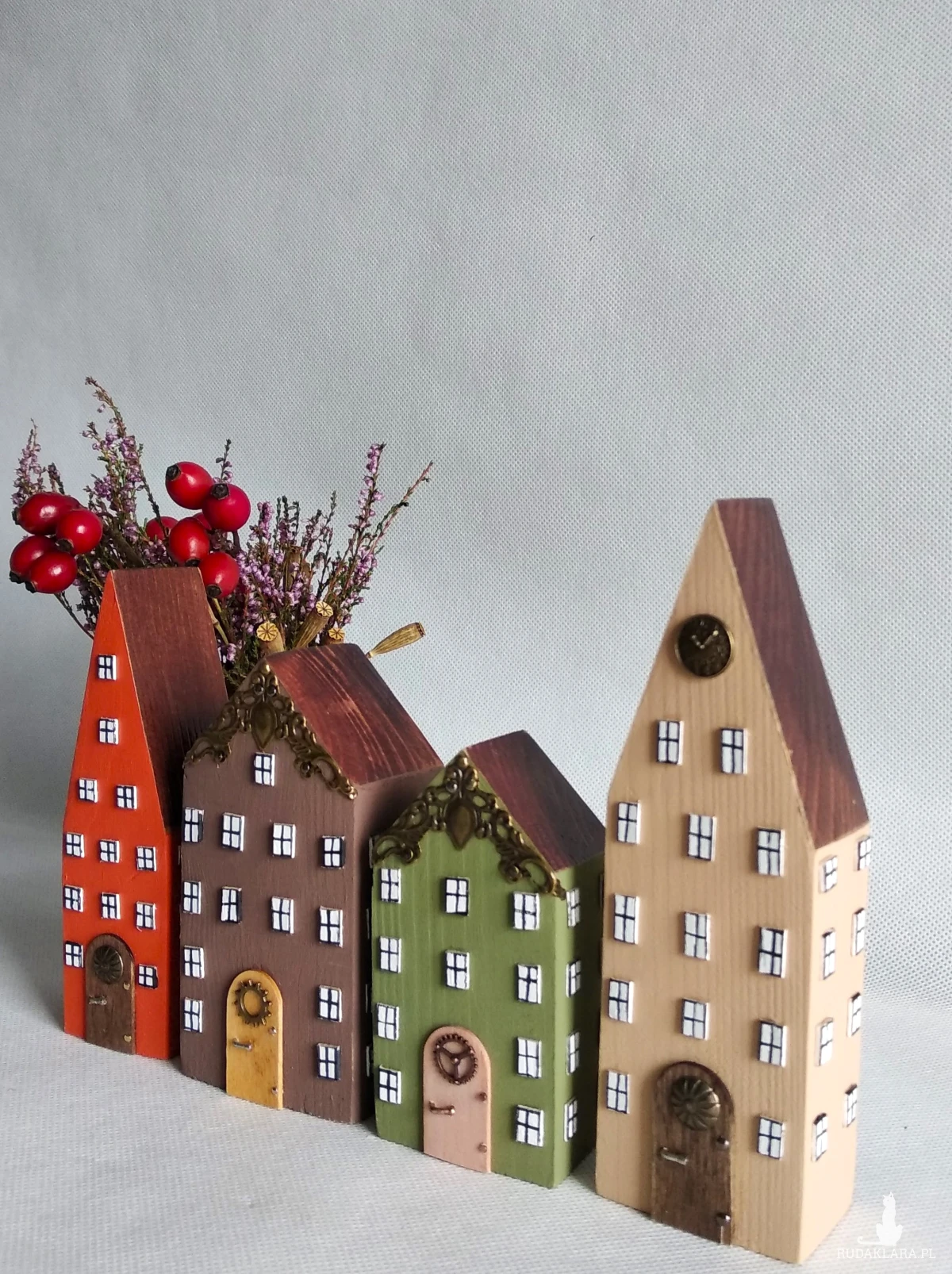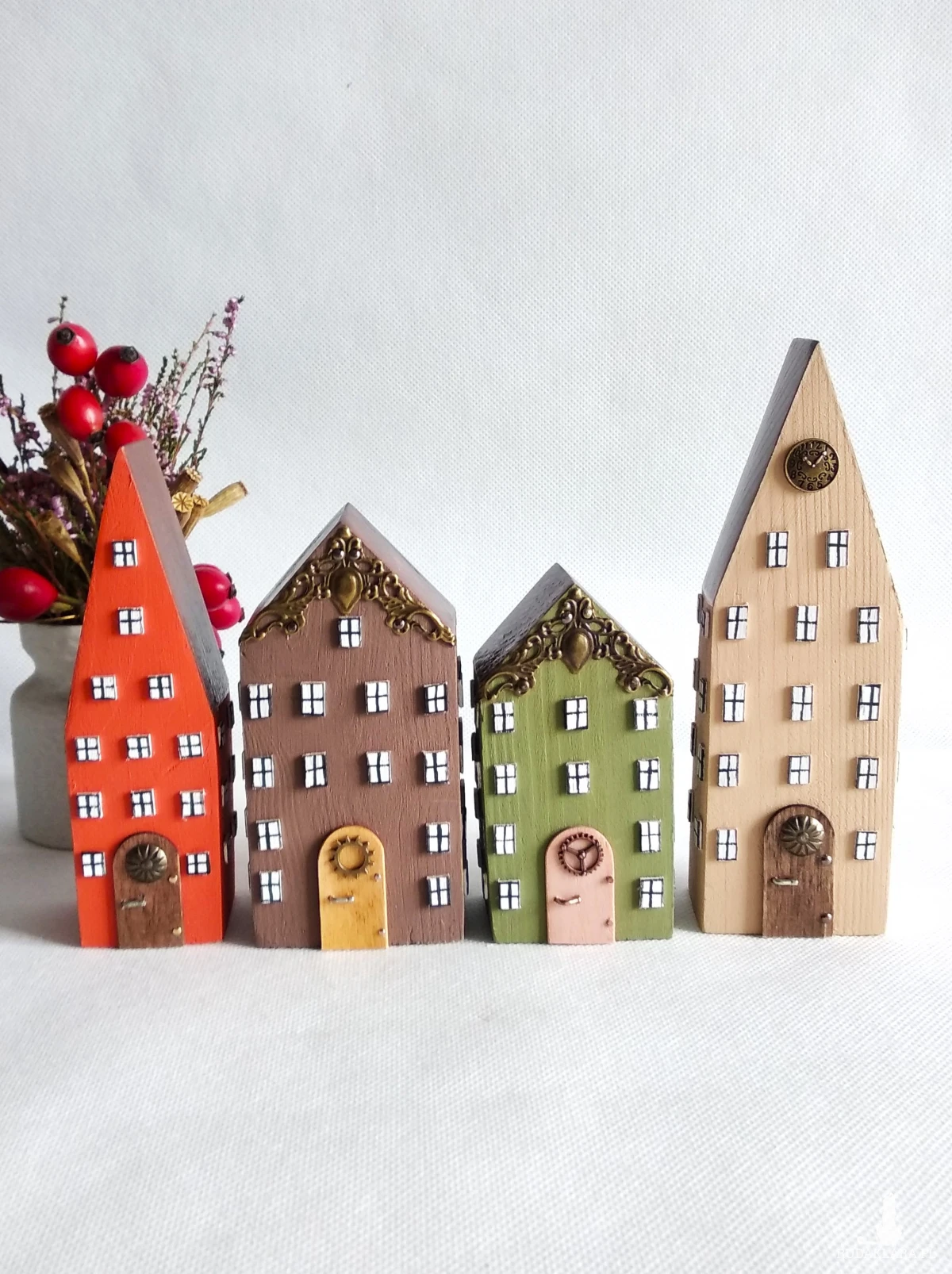 W samym sercu jesieni, gdy świat zwalnia tempo, a powietrze pachnie drewnem i liśćmi, rodzi się Jesienne Miasteczko, cztery drewniane domki, każdy w innym odcieniu tej pięknej pory roku. Razem tworzą harmonijną całość, która wnosi do wnętrza ciszę jesiennego dnia i nutkę nostalgii. Postaw je na parapecie, komodzie lub stole, by codziennie przypominały o tym, że jesień to czas zatrzymania, ciepła i prostych radości.