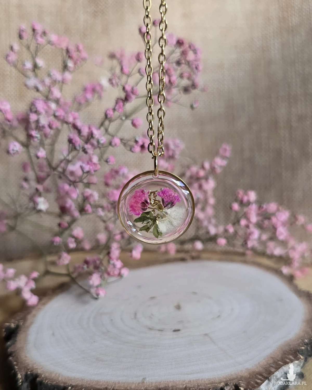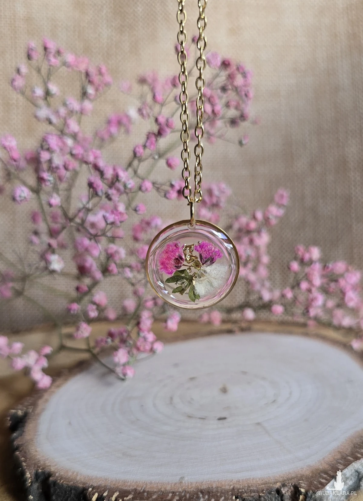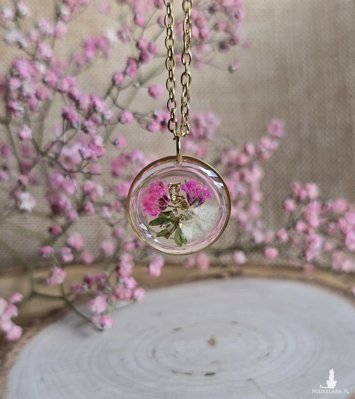 Oferuję Państwu unikalną biżuterię. Zawieszka jest wykonana z suszonych kwiatów i żywicy epoksydowej. Biżuteria jest wspaniałym i oryginalnym prezentem na lata.