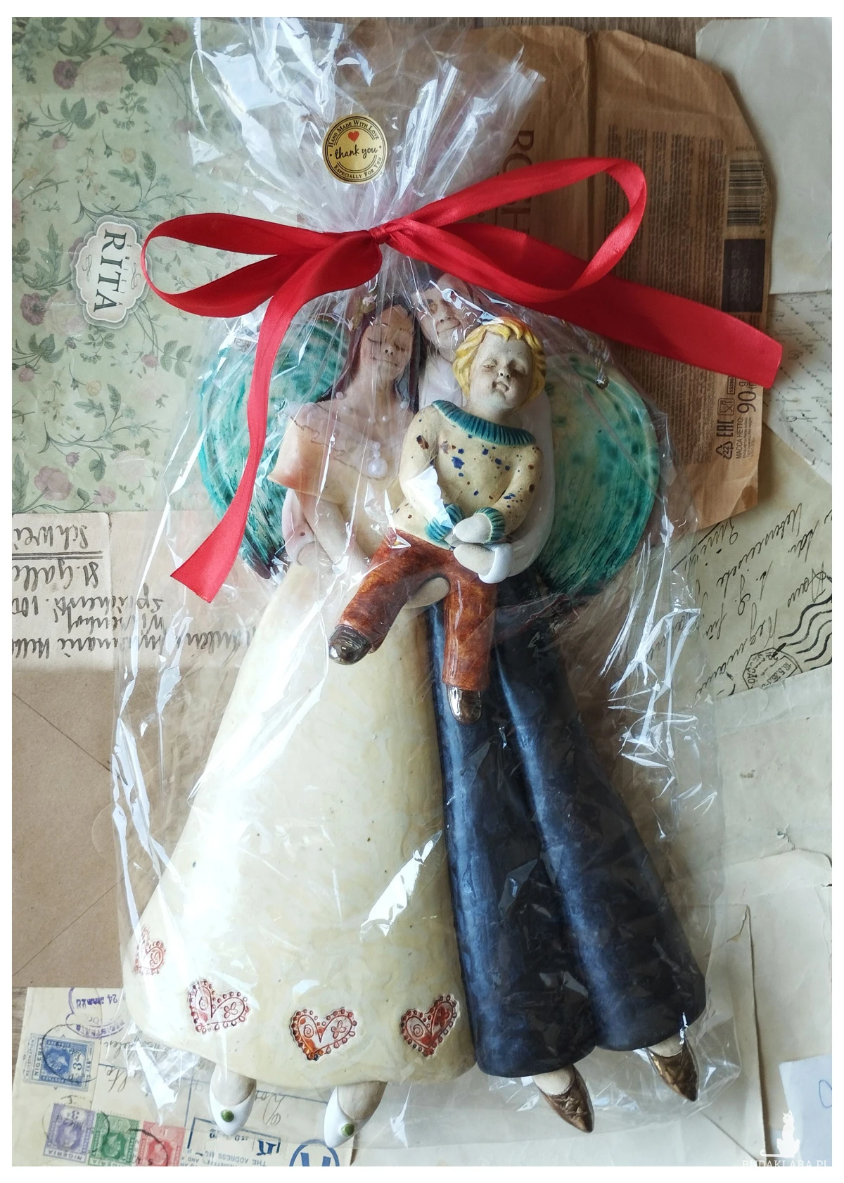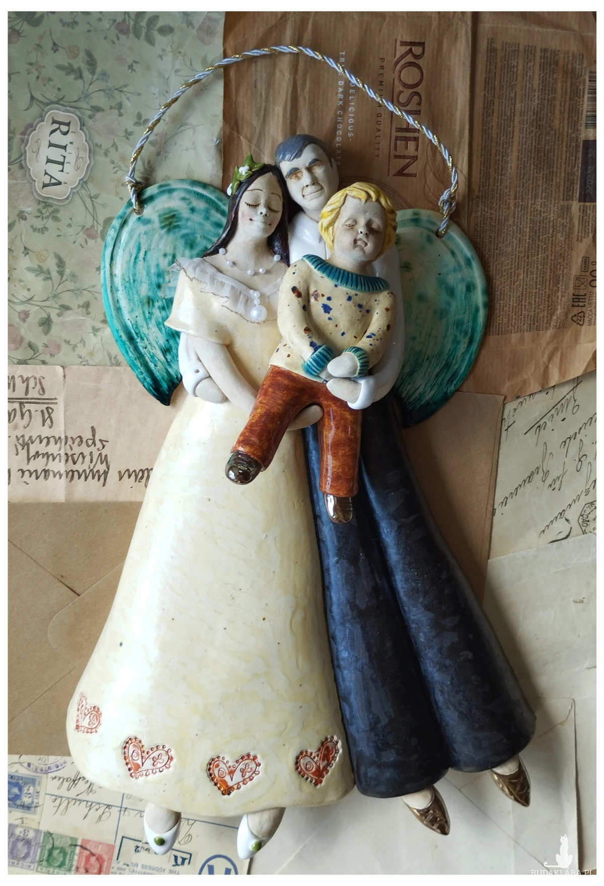 Ceramiczna para anielska z dzieckiem, wypalona biskwit, szkliwiona, wysokość figurek ok 33 cm. Nietypowy i gustowny prezent z okazji ślubu. Gorąco polecam!!! Wymiary ok 24 x 37 cm. Czas oczekiwania na realizację ok 3 tygodni, a w czasie wzmożonej sprzedaży lub przy większych zamówieniach do 30 dni roboczych.