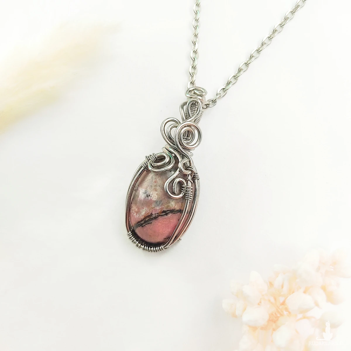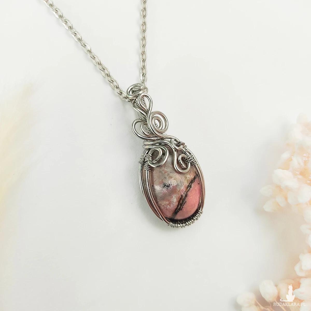 Naszyjnik Rodonit ręcznie robiony. Wykonany techniką wire wrapping z drutów ze stali chirurgicznej.