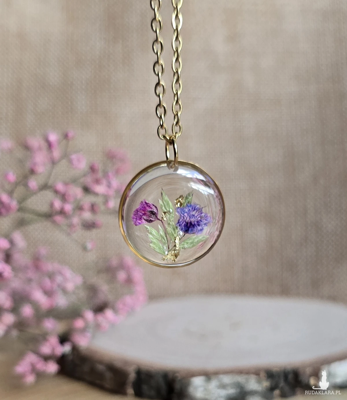 Oferuję Państwu unikalną biżuterię. Zawieszka jest wykonana z suszonych kwiatów i żywicy epoksydowej. Biżuteria jest wspaniałym i oryginalnym prezentem na lata.