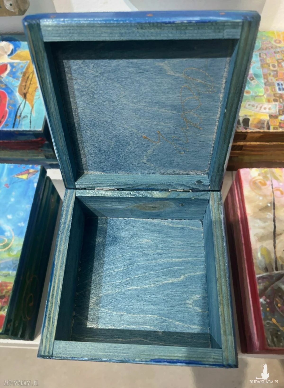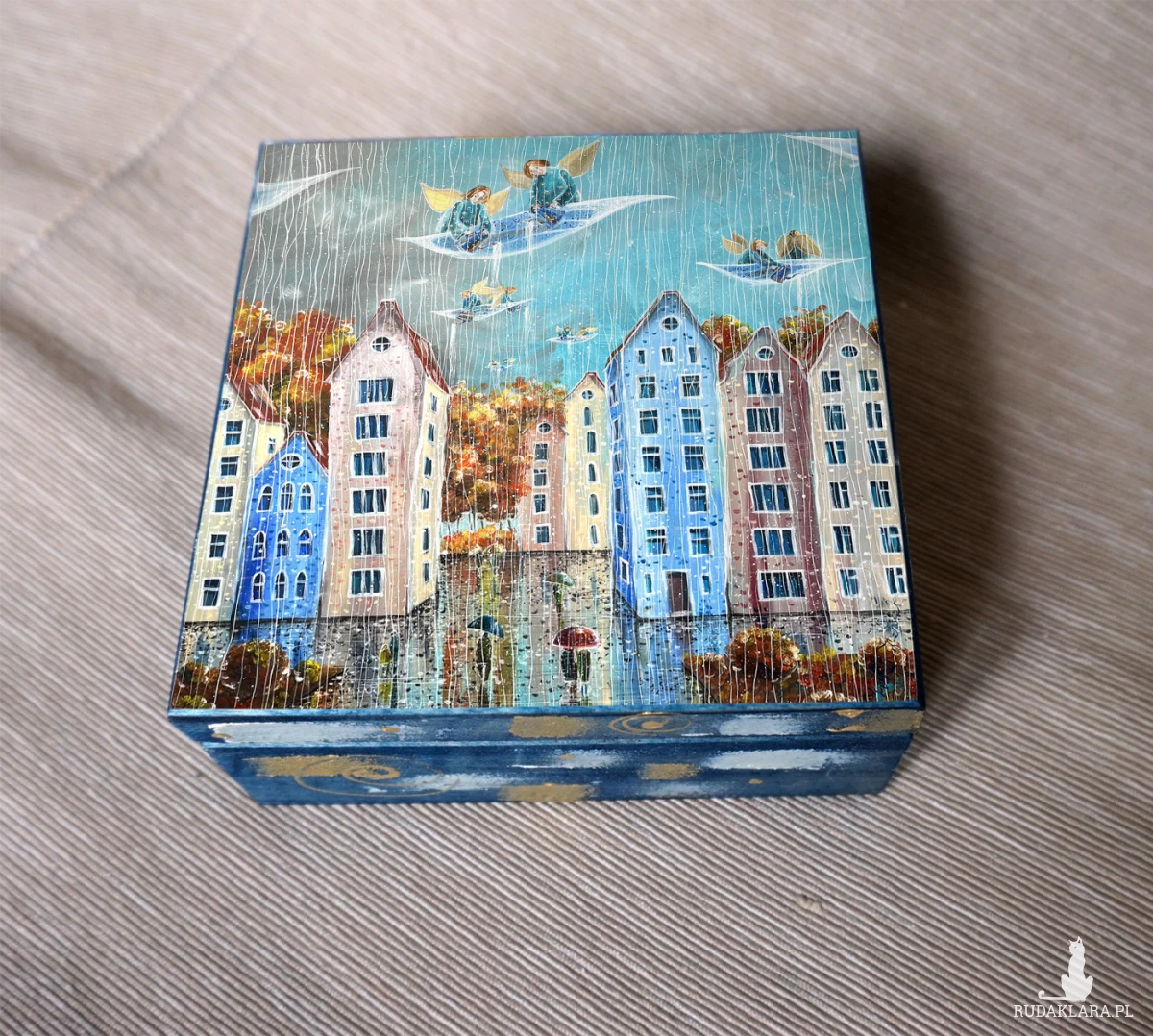 Drewniane pudełko na różności z reprodukcją obrazu autorskiego pt. "Deszczowy dzień". Obraz umieszczony jest metodą decoupage na wierzchniej części szkatułki, boki natomiast malowane są ręcznie. Całość zabezpieczona jest bezbarwnym lakierem oraz sygnowana w środku.