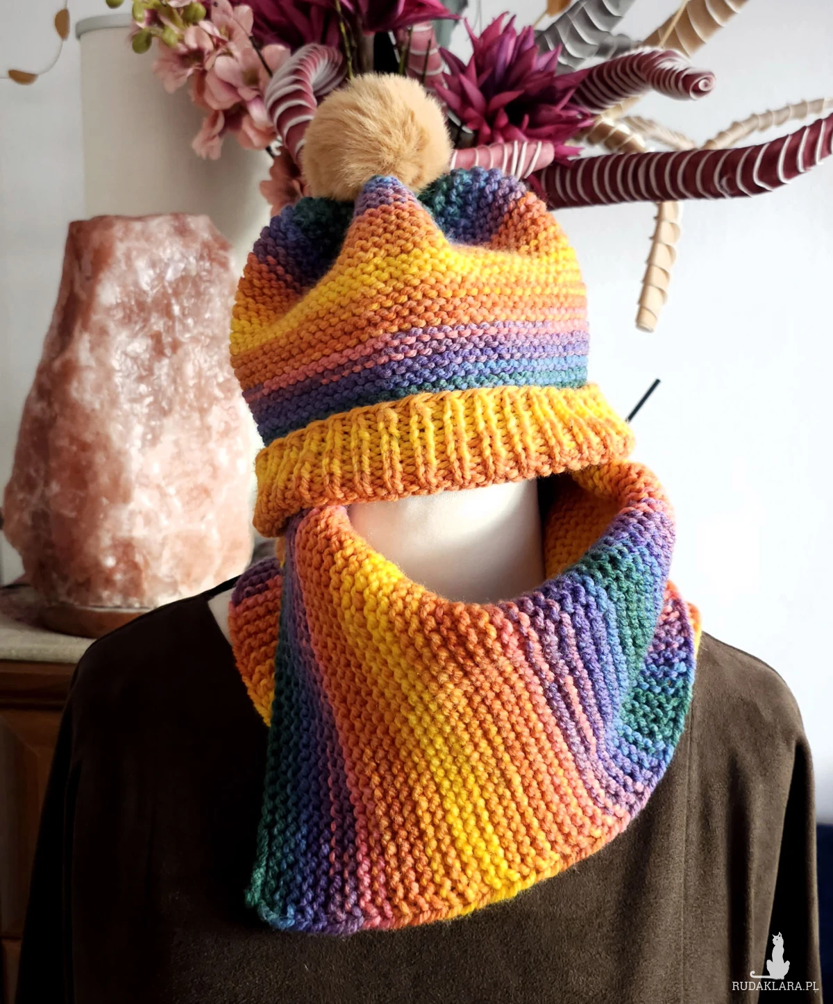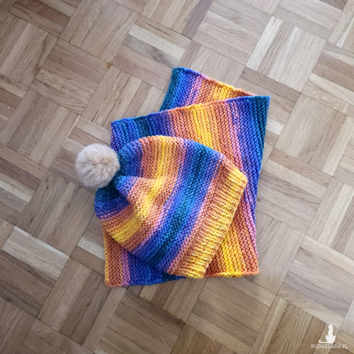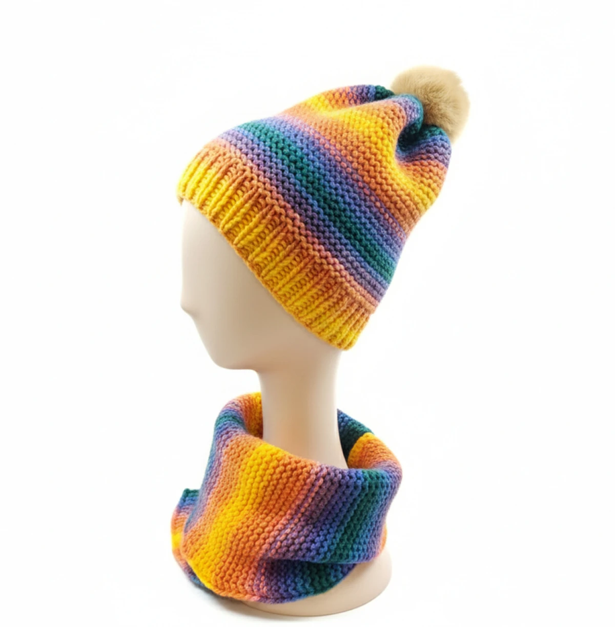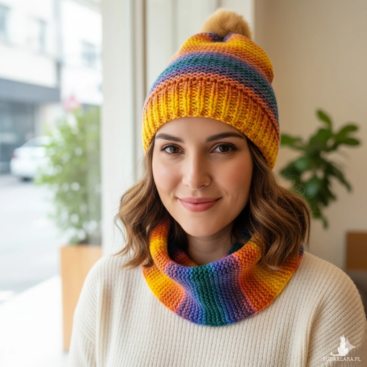 6915 Zimowy Zestaw: Czapka Beanie i Komin w Kolorowe Paski (Zachód Słońca)