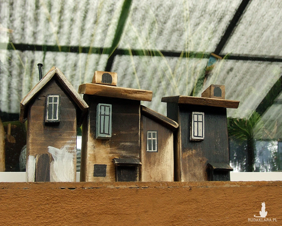 Domki są wykonane z drewna z odzysku - drewno często ma pęknięcia, ślady po gwoździach. Całość jest lekko szlifowana - drewno zachowuje swoją fakturę i jest lekko szorstkie w dotyku. Malowane są farbami akrylowymi i zabezpieczone matowym lakierem akrylowym, są to media wodoodporne i nietoksyczne).