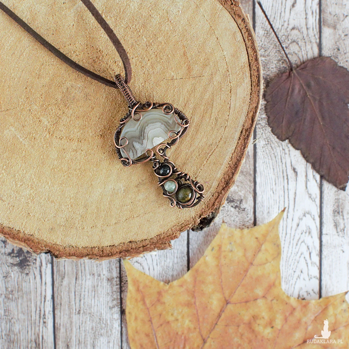 Wyjątkowy wisiorek ręcznie wykonany z użyciem agatu, turkusu afrykańskiego i naturalnej miedzi.