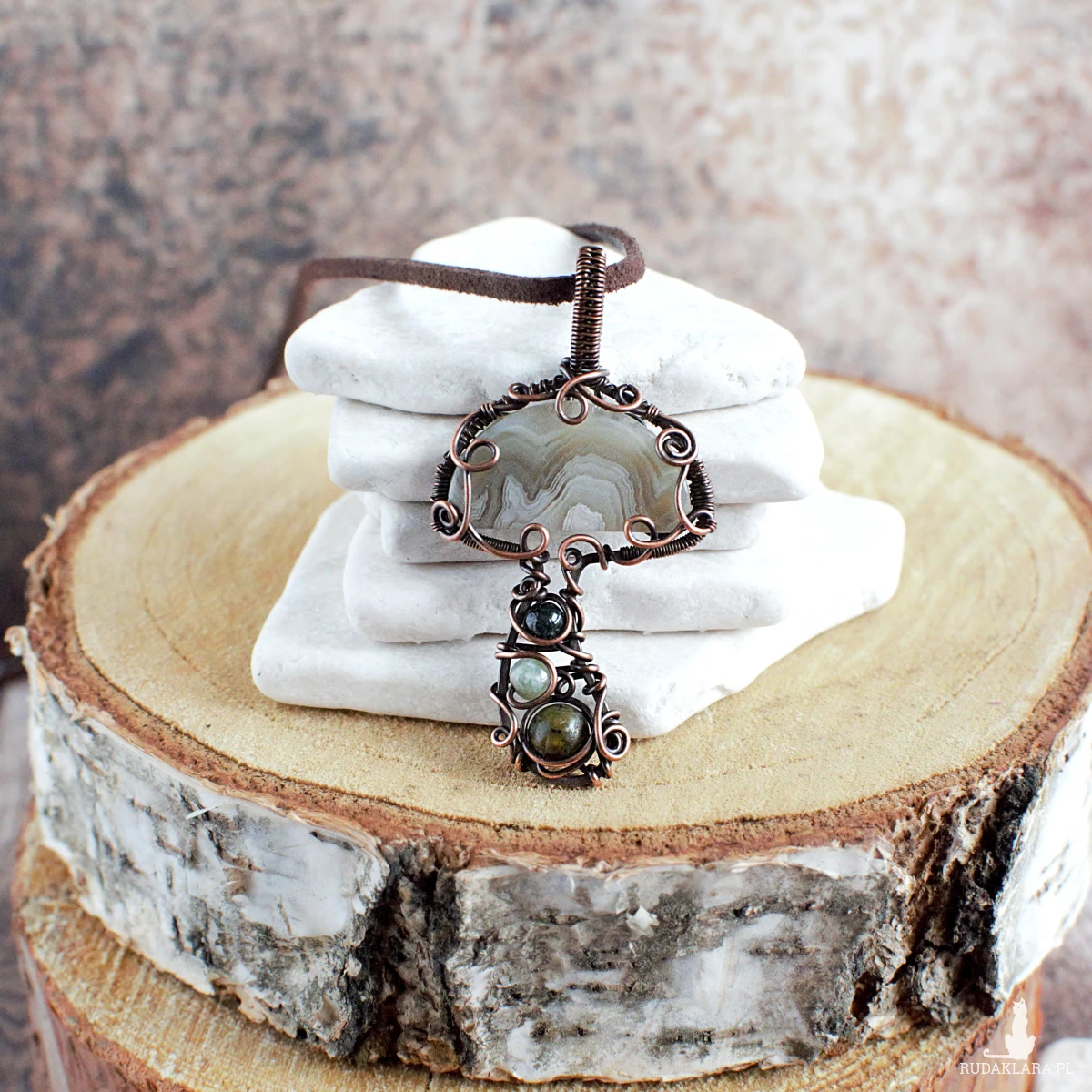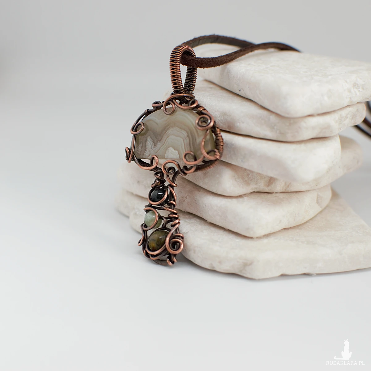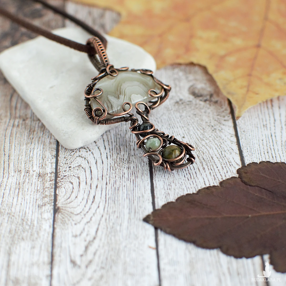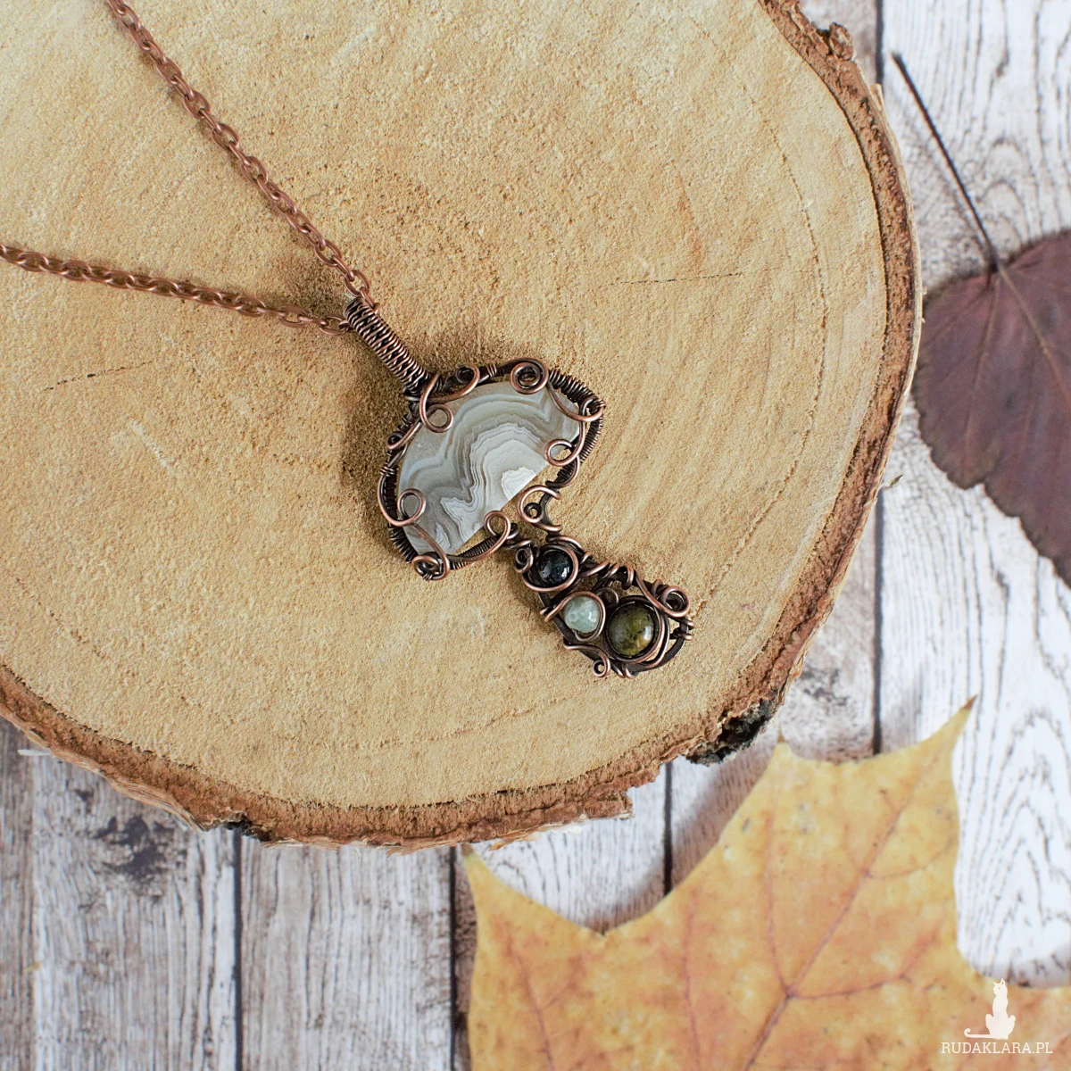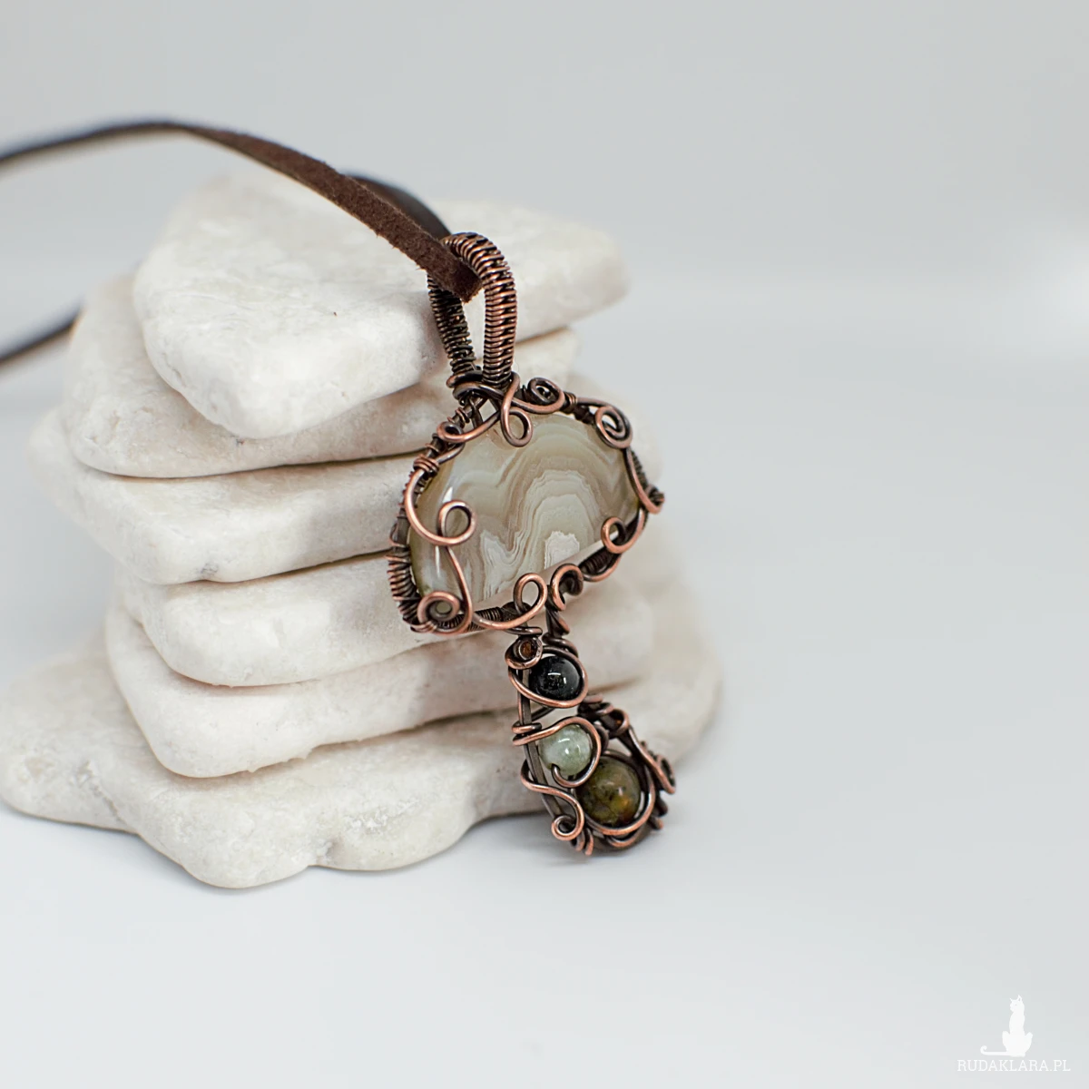 Materiały użyte: drut jubilerski miedziany, agat koronkowy, agat mszysty, turkus afrykański.