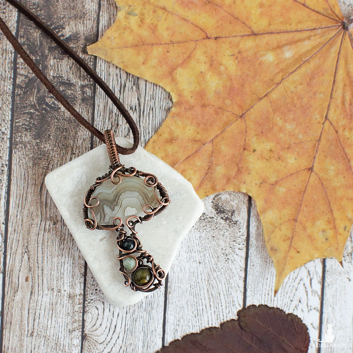 Pomysłowa oprawa w kształcie grzybka sprawia, że jest to idealna biżuteria na jesień. Agat koronkowy tworzący "kapelusz" oraz agaty mszyste i turkus afrykański w "nóżce" cieszą oko stonowanym zestawieniem kolorów idealnym na tę porę roku.