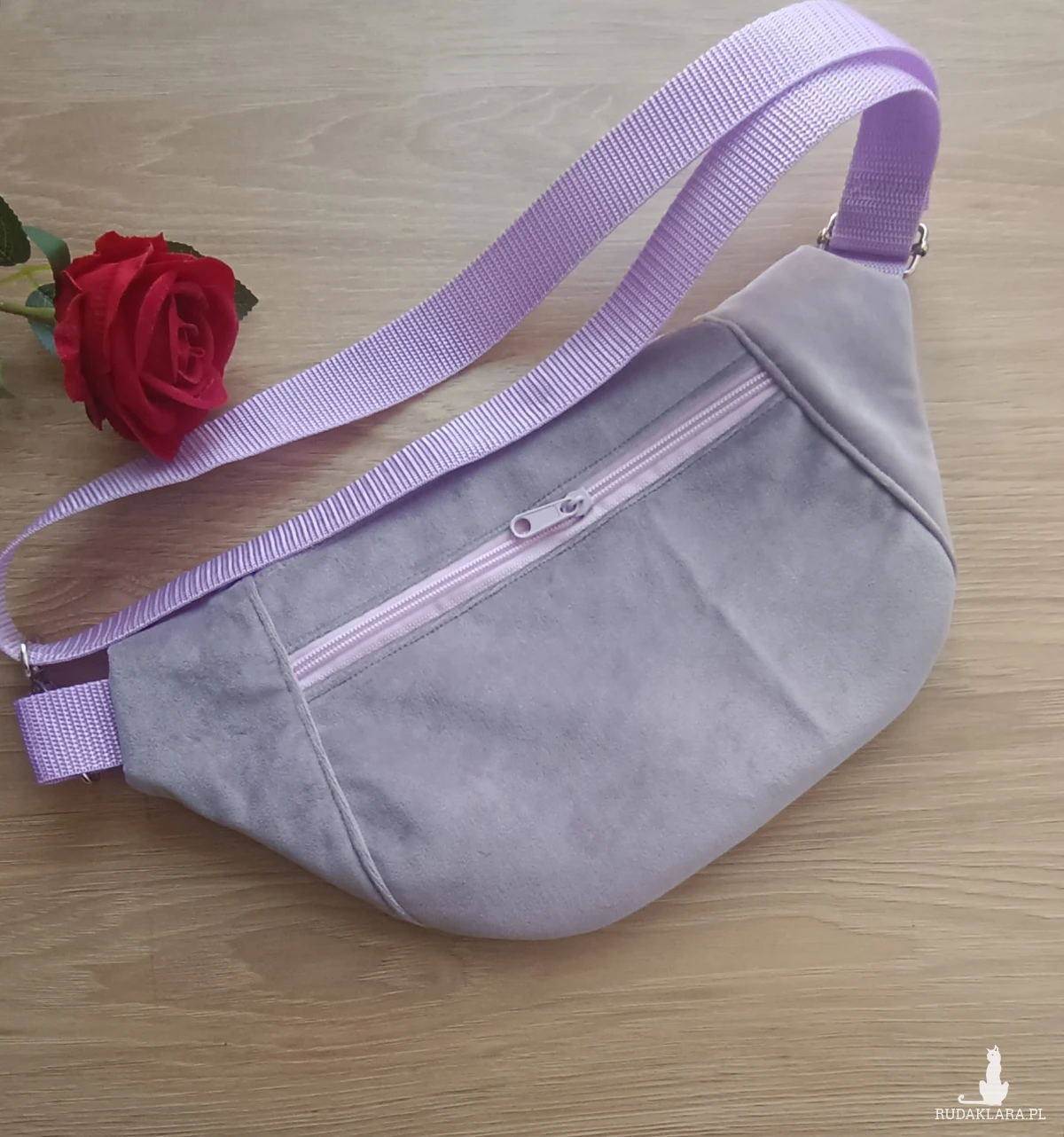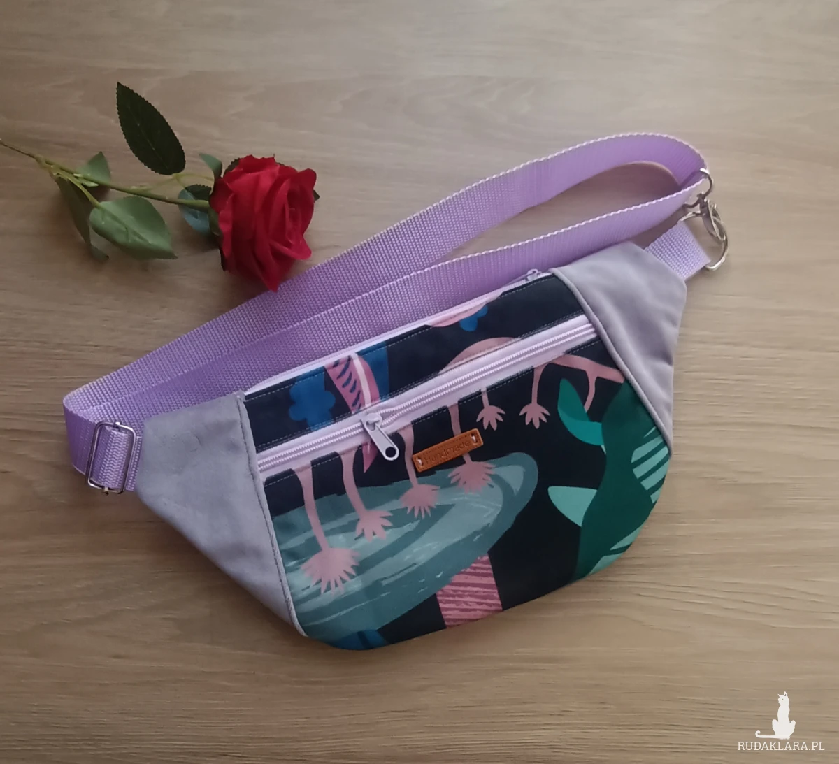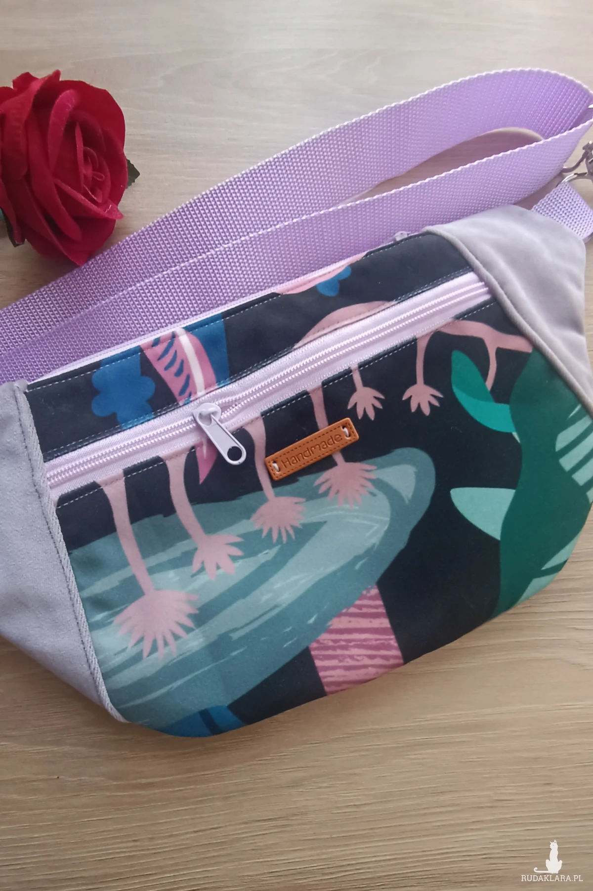 W środku znajduje się bawełniana podszewka. Całość uzupełnia jasnofioletowy suwak i pasek w tym samym kolorze, świetnie komponujące się z printem. Pasek jest regulowany, odpinany na karabińczyki, o maksymalnej długości ok. 88 cm.